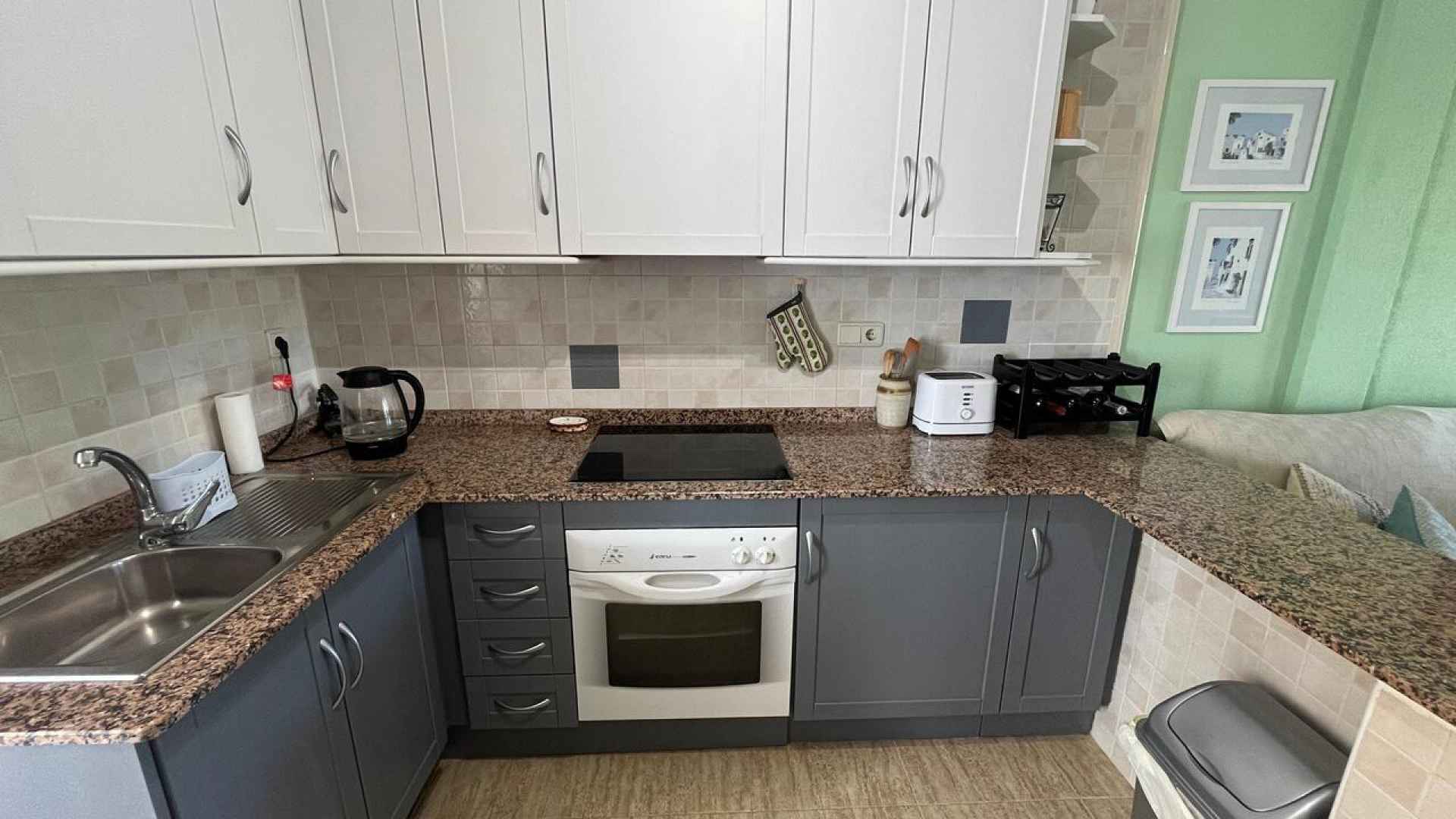 Inside, the bungalow offers a bright and welcoming living space, a fully fitted open plan kitchen with door leading out to the rear terrace where you will find stairs up to the solarium., plus two comfortable bedrooms with fitted wardrobes and a family bathroom.