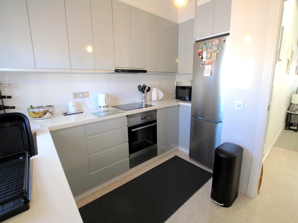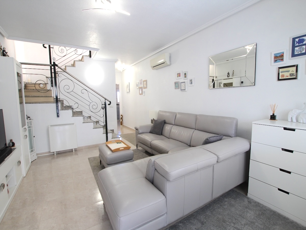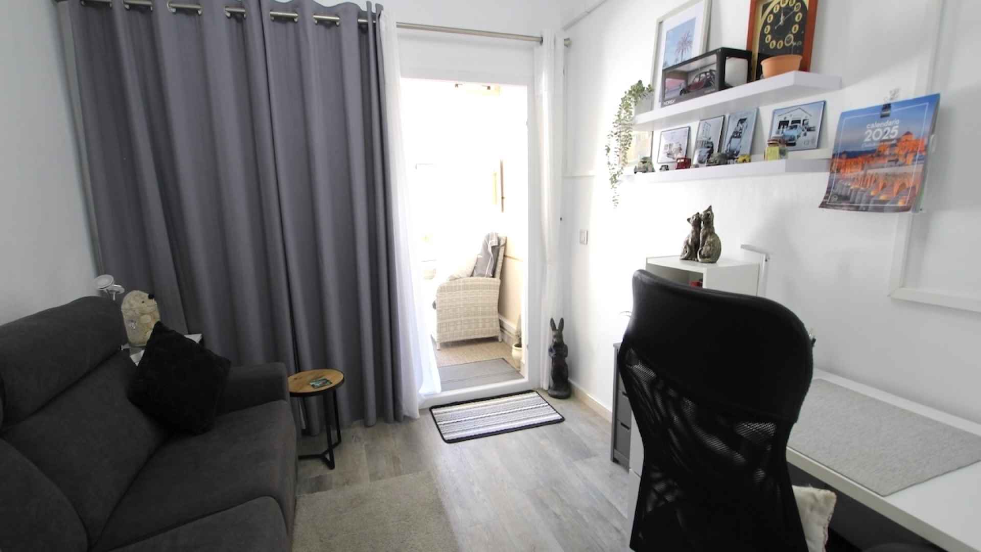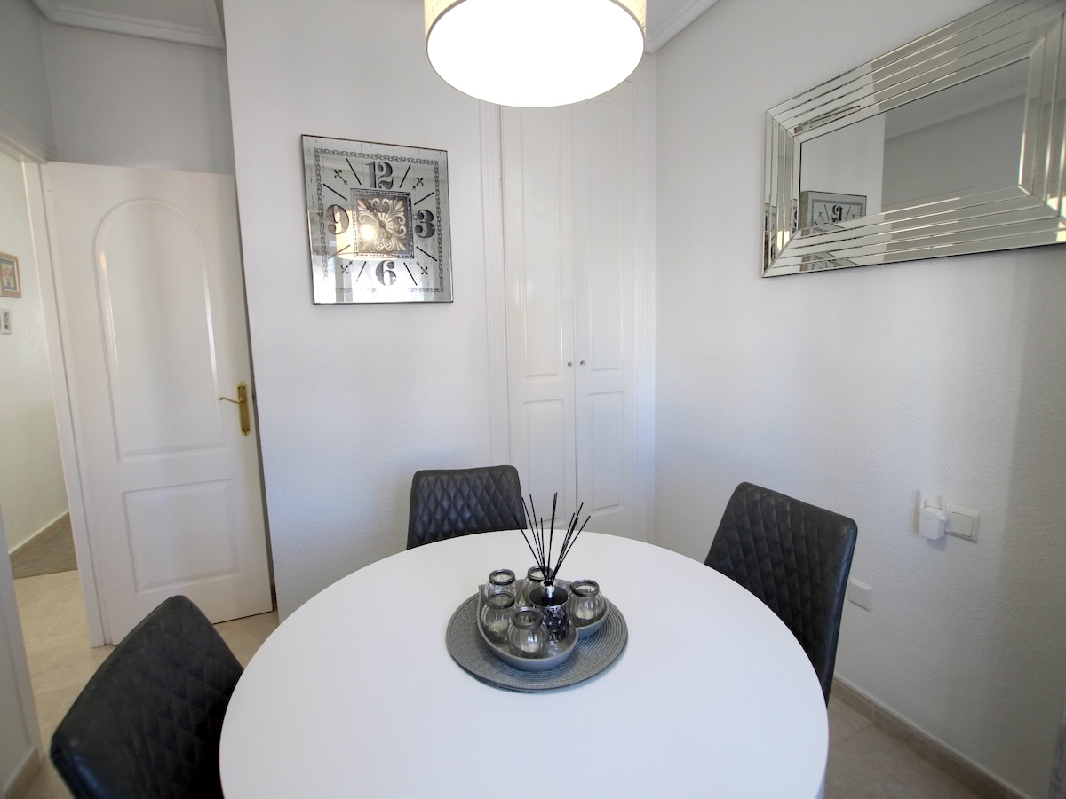 This popular style of property offers two levels of accommodation with the ground floor comprising of; a large East-facing glazed patio provides the ideal spot for morning coffee, a spacious, bright and airy lounge-diner featuring elegant décor, one double bedroom with fitted wardrobes (currently used as a formal dining room), a modern shower room, plus a designer fitted kitchen with ample workspace and storage, and a door leading out to the rear of the property which opens directly onto the communal pool and gardens, perfect for entertaining or enjoying the Spanish sunshine.