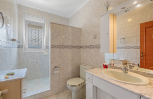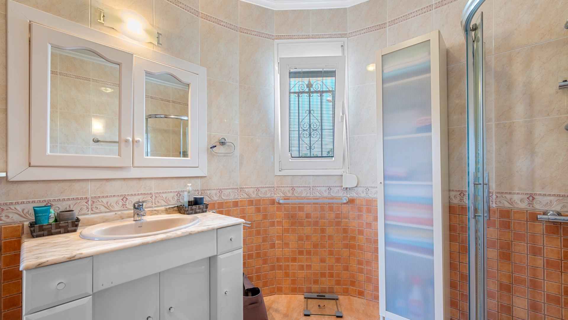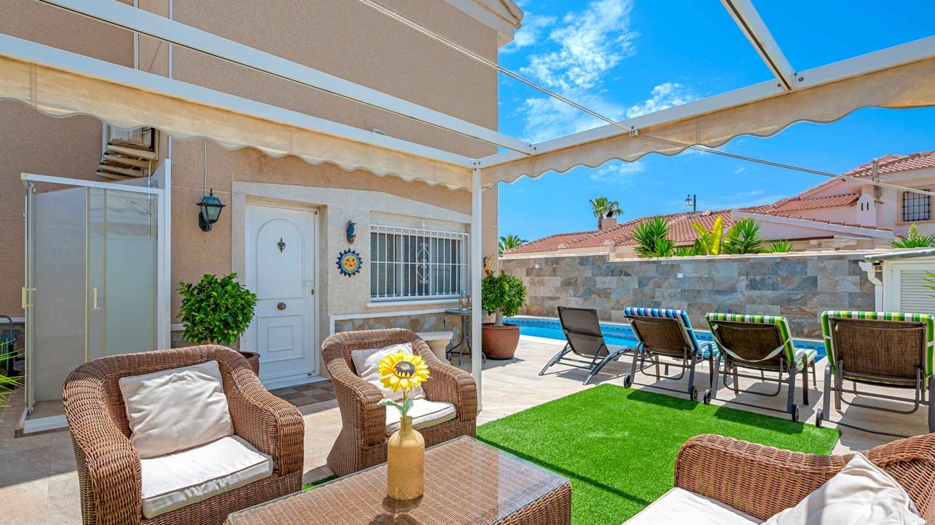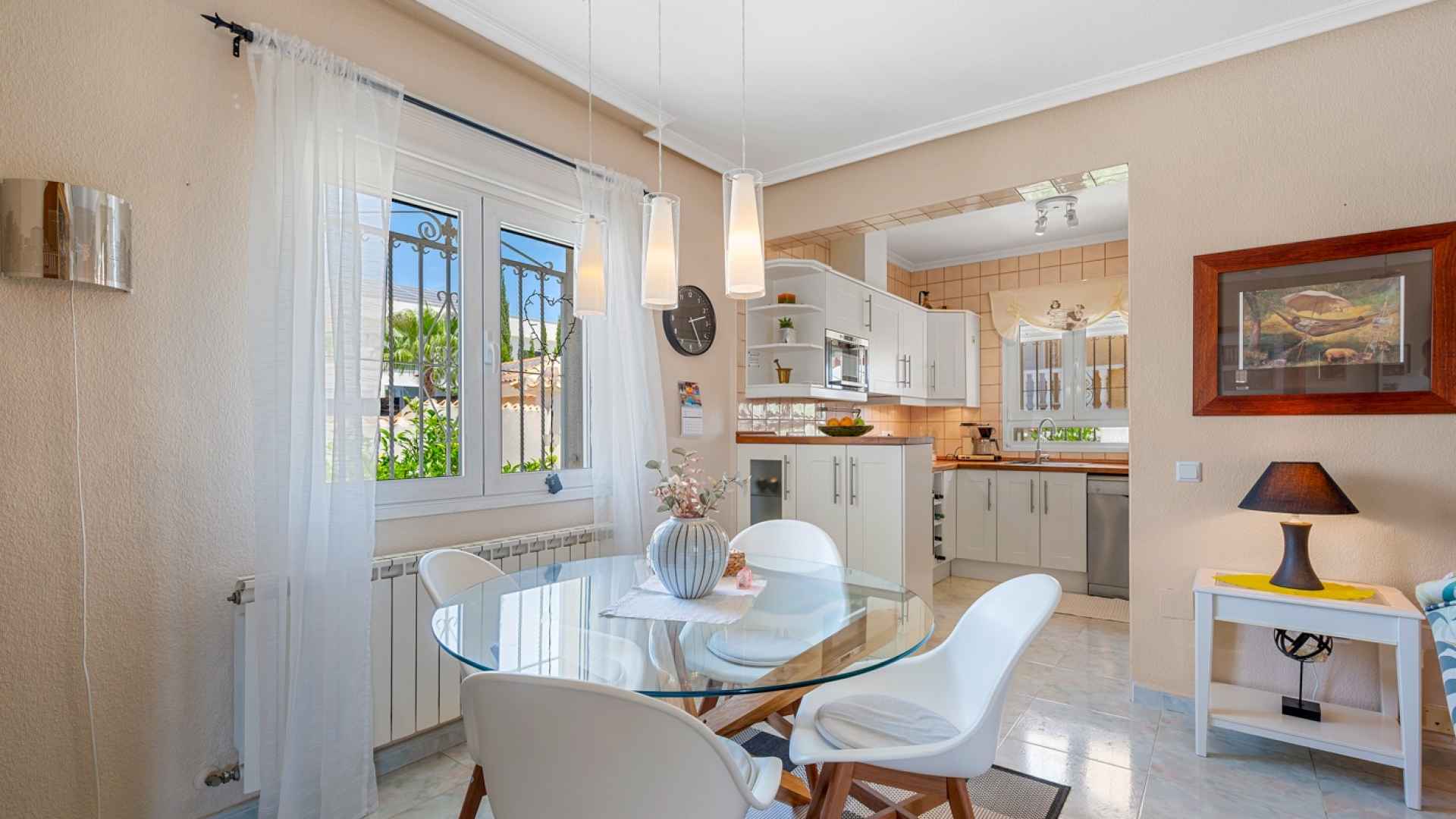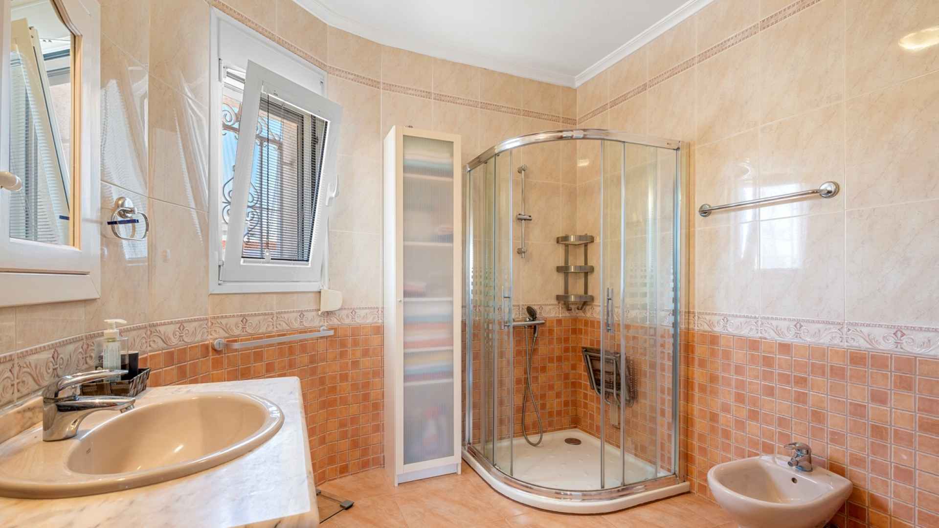 Outside, the villa occupies a generous, South facing plot of 500 m2 which is well maintained, beautifully tiled with a lovely selection of plants. You will also find a very inviting swimming pool (salt water), an outdoor shower, off-road parking along with a carport, a BBQ area, a storage room and several outdoor seating areas, one with a large gazebo offering welcome shade during those hotter months. The garden has automatic irrigation system.