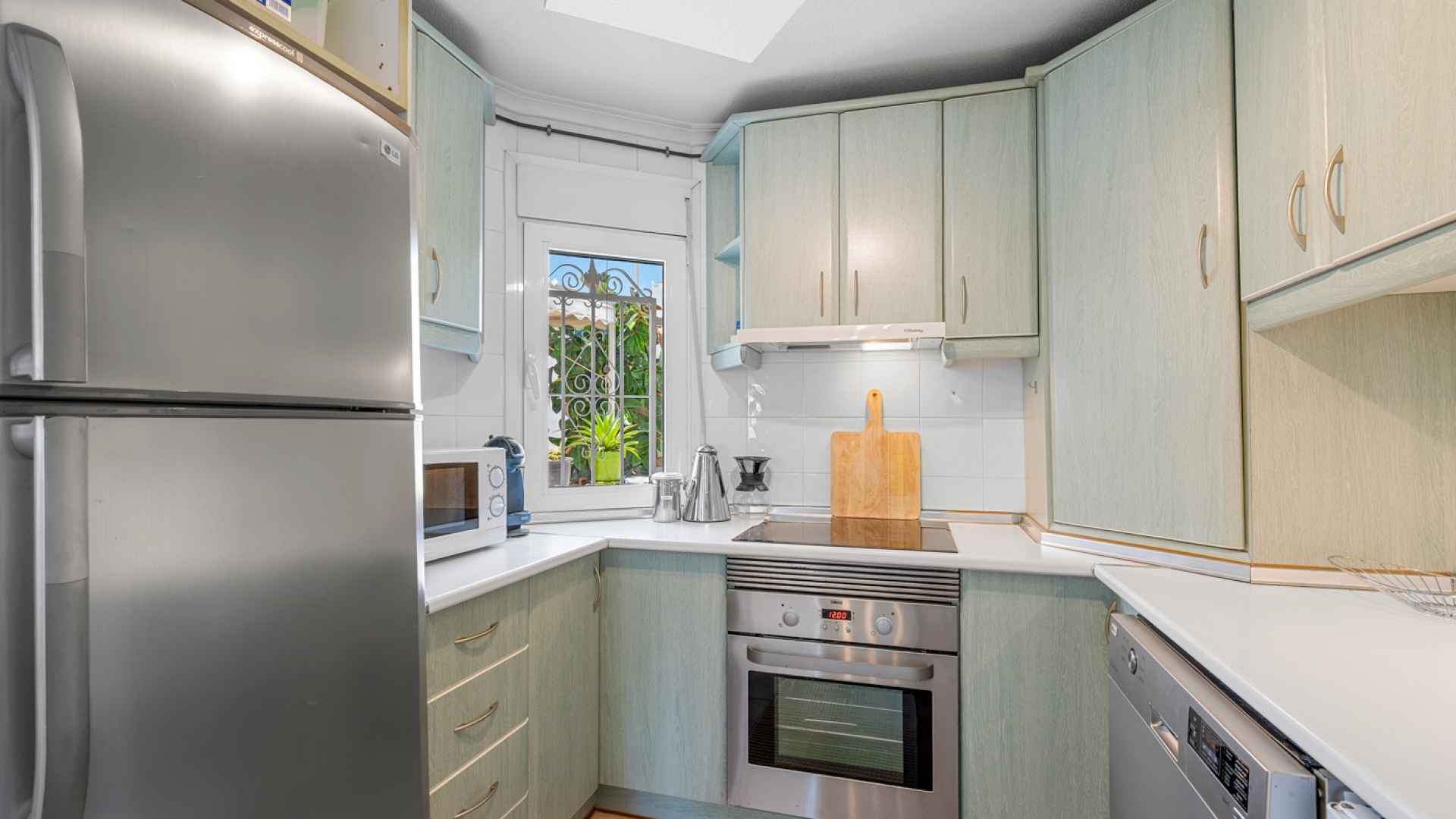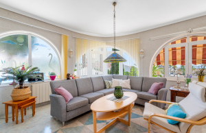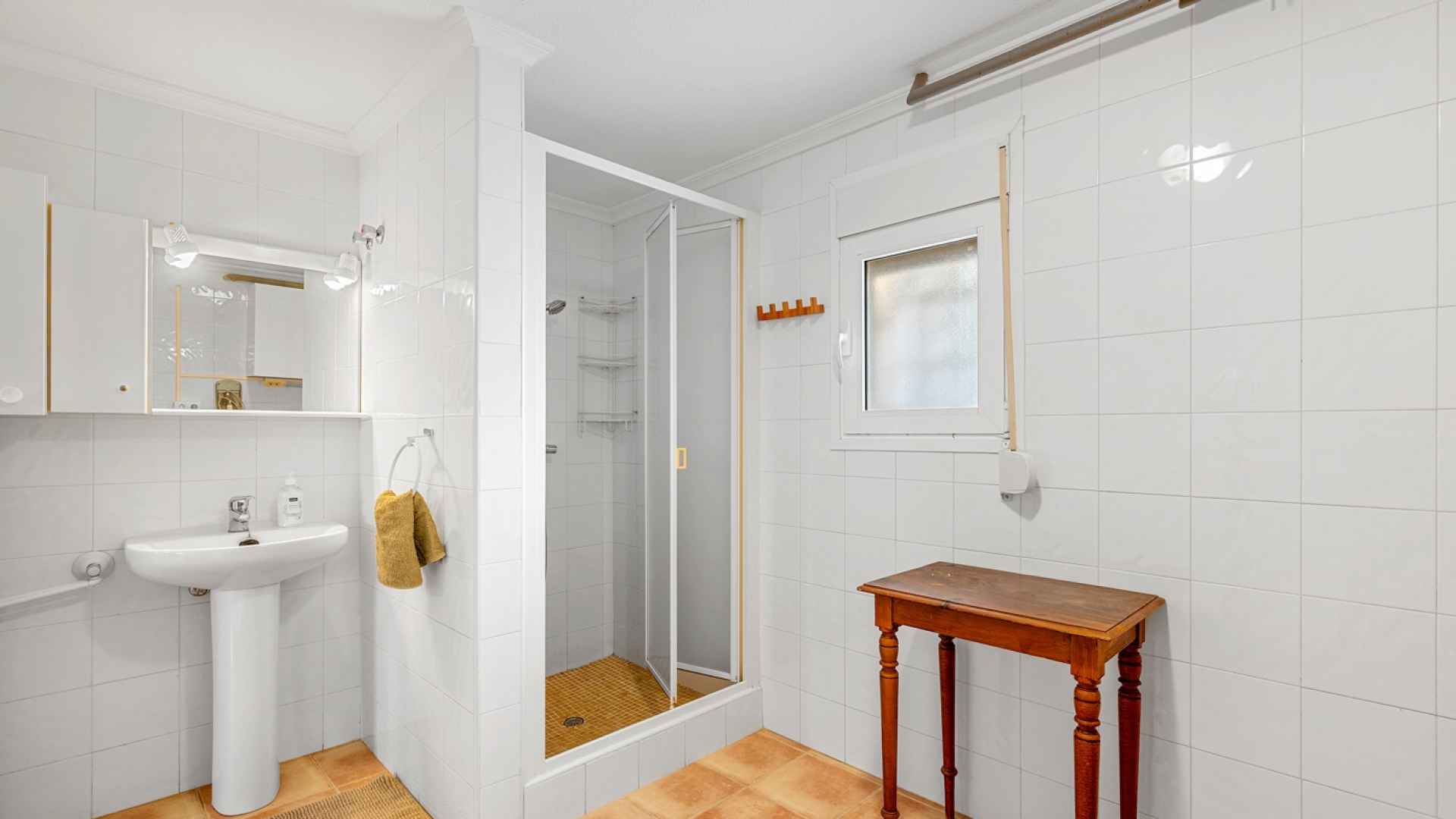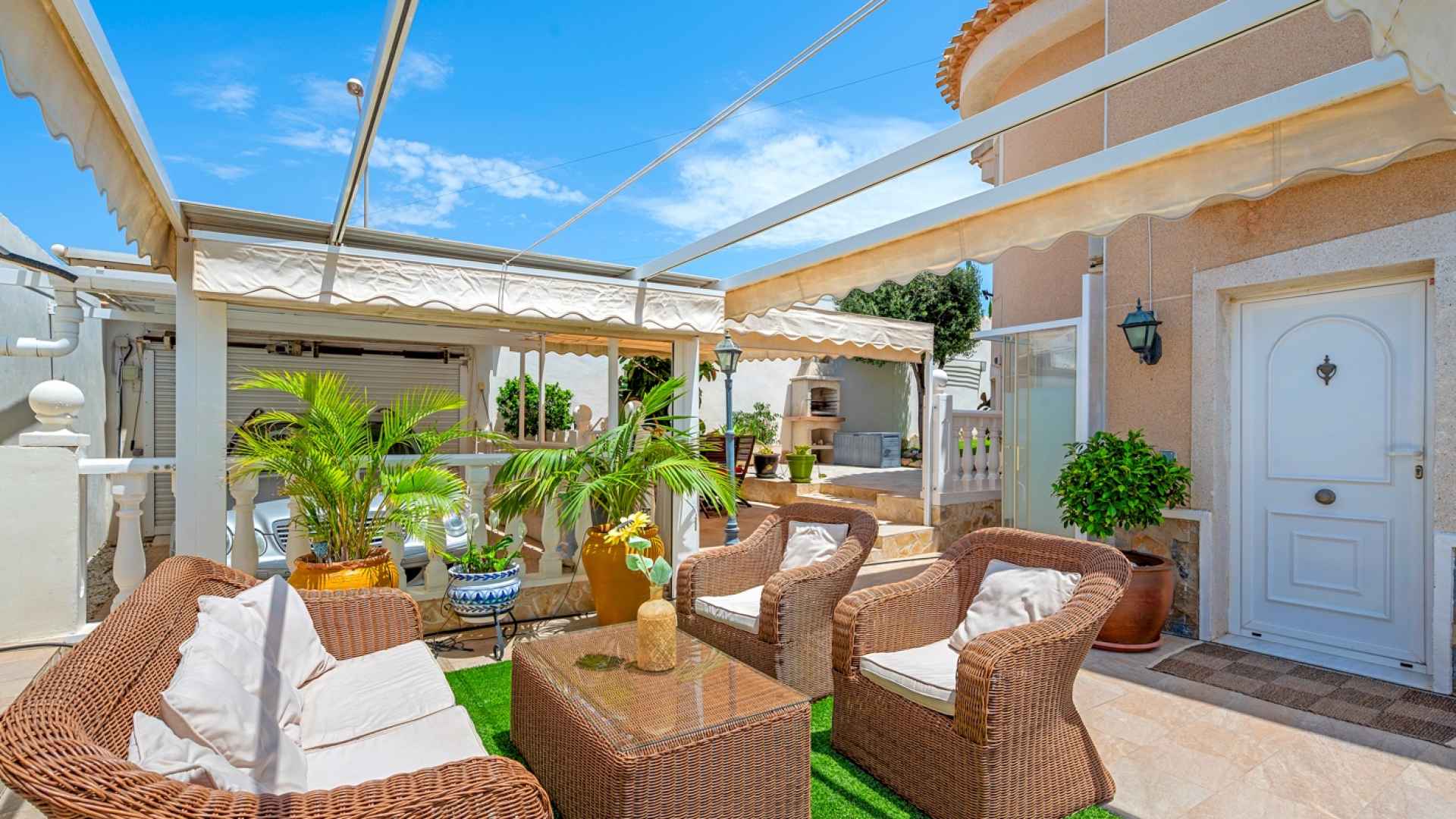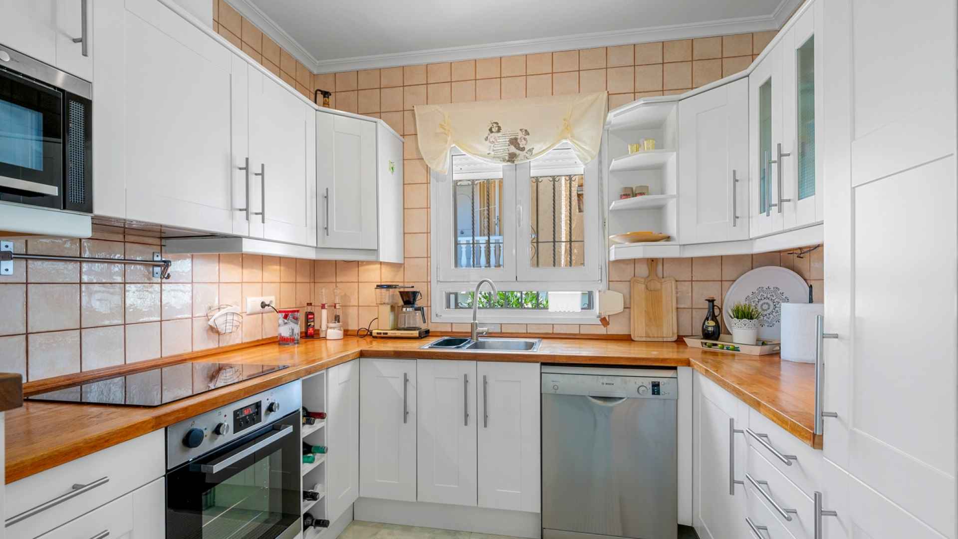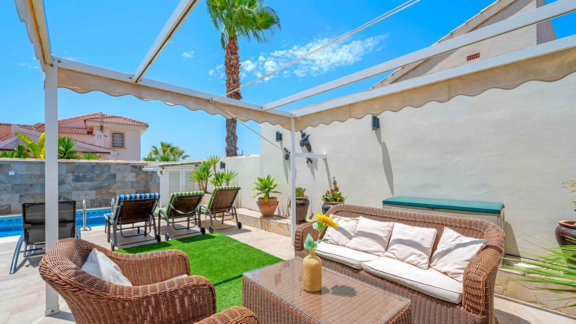 Outside, the villa occupies a generous, South facing plot of 500 m2 which is well maintained, beautifully tiled with a lovely selection of plants. You will also find a very inviting swimming pool (salt water), an outdoor shower, off-road parking along with a carport, a BBQ area, a storage room and several outdoor seating areas, one with a large gazebo offering welcome shade during those hotter months. The garden has automatic irrigation system.