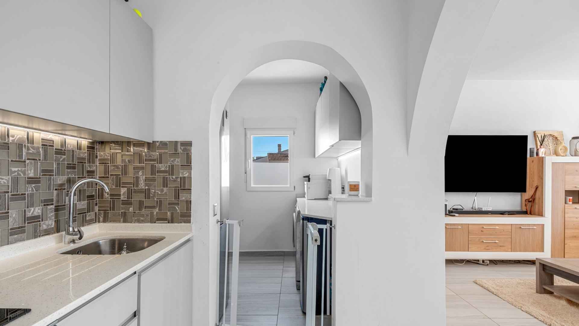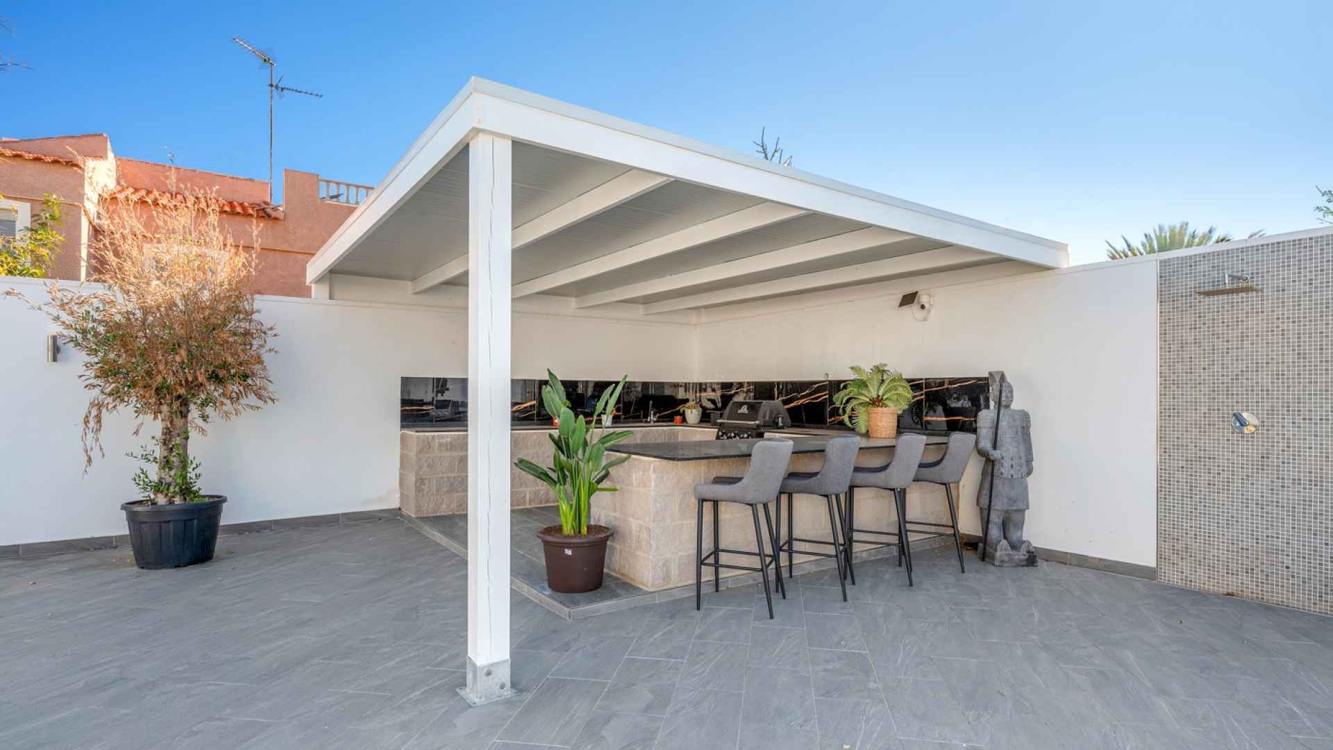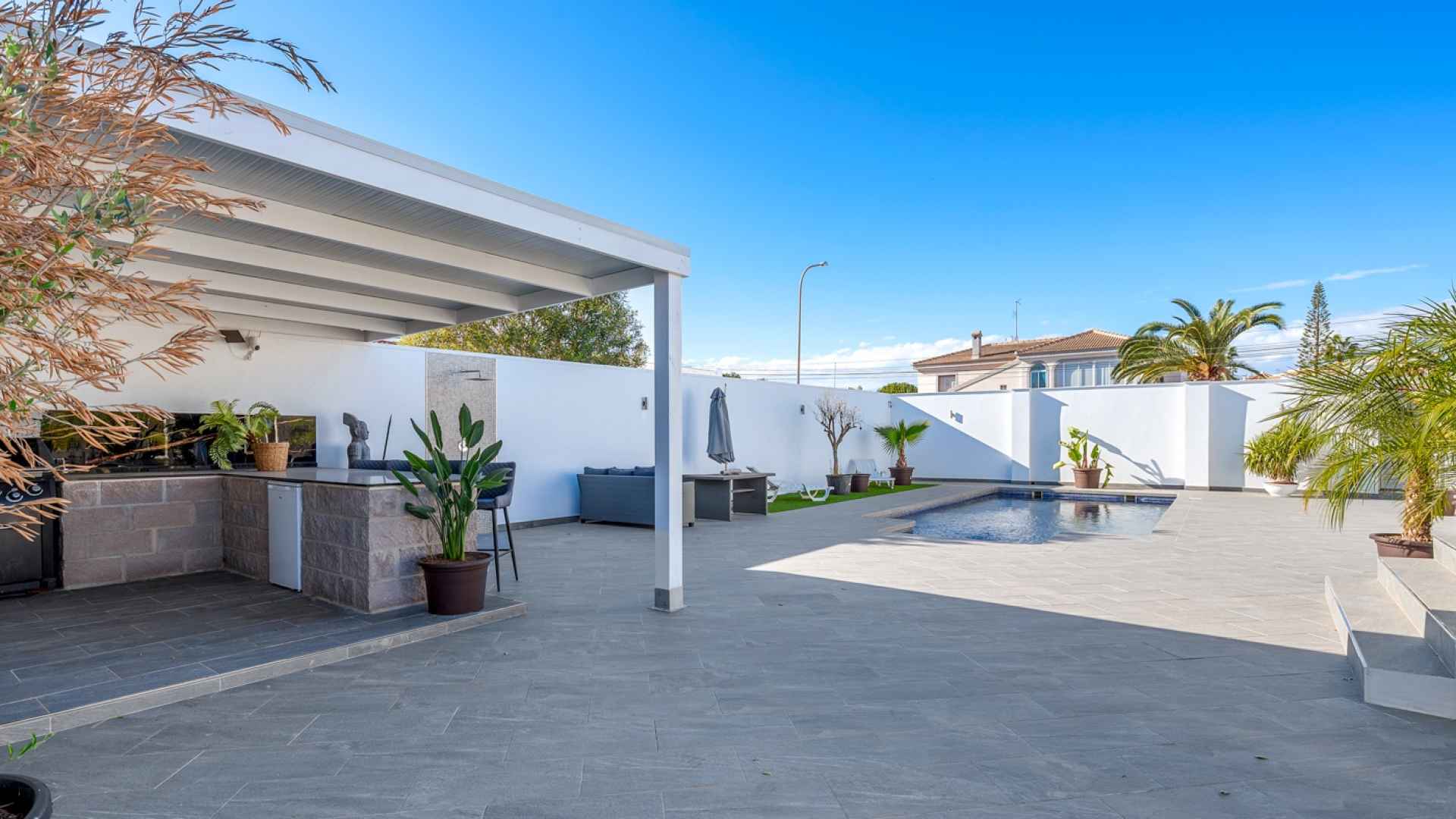 The exterior is designed to make the most of the excellent Costa Blanca climate thanks to a private and very inviting 8x4 metre swimming pool and a fully equipped Summer kitchen, which becomes the perfect place for al fresco meals and gatherings. The South-West orientation allows for all-day sun, and the spacious grounds surrounding the entire house offer ample room for a garden, relaxation areas, or any other project you might wish to develop. Furthermore, the plot has enough space to park two vehicles within its boundaries, ensuring convenience and security.