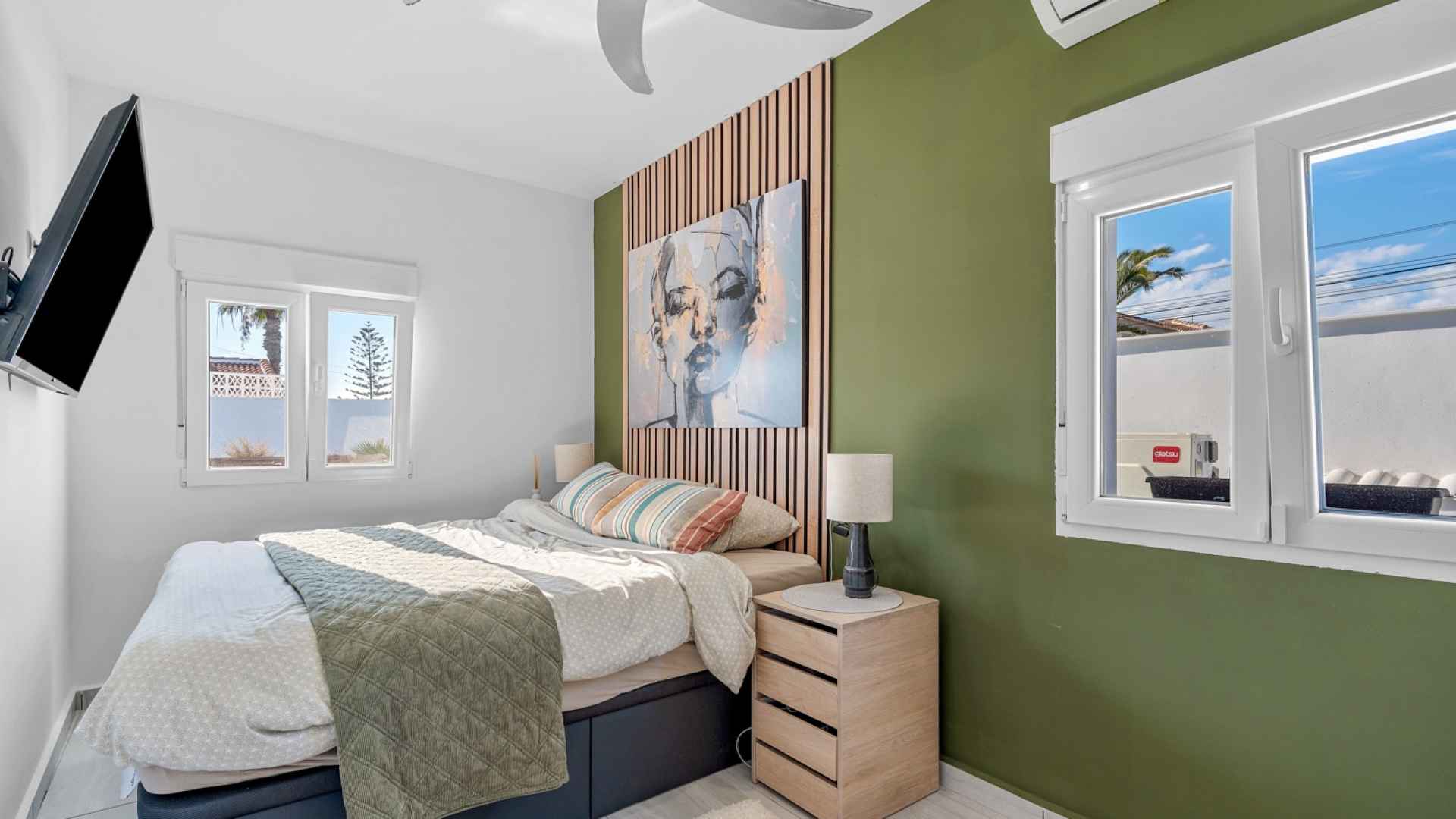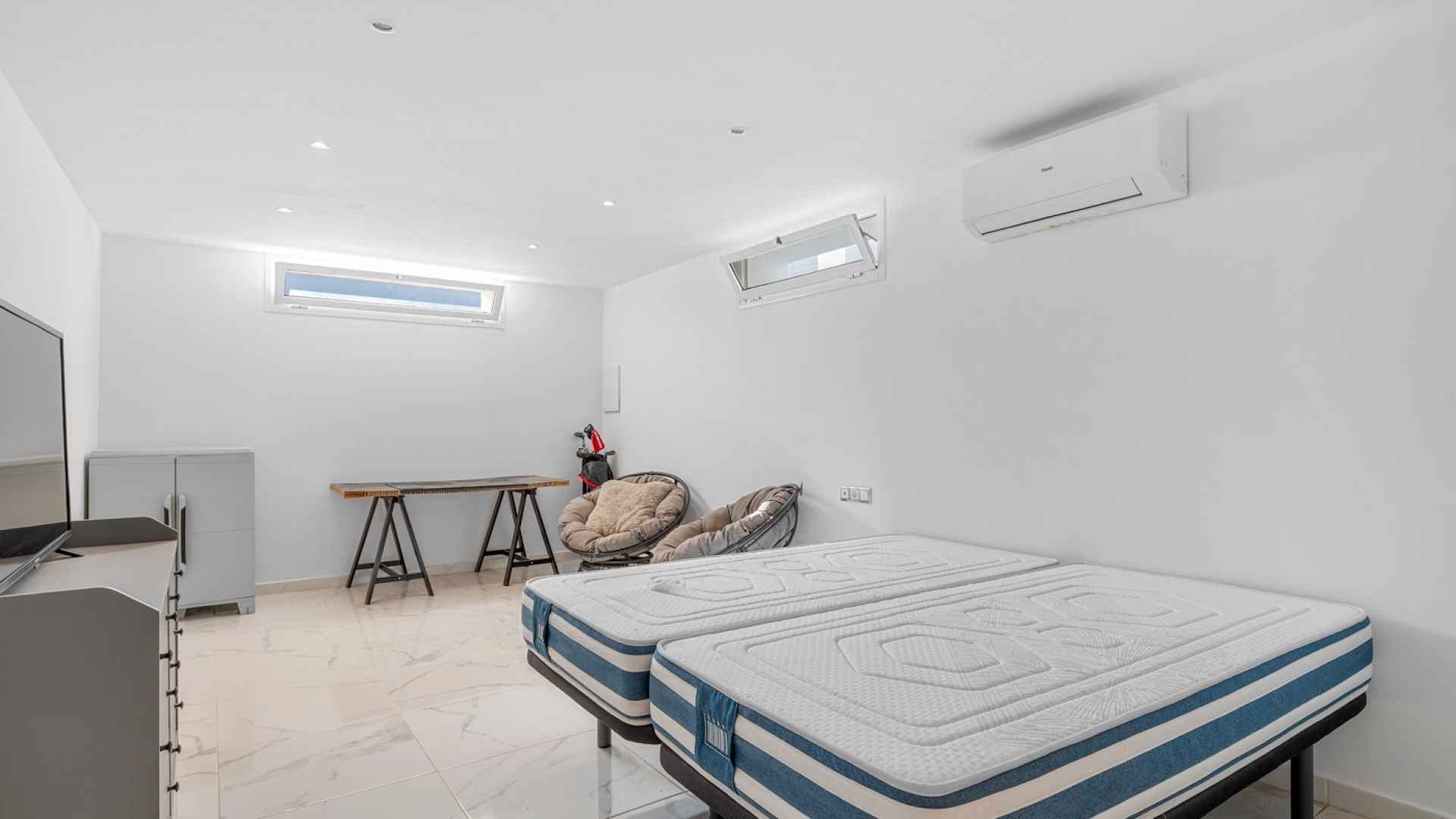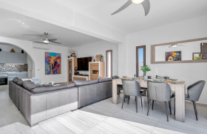 The main floor comprises of; four bedrooms, all equipped with individual air conditioning, two full bathrooms, a spacious and bright living-dining room, and a functional open-plan kitchen with a utility area that integrates seamlessly into the living area.