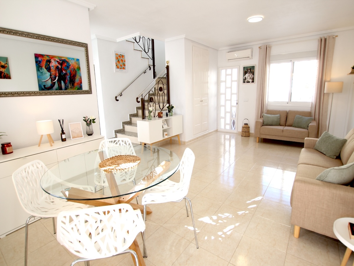 This Attractive & Beautifully Presented, South-facing, three bedroom, two bathroom semi-detached townhouse is located in the very sought after area of Dona Pepa, Ciudad Quesada on the Costa Blanca South. Ideally situated within walking distance there is a good choice of local amenities such as local bars, restaurants, pharmacy, a language school plus a large medical centre. The very popular main Quesada high street is also within easy walking distance and here you will find a huge array of amenities such as; shopping boulevards, banks, cafes, bars, restaurants, supermarkets and much more...Just a short drive away will take you to the beautiful La Marquesa golf course, the Recorral nature park with its forest and lovely lakes, plus the family Aqua Park. The nearest beautiful sandy beaches can be reached in an easy 10 minute drive at Guardamar del Segura.