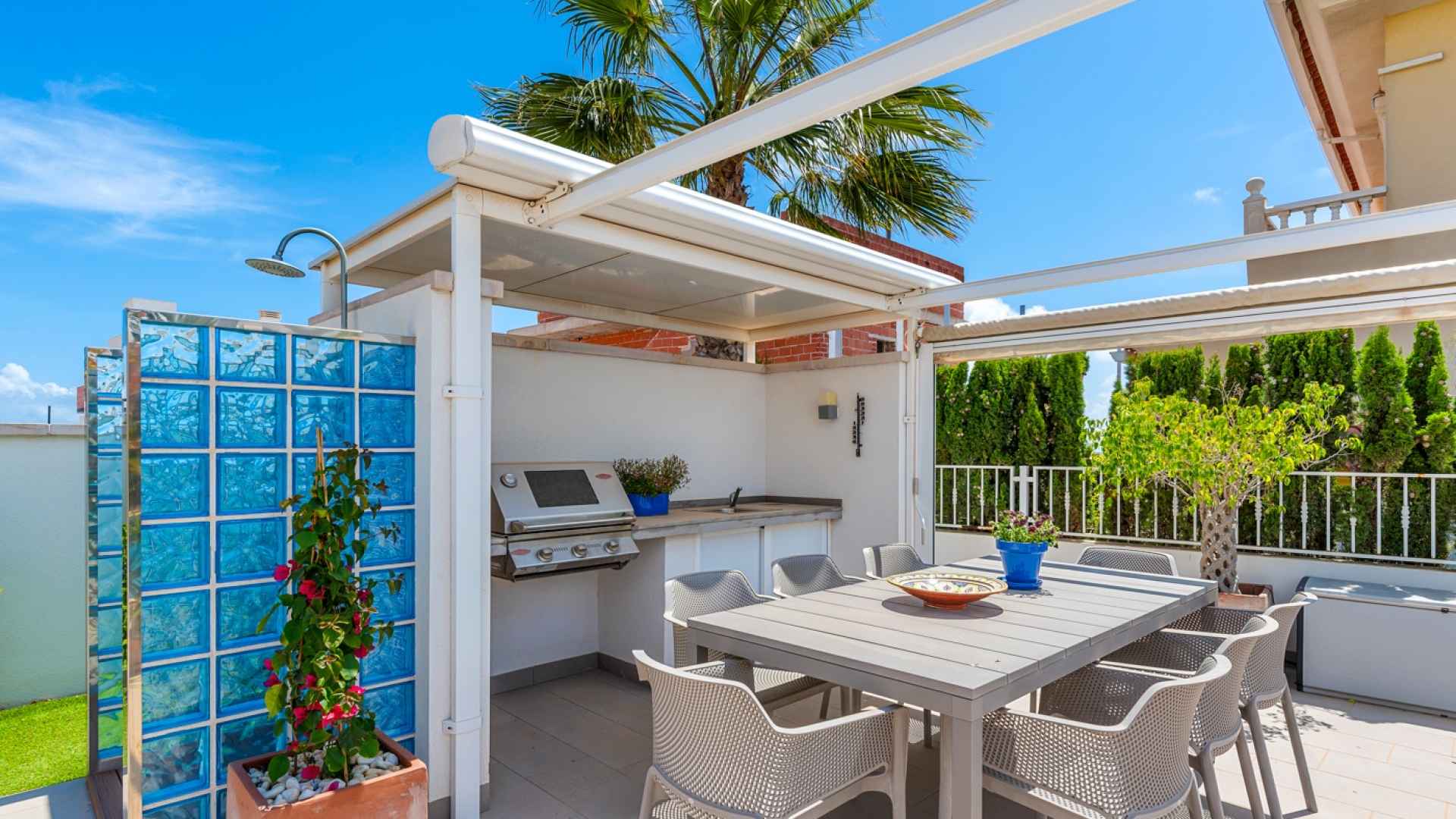 Outside, the property occupies a generous South-facing plot of 500 m2 where you will find a terrific and very inviting private swimming pool with space next to it for sun beds. At the end of the pool there is an outdoor kitchen / BBQ area with a covered dining table. There is also a lovely terrace facing the pool with access from the living room and dining room where you can find a lounge area. On the plot you can also find off-road parking with an automatic gate and a storage room.