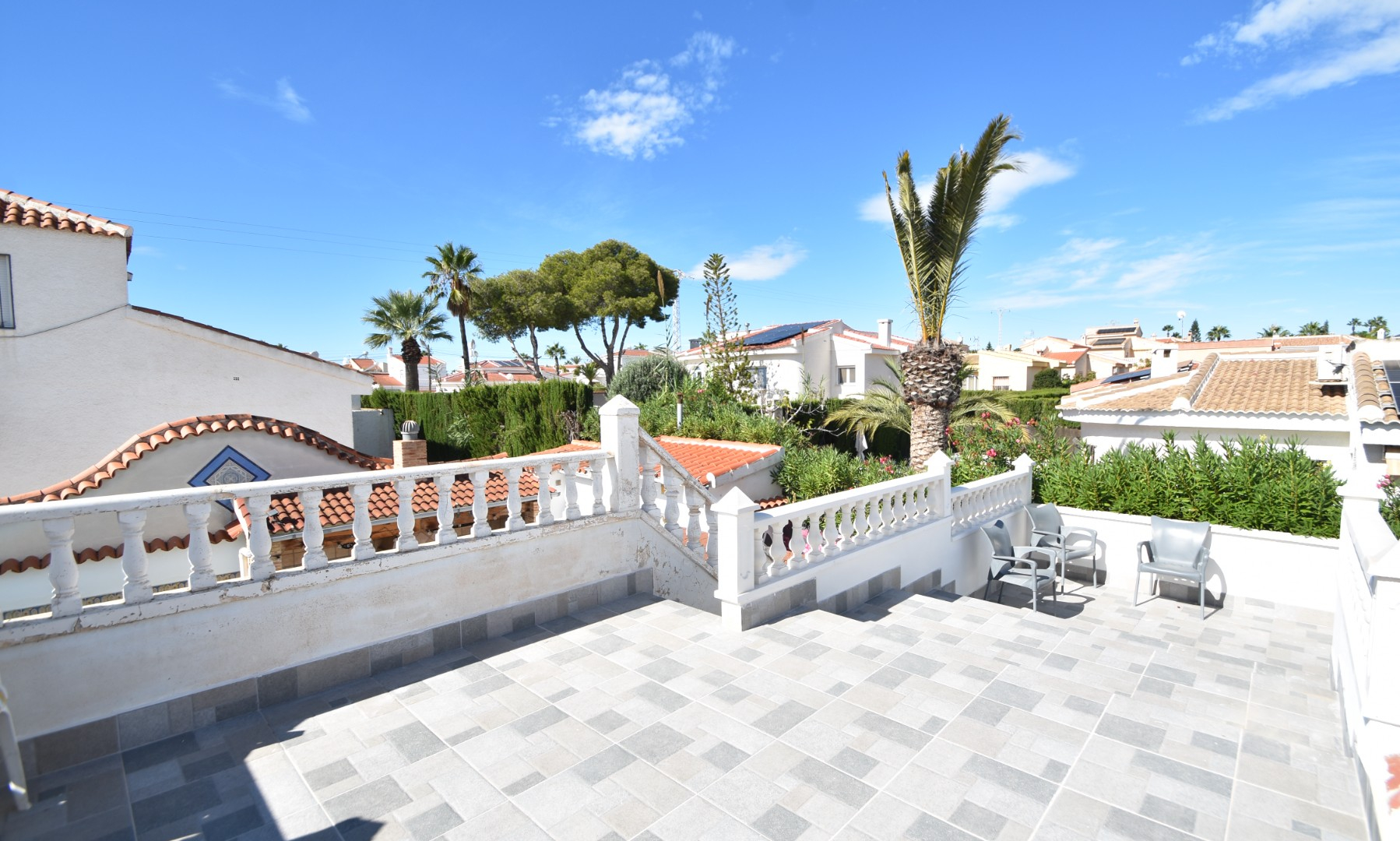 This Wonderful & nicely presented, four bedroom, three bathroom detached villa is located in the pretty La Fiesta area of Ciudad Quesada on the Costa Blanca South. Within a short 5 minute drive you will find a good choice of amenities down on the golf course including; a main brand supermarket, bars, restaurants along with the new clubhouse. Within easy walking distance you have the pretty Recorral nature park with its lovely lakes and picnic area. The main Quesada high street is just a short drive away where you will find a great choice of amenities such as; banks, shopping boulevards, supermarkets, bars, cafes, restaurants and much more. The nearest lovely sandy beaches are just a 10 minute drive away at Guardamar del Segura.