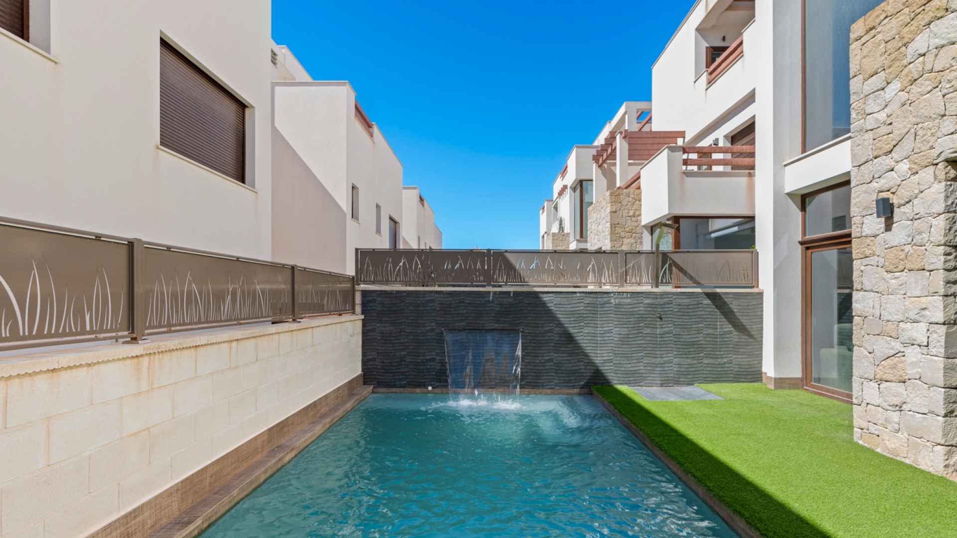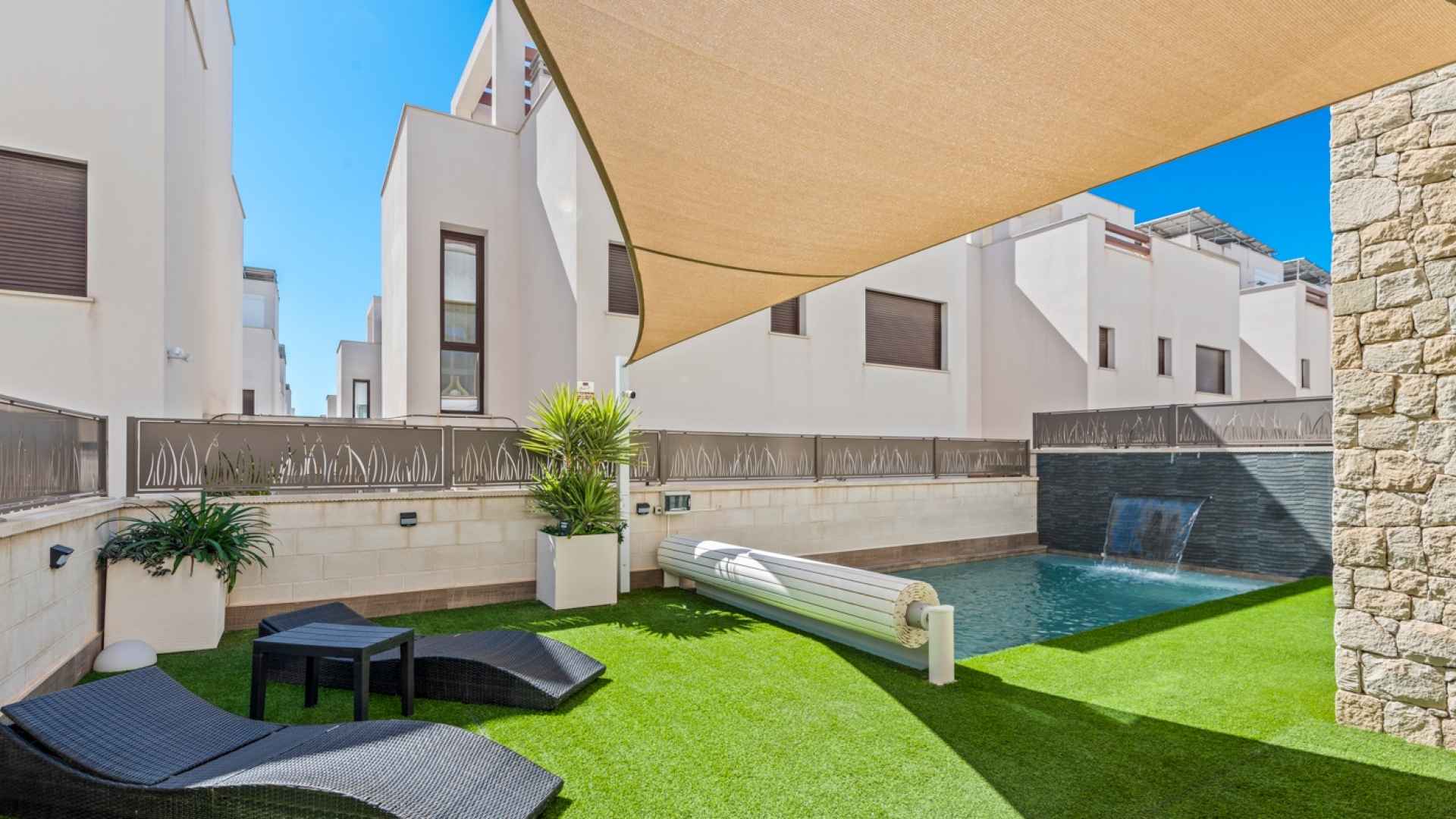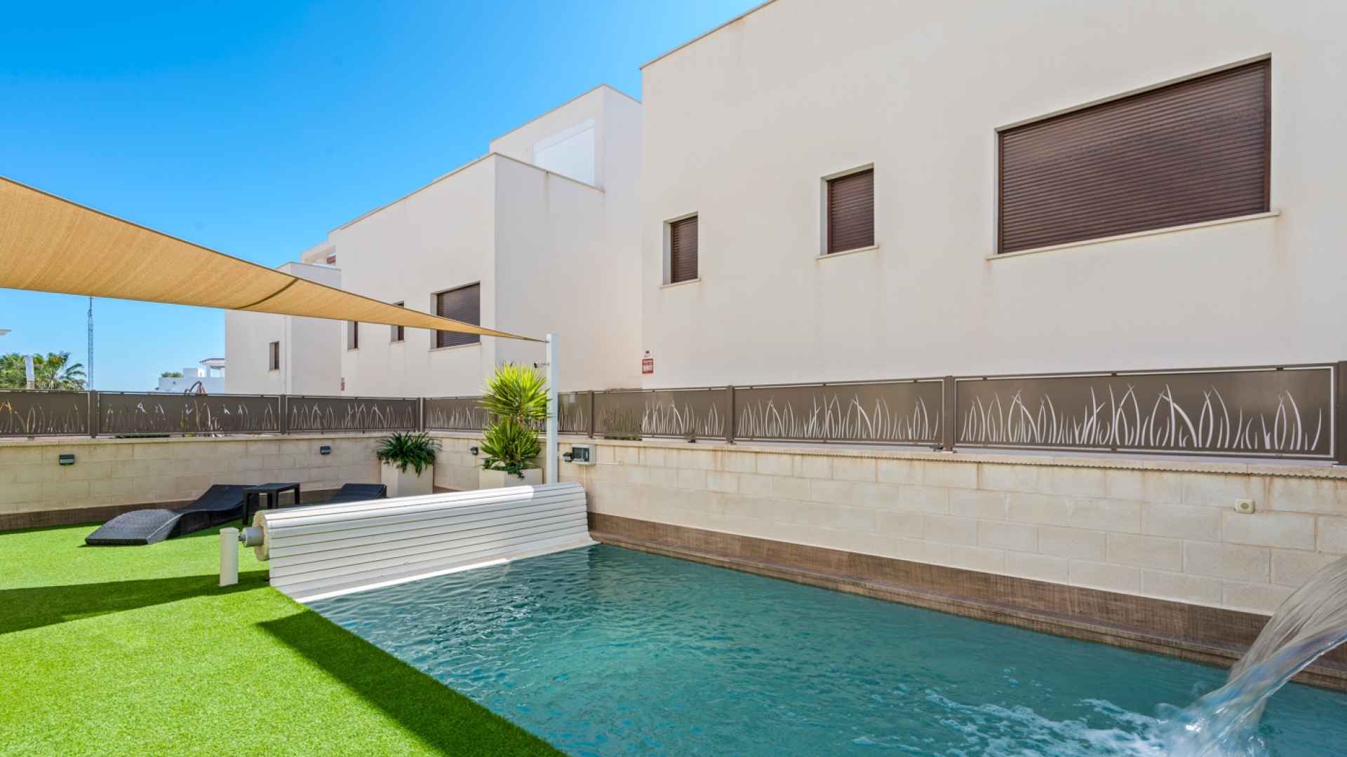 The outdoor area includes a private saltwater pool with an automatic cover, an artificial grass garden, and a designated parking space within the plot.