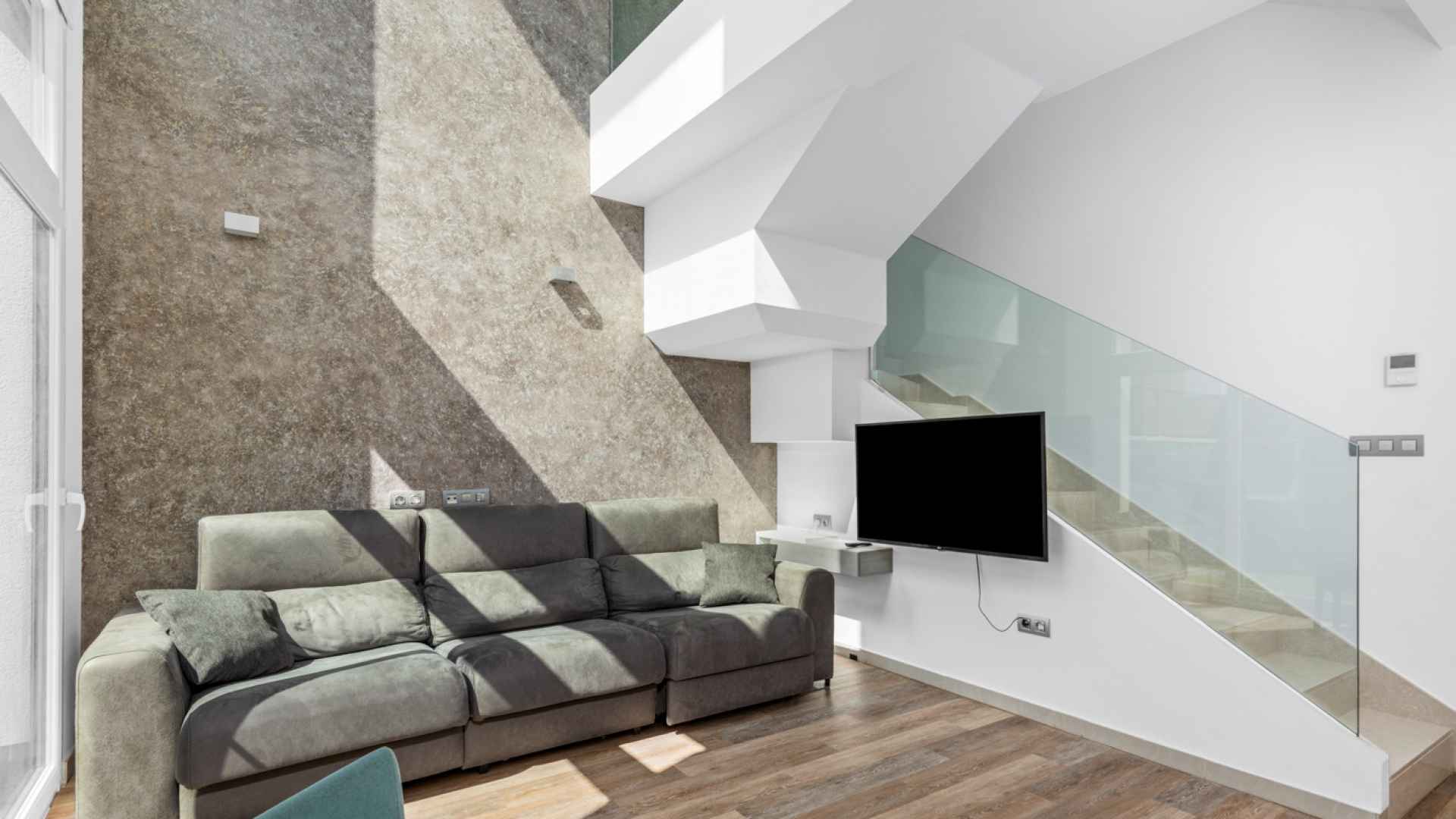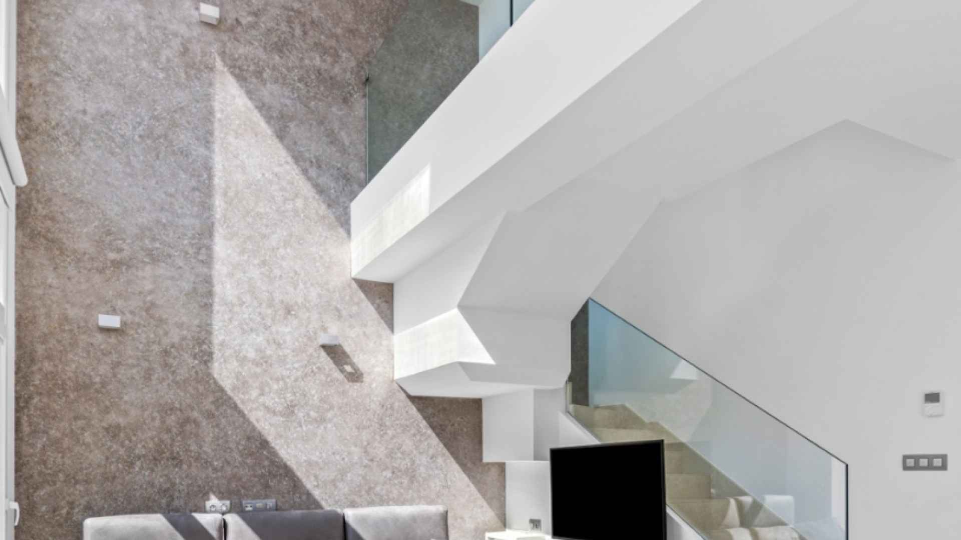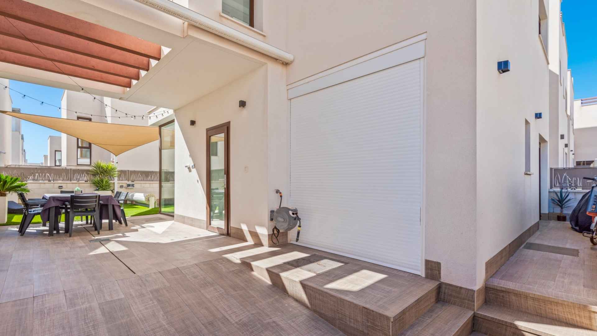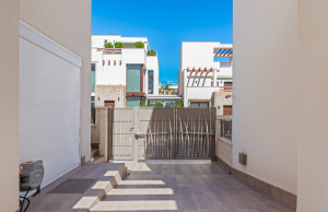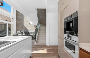This stylish villa has a build size of 101m2 set on a plot of 182m2 and has three bedrooms and three bathrooms. The ground floor includes a living room with lovely high ceilings with an integrated kitchen, a full bathroom, one bedroom, plus a laundry area equipped with an 8 kg washer and dryer.