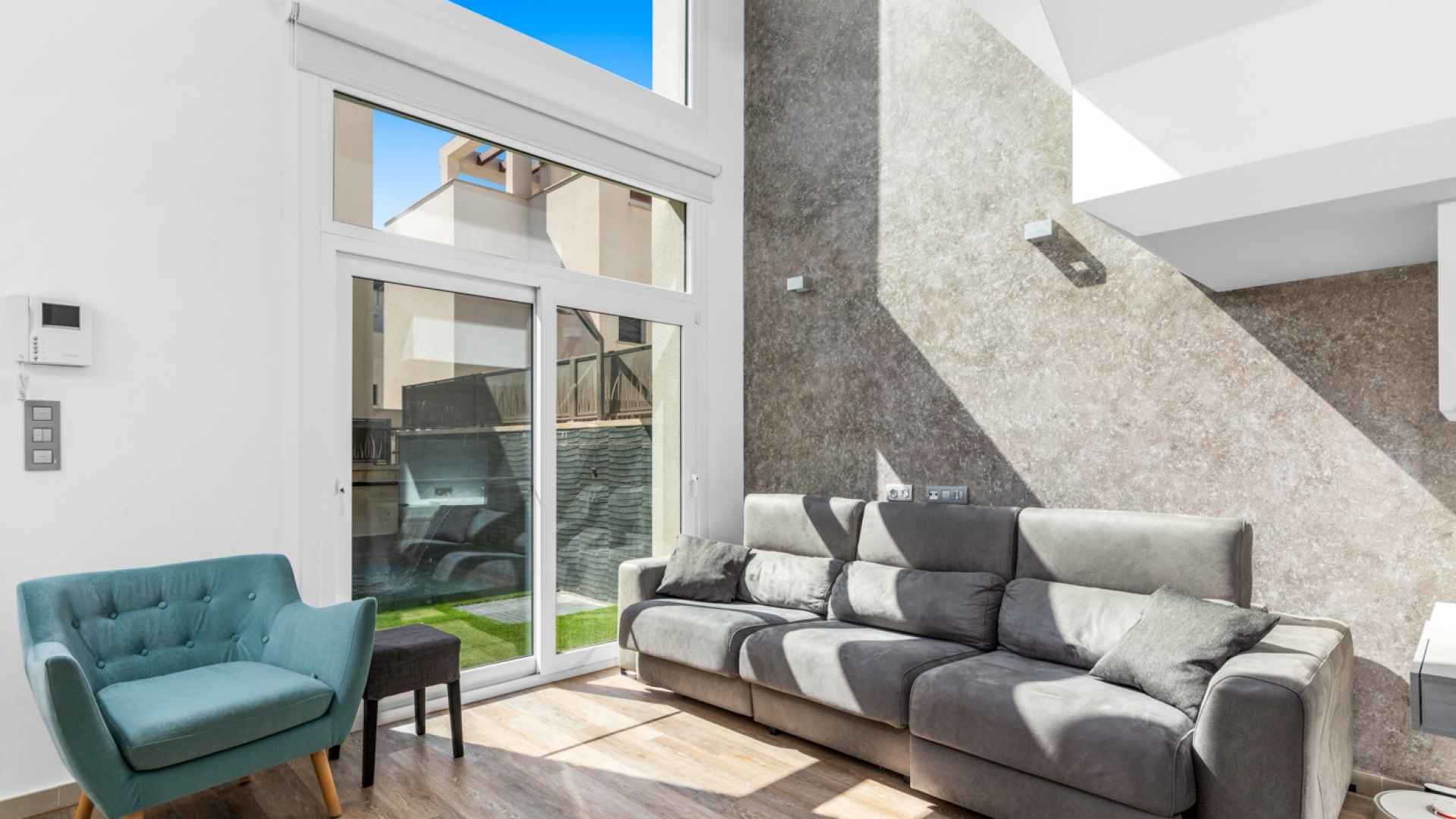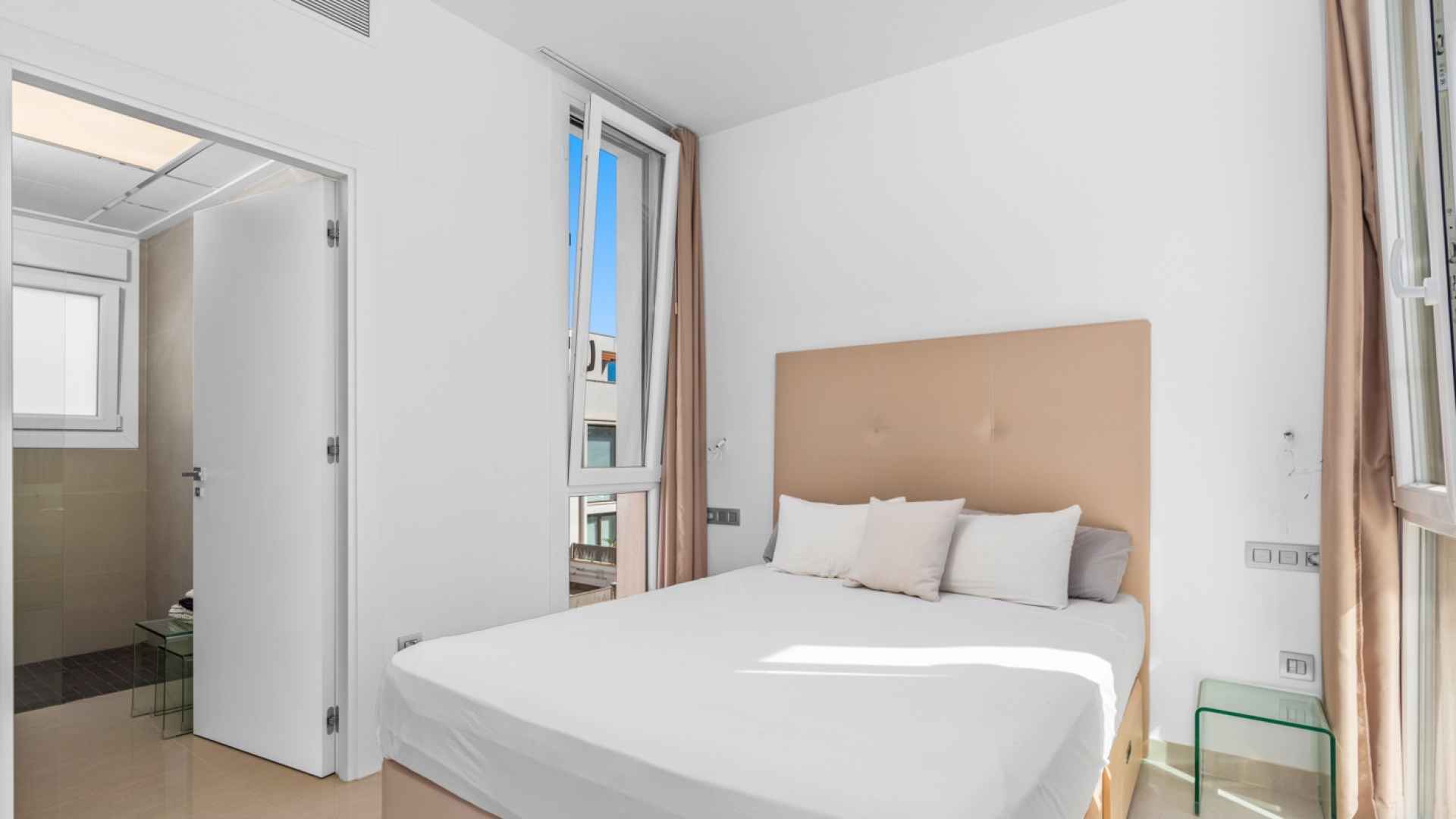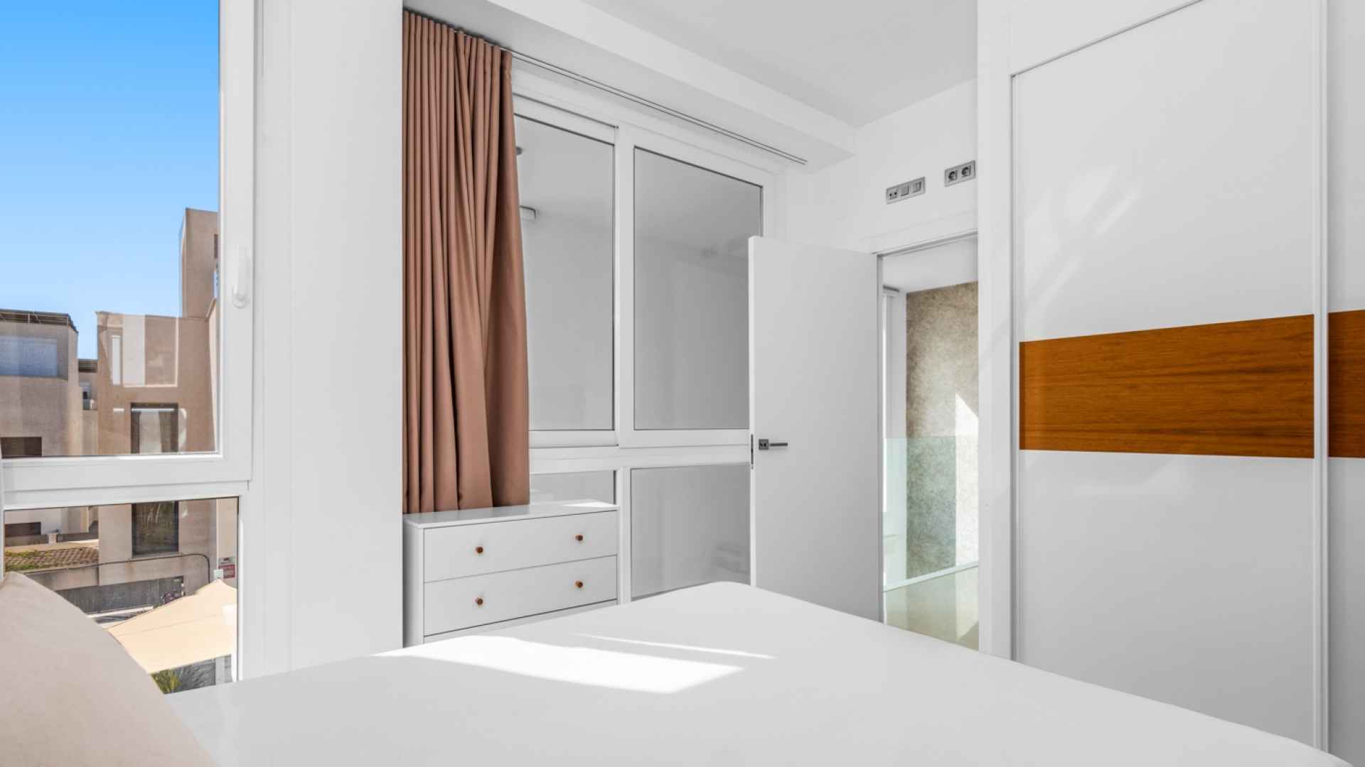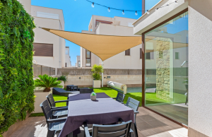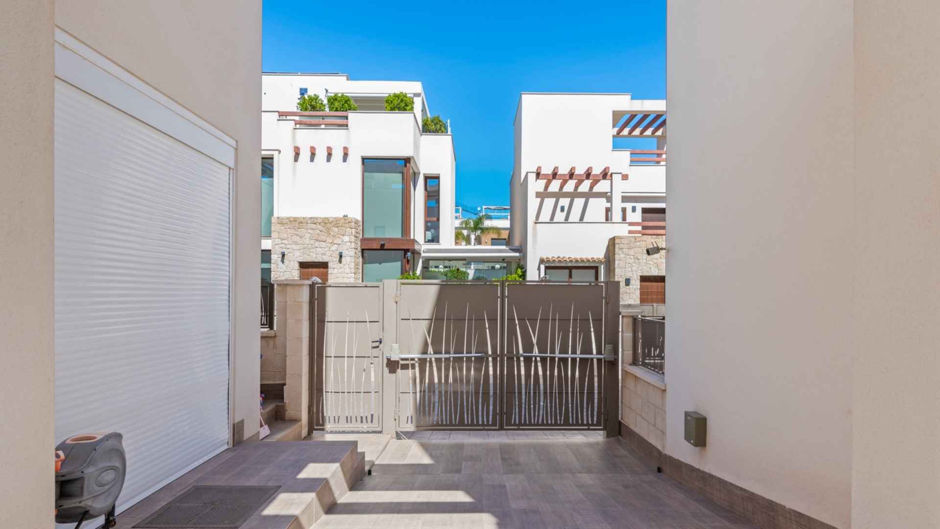 This stylish villa has a build size of 101m2 set on a plot of 182m2 and has three bedrooms and three bathrooms. The ground floor includes a living room with lovely high ceilings with an integrated kitchen, a full bathroom, one bedroom, plus a laundry area equipped with an 8 kg washer and dryer.