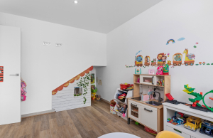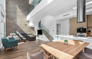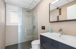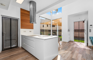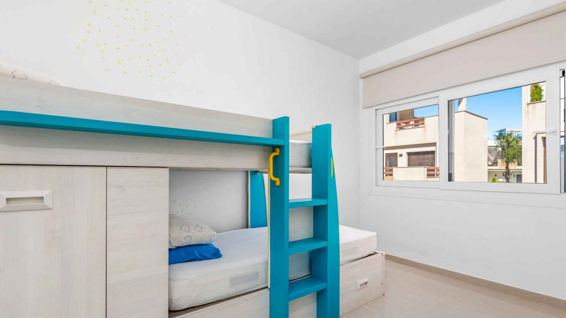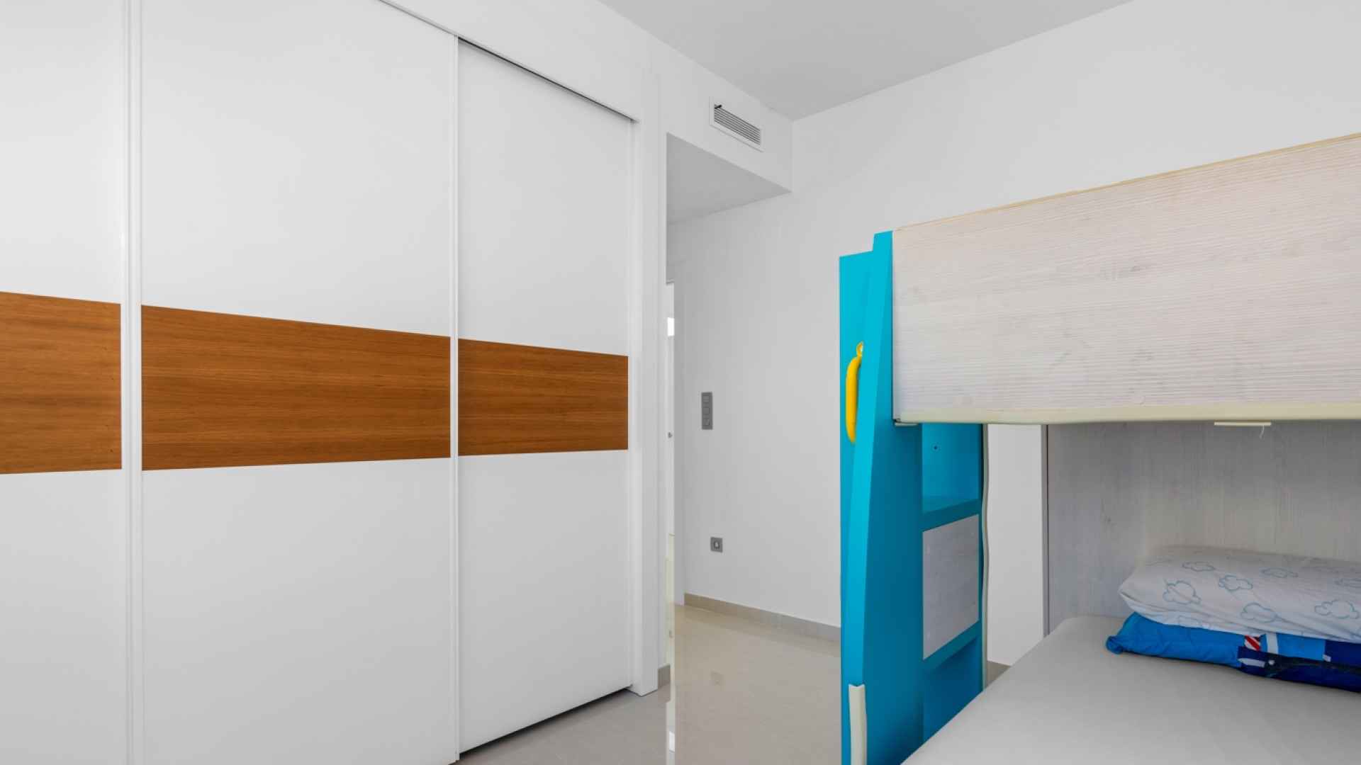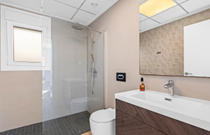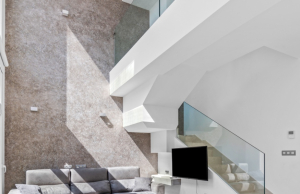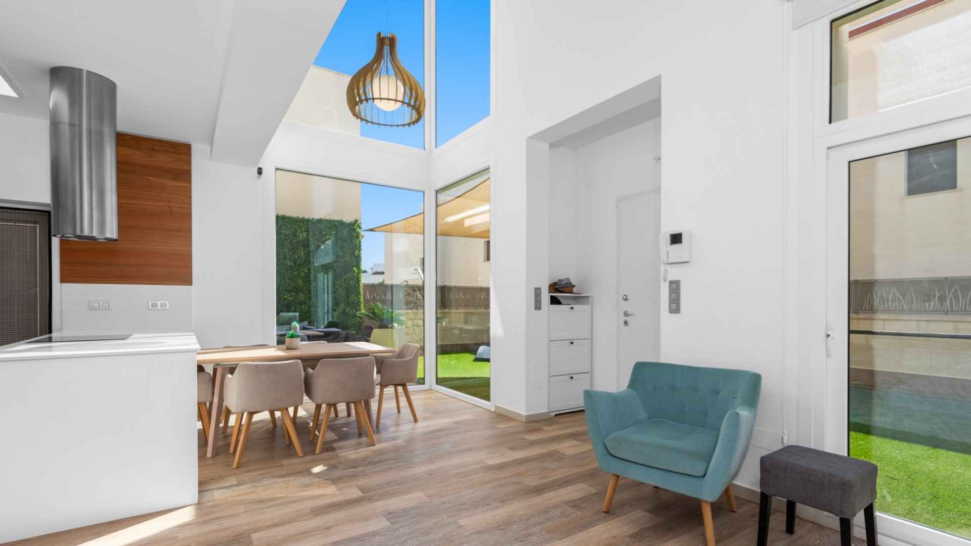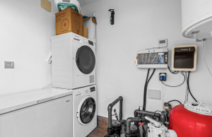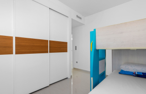 This stylish villa has a build size of 101m2 set on a plot of 182m2 and has three bedrooms and three bathrooms. The ground floor includes a living room with lovely high ceilings with an integrated kitchen, a full bathroom, one bedroom, plus a laundry area equipped with an 8 kg washer and dryer.