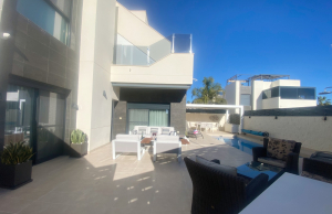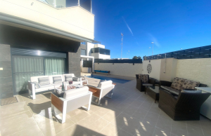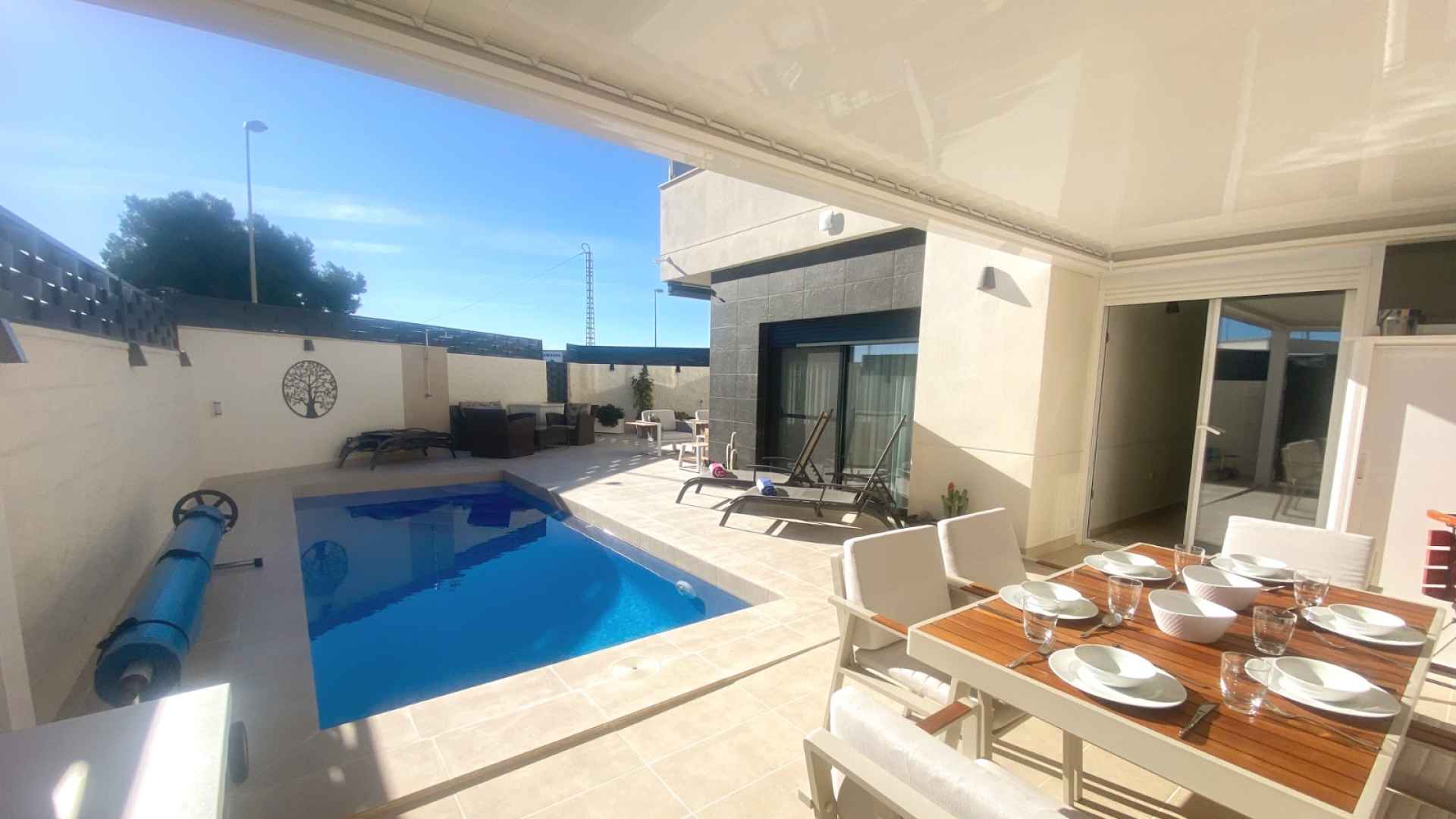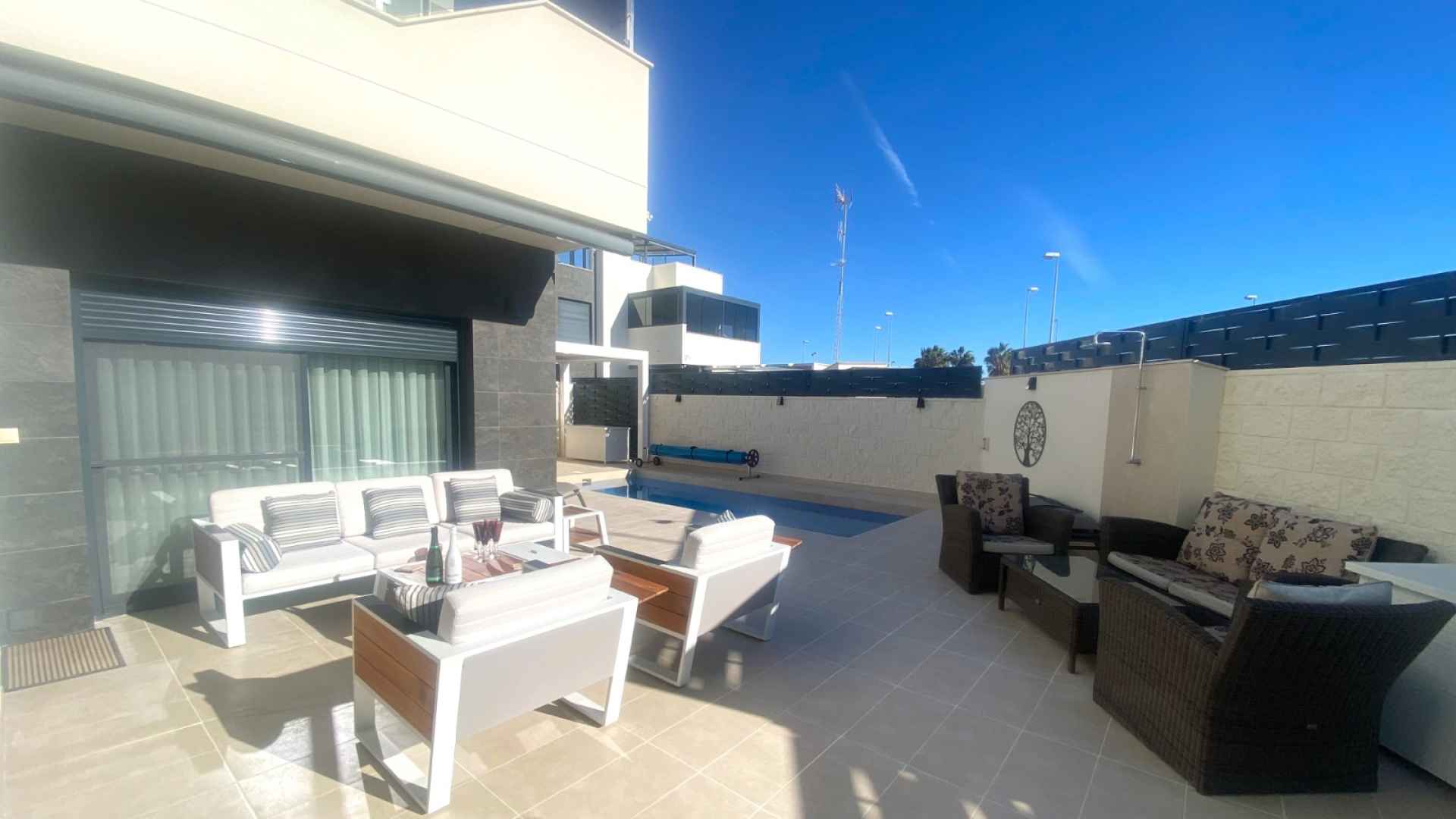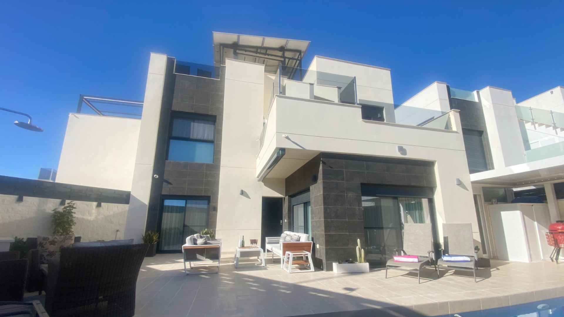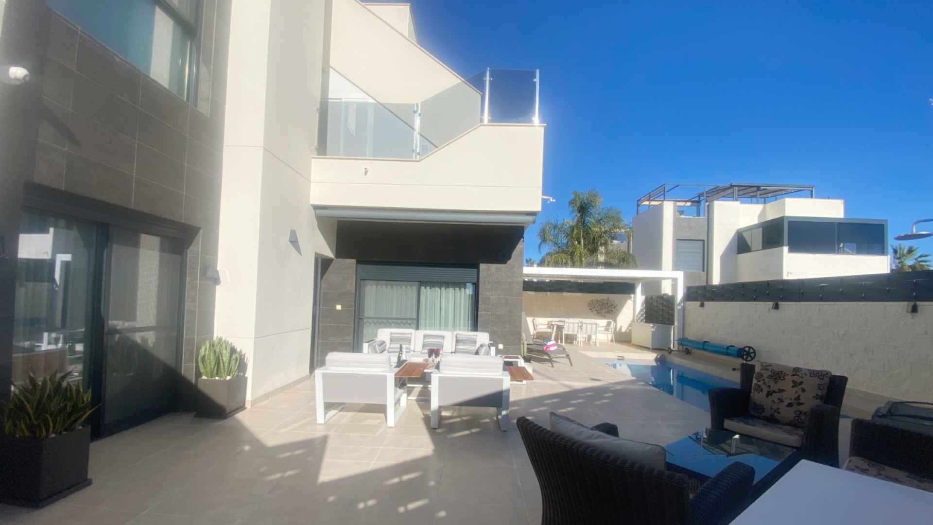 This Stunning, Spacious & Beautifully presented, three bedroom, three bathroom villa is located in the highly desirable area of Pueblo Bravo, Ciudad Quesada on the Costa Blanca South. Within walking distance you will find; a main brand supermarket, bars, restaurants, and a private school. Also very nearby you have the local amenities of Dona Pepa to include; a pharmacy, bars, restaurants, medical centre, language school plus the lovely La Laguna spa hotel. An easy 5 minute drive will take you into the very popular main Quesada high street which offers a further wealth of amenities and services including; restaurants, bars, supermarkets, banks, petrol station, bowling alley and two shopping boulevards. Also close by is the beautiful La Marquesa golf course with its lovely clubhouse, a main brand supermarket plus several bars and restaurants. The pretty Recorral Nature Park with its lovely lakes and picnic areas and the Rojales family Aqua park are also just a short drive away. The nearest stunning sandy beaches can be reached in an easy 10 minute drive at Guardamar del Segura.