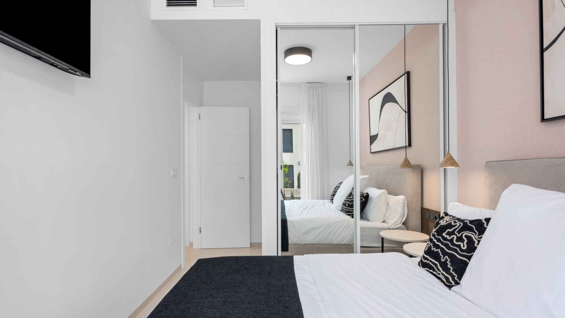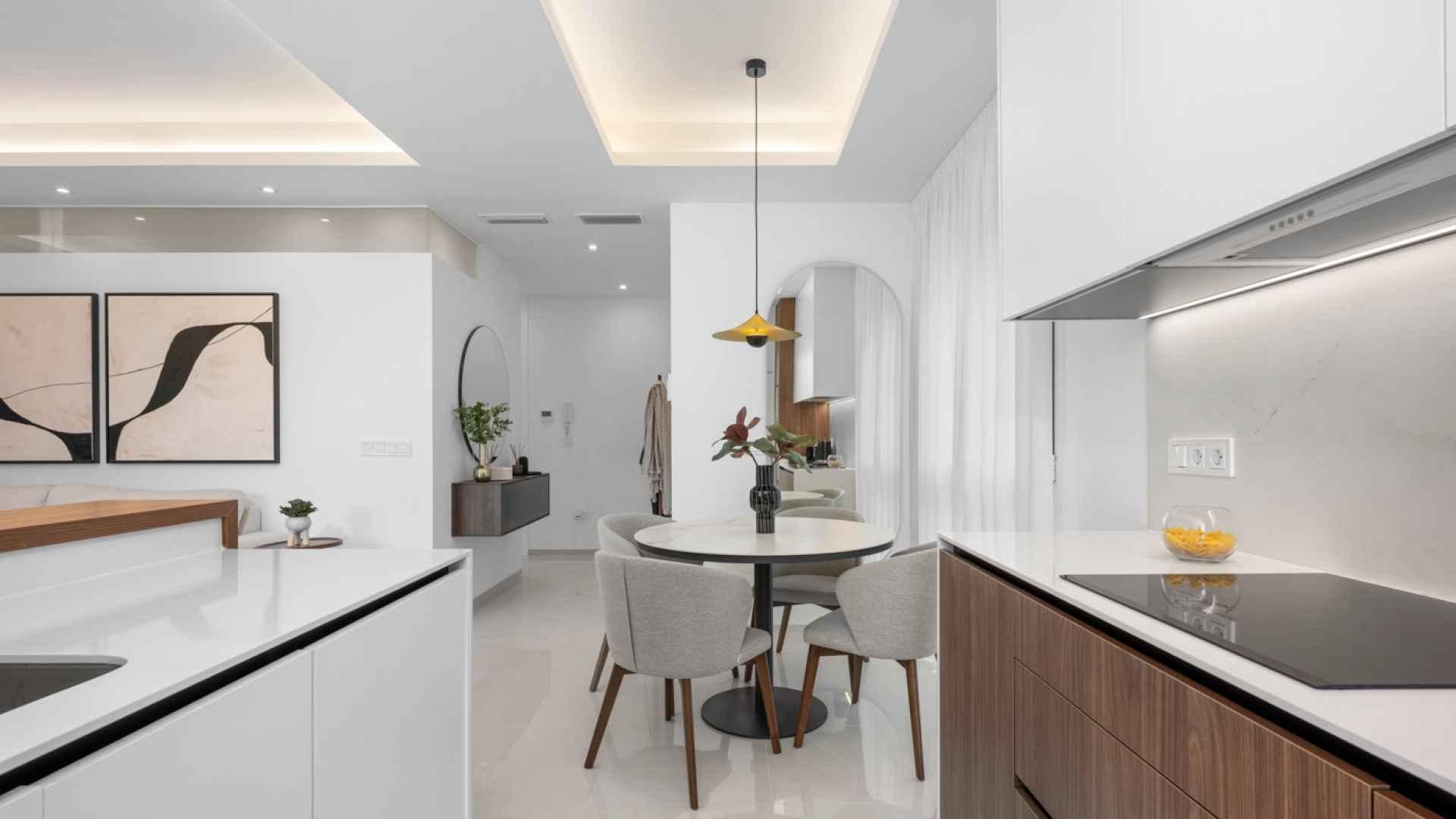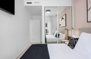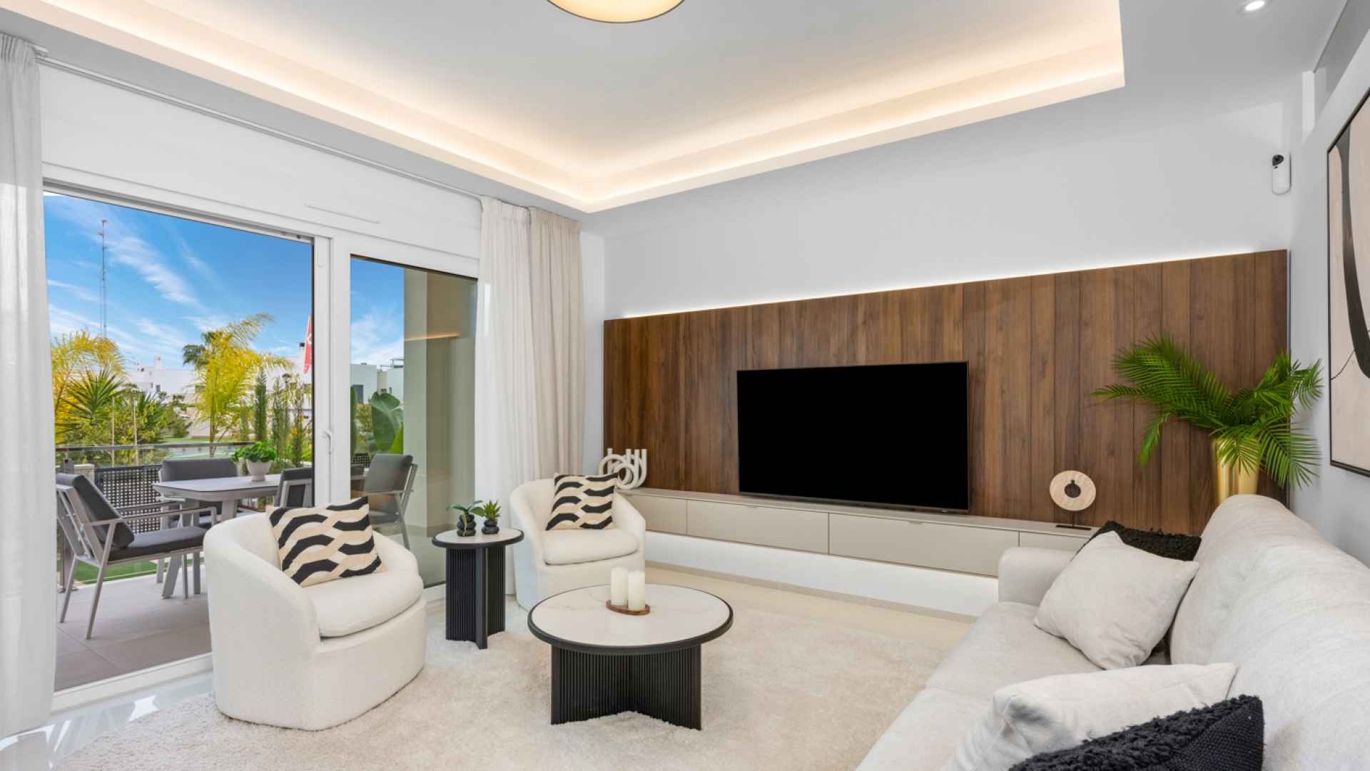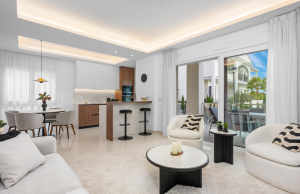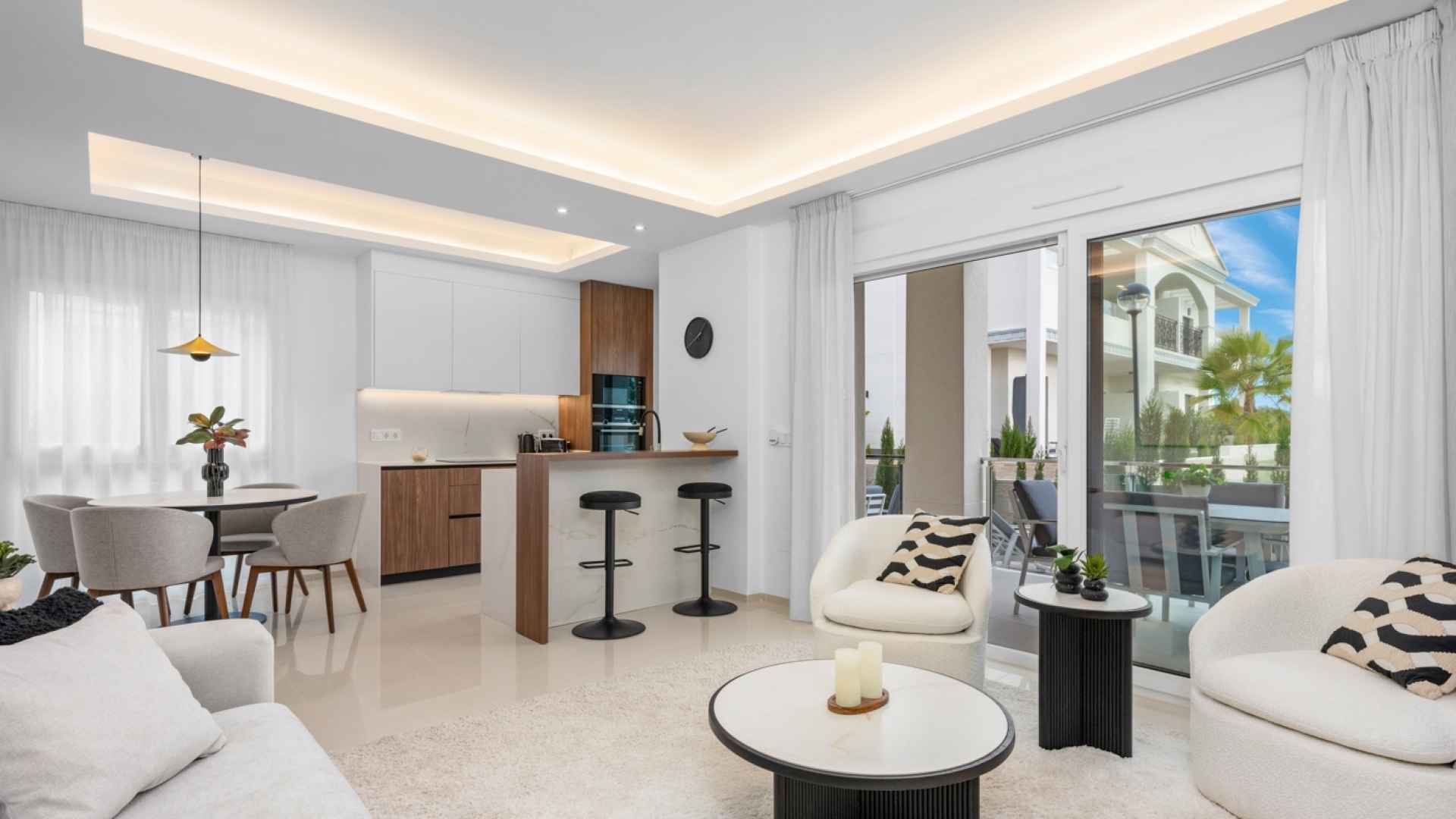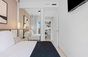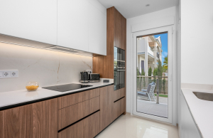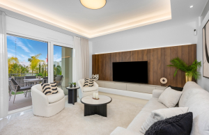 The property offers a modern and functional design, with two spacious double bedrooms with fitted wardrobes, two bathrooms with large walk-in showers, one of which has an en-suite bathroom for added convenience. The living room stands out for its welcoming and contemporary ambiance, integrated into an open-plan space next to the fully equipped kitchen with high-quality appliances. Thanks to its layout, the living room and kitchen connect directly to the main terrace, providing abundant natural light and a seamless transition to the outdoors.