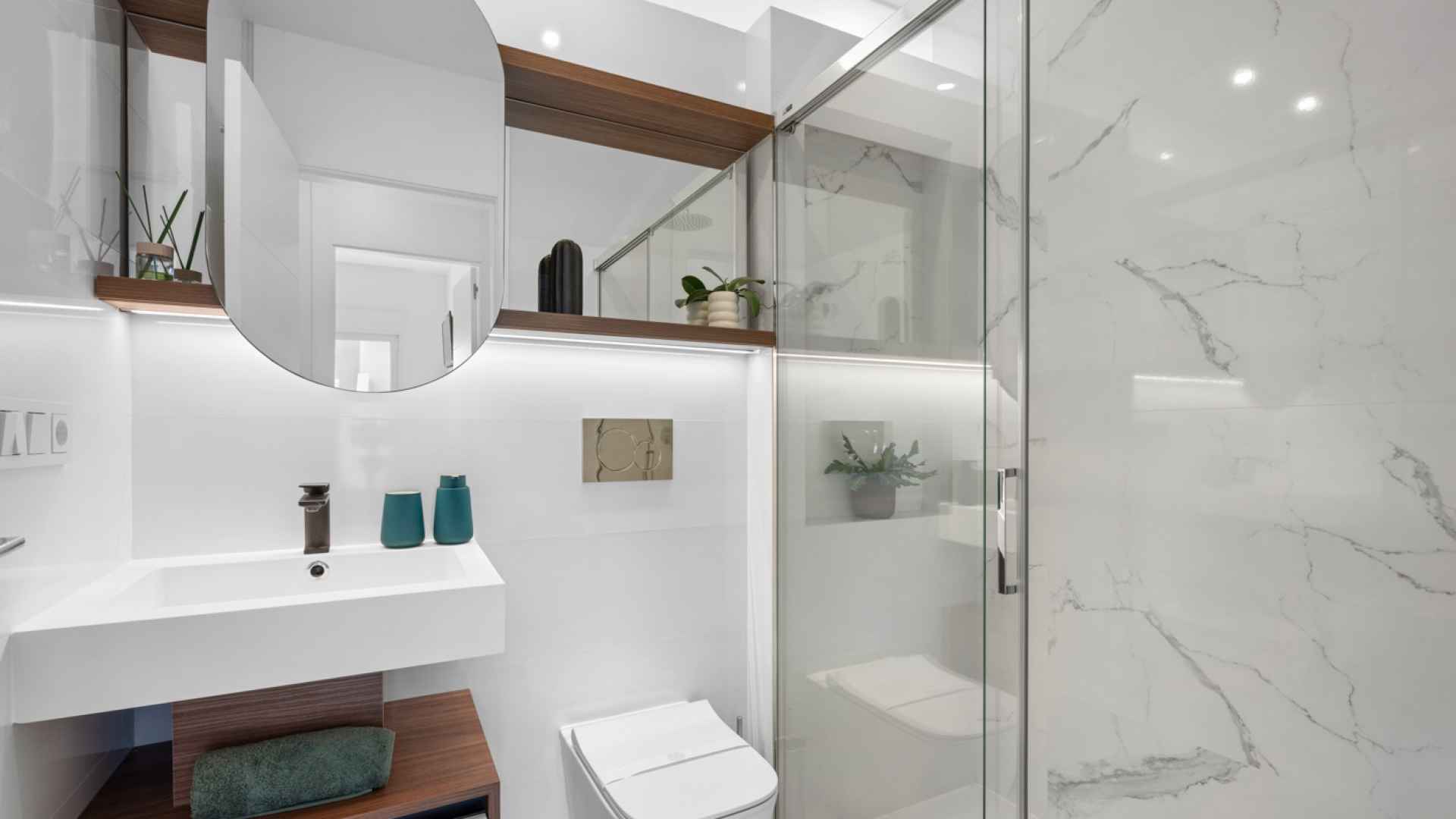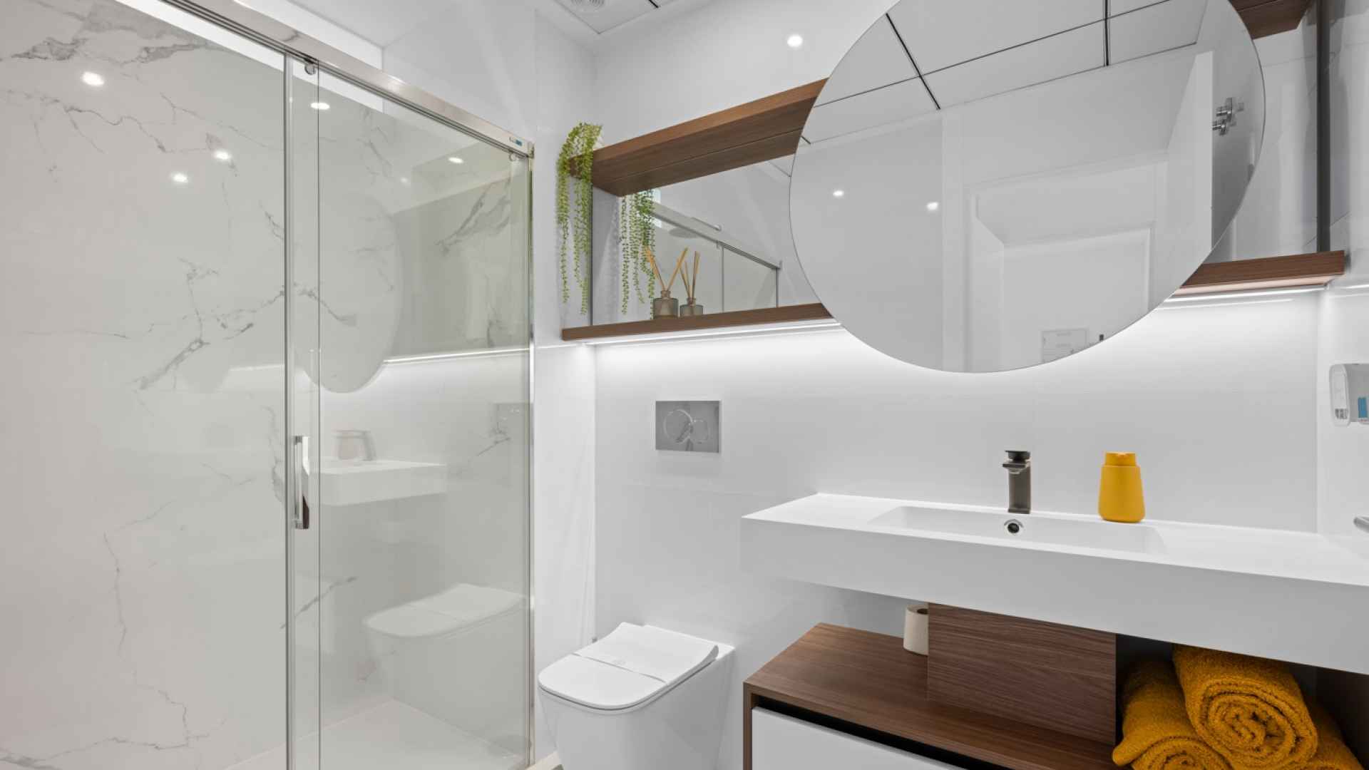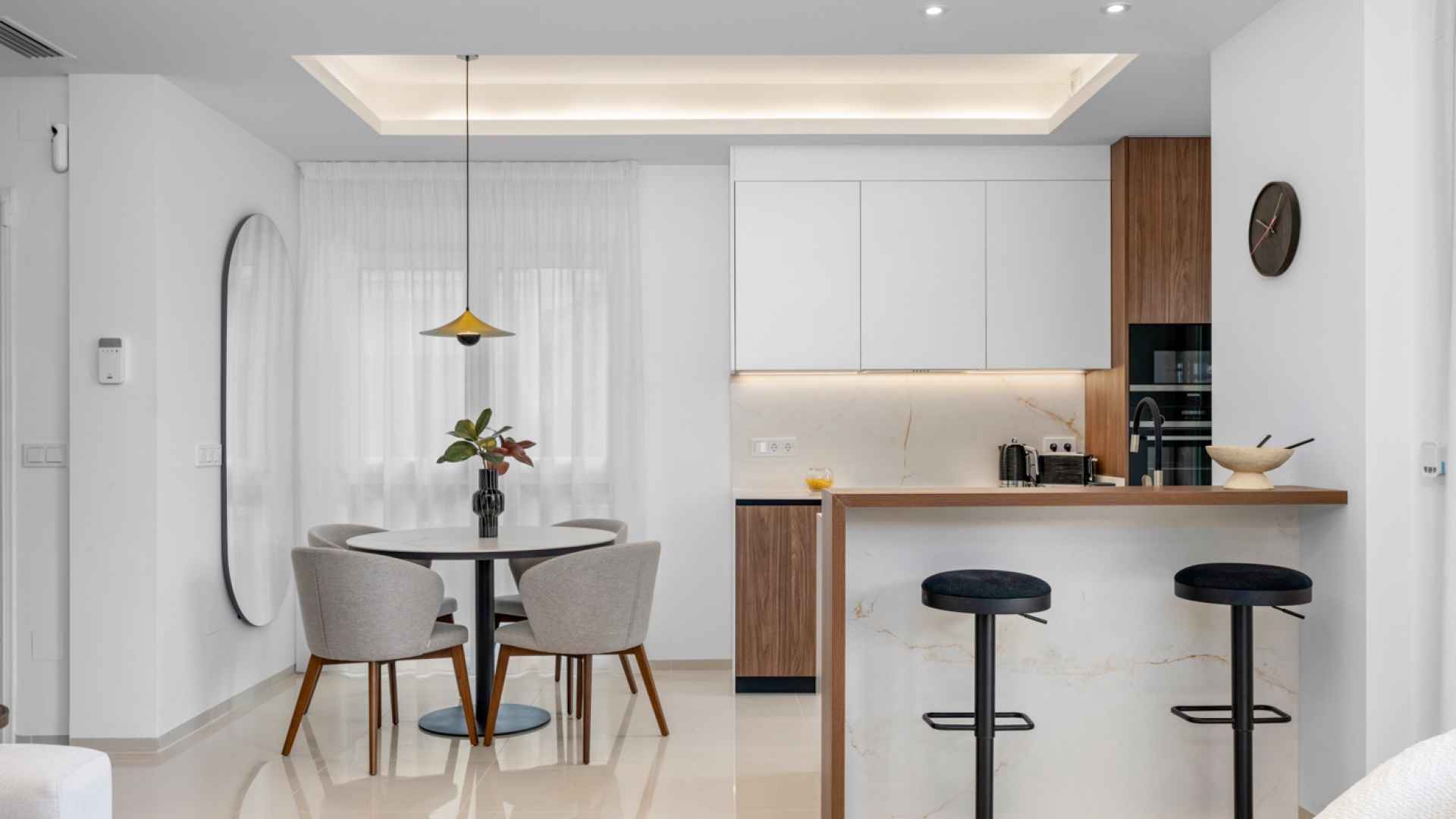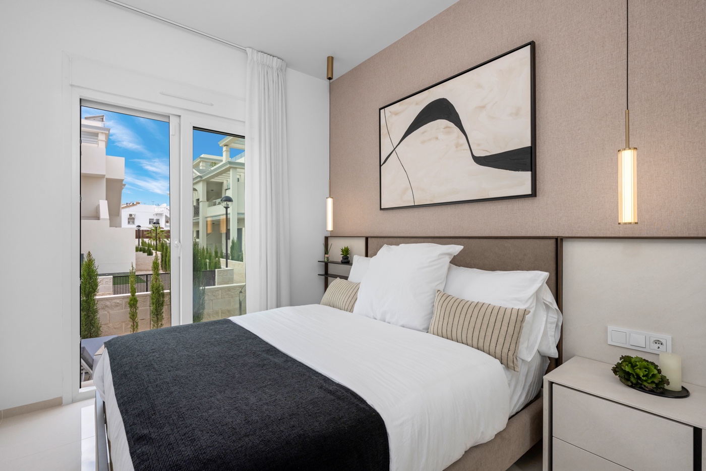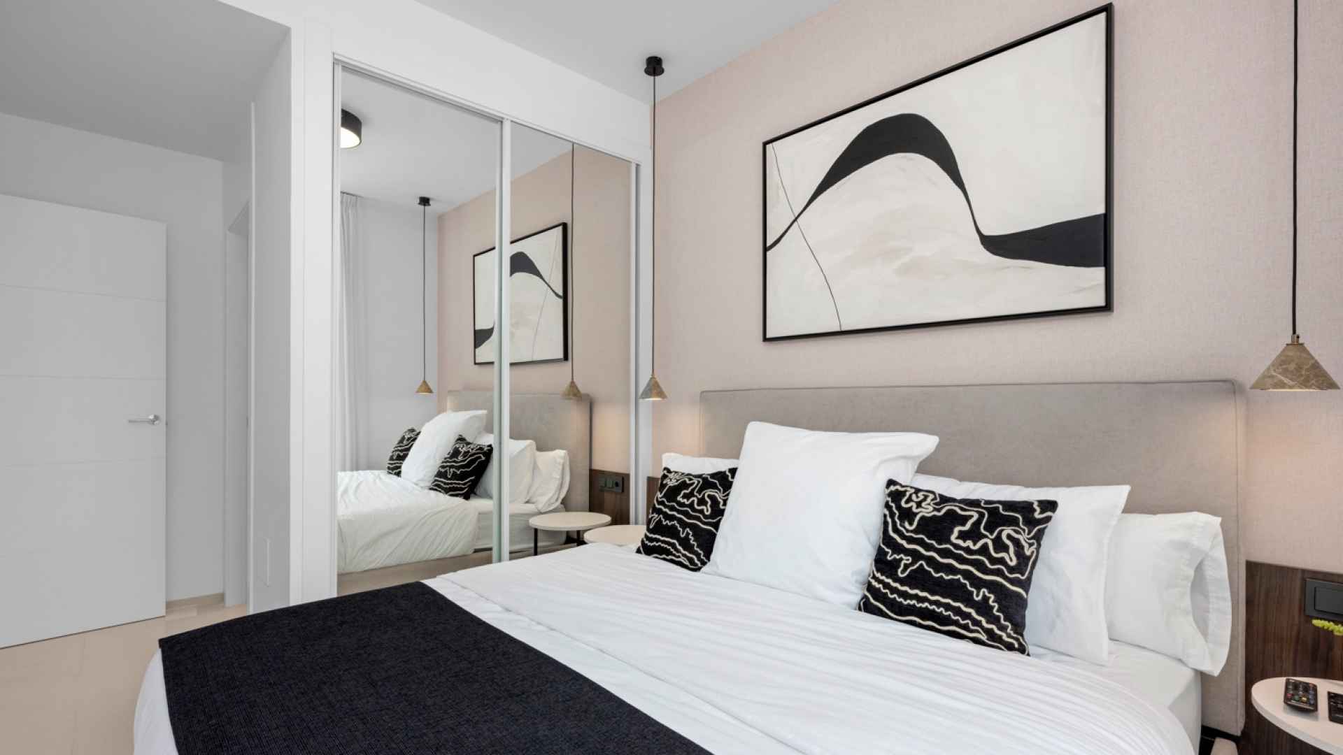 The property offers a modern and functional design, with two spacious double bedrooms with fitted wardrobes, two bathrooms with large walk-in showers, one of which has an en-suite bathroom for added convenience. The living room stands out for its welcoming and contemporary ambiance, integrated into an open-plan space next to the fully equipped kitchen with high-quality appliances. Thanks to its layout, the living room and kitchen connect directly to the main terrace, providing abundant natural light and a seamless transition to the outdoors.