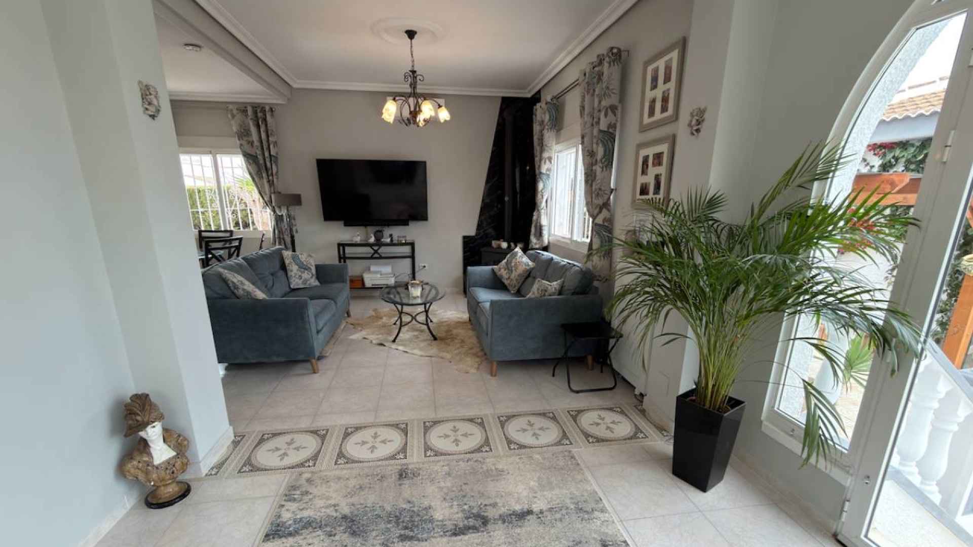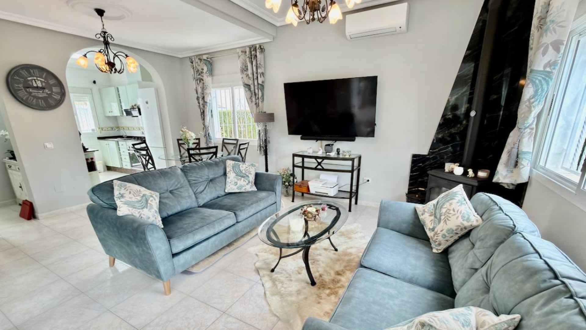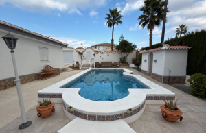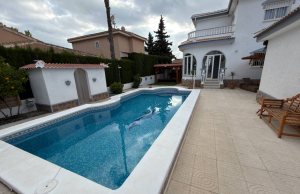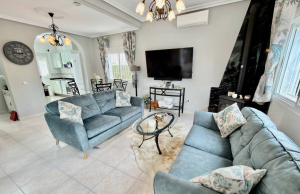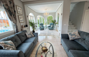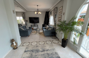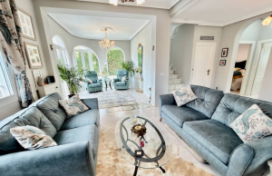 This Attractive and immaculately presented, three bedroom, three bathroom detached villa is located in the highly desirable area of Pueblo Bravo, Ciudad Quesada on the Costa Blanca South. Within walking distance you will find; a main brand supermarket, bars, restaurants, and a private school. Also very nearby you have the local amenities of Dona Pepa to include; a pharmacy, bars, restaurants, medical centre, language school plus the lovely La Laguna spa hotel. An easy 5 minute drive will take you into the very popular main Quesada high street which offers a further wealth of amenities and services including; restaurants, bars, supermarkets, banks, petrol station, bowling alley and two shopping boulevards. Also close by is the beautiful La Marquesa golf course with its lovely clubhouse, a main brand supermarket plus several bars and restaurants. The pretty Recorral Nature Park with its lovely lakes and picnic areas and the Rojales family Aqua park are also just a short drive away. The nearest stunning sandy beaches can be reached in an easy 10 minute drive at Guardamar del Segura.