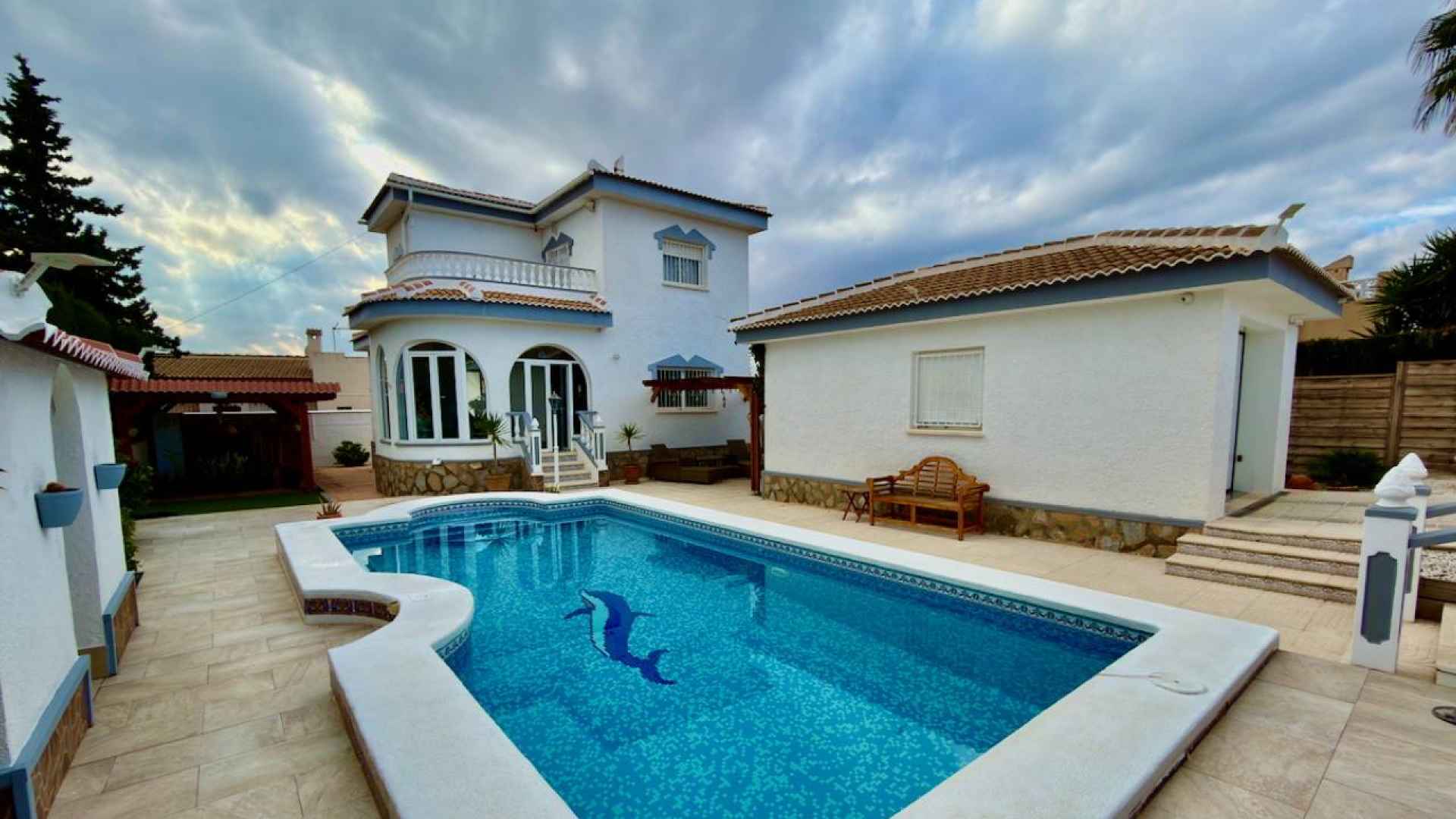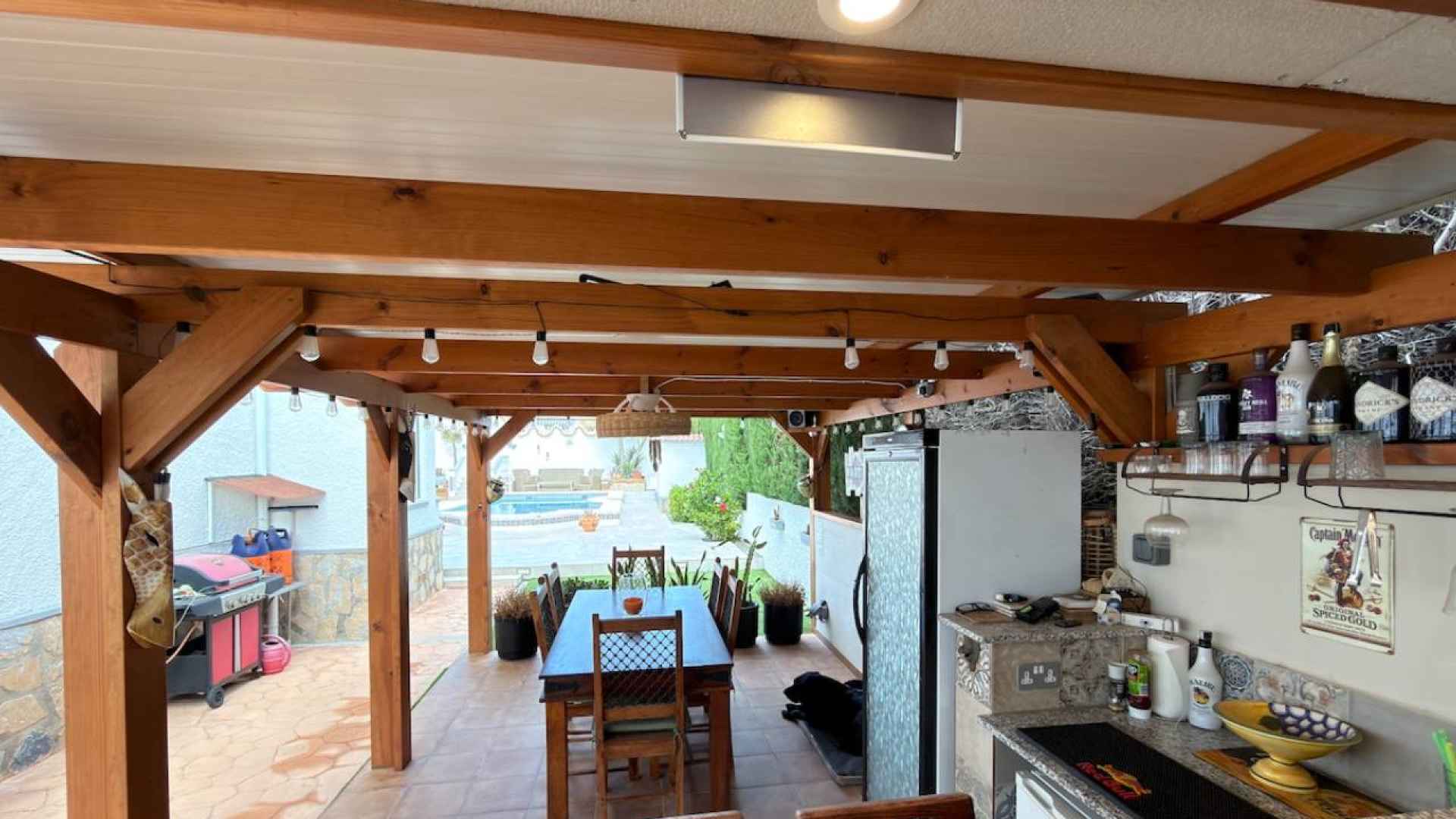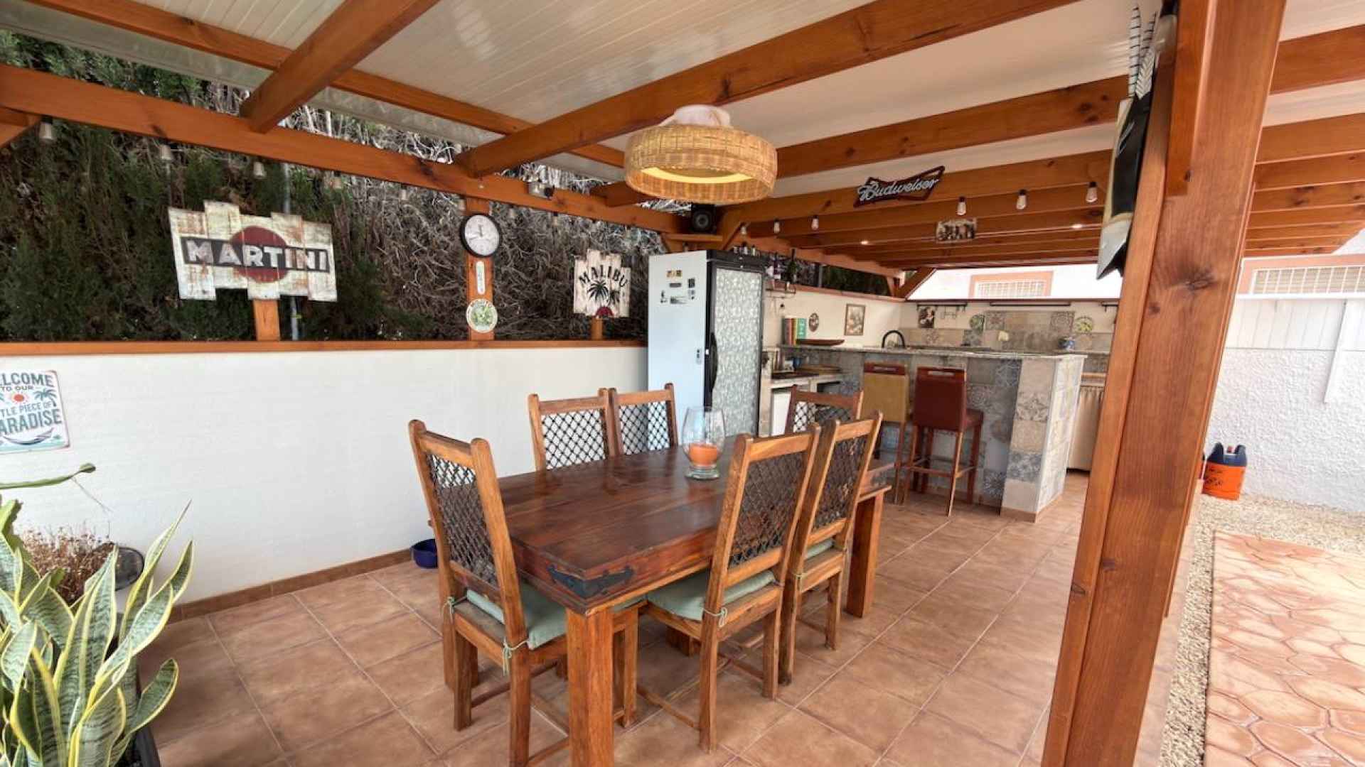 Outside, is a real hi-light with a beautifully maintained 500m2 plot which offers; a lovely feature private swimming pool, a wonderful Summer kitchen, with a covered dining area, off-road parking with a detached garage, plus ample space in which to enjoy the famous Spanish sunshine.