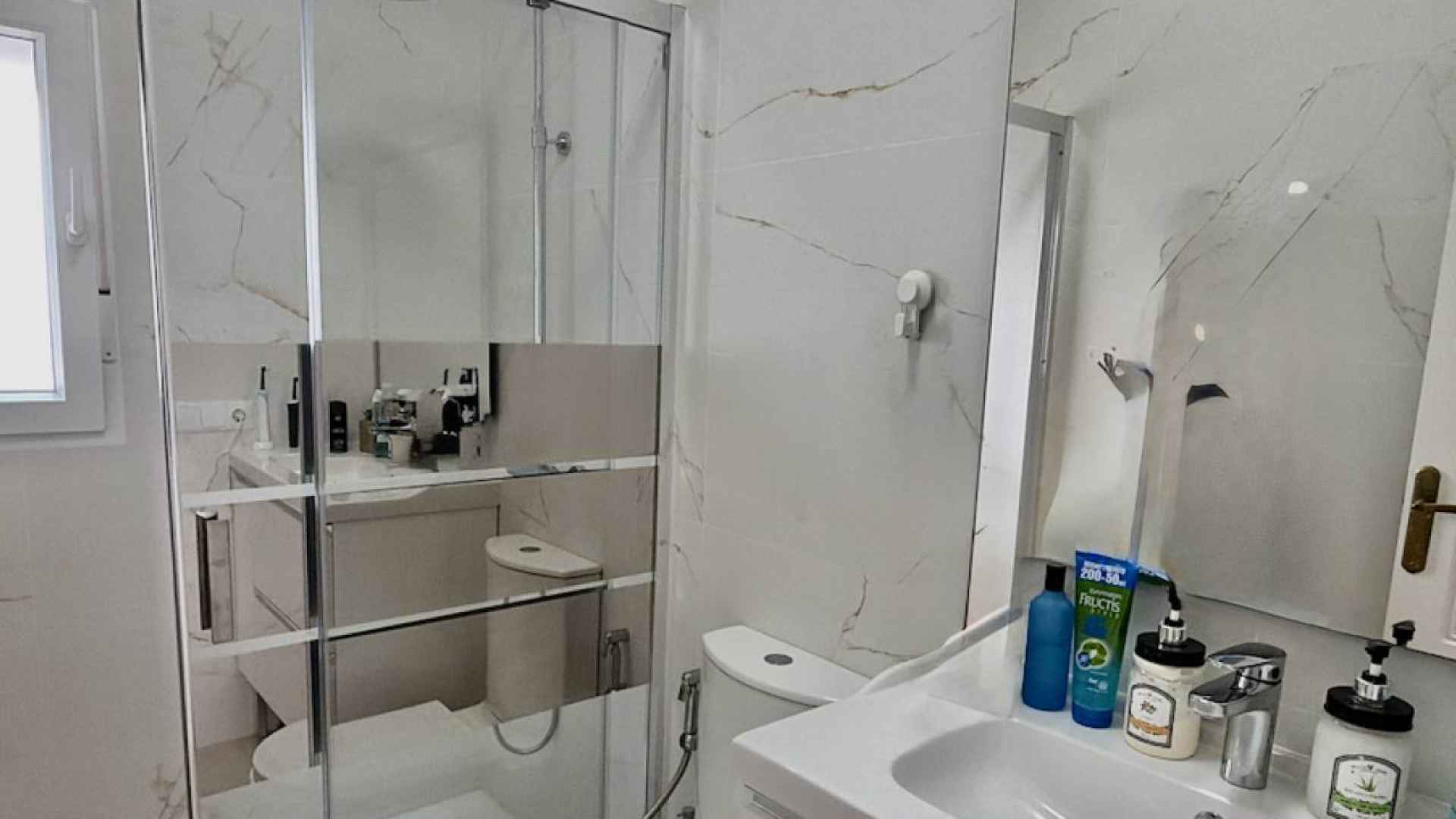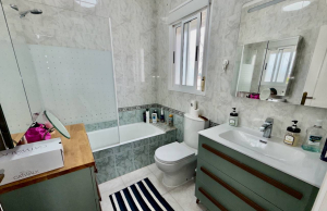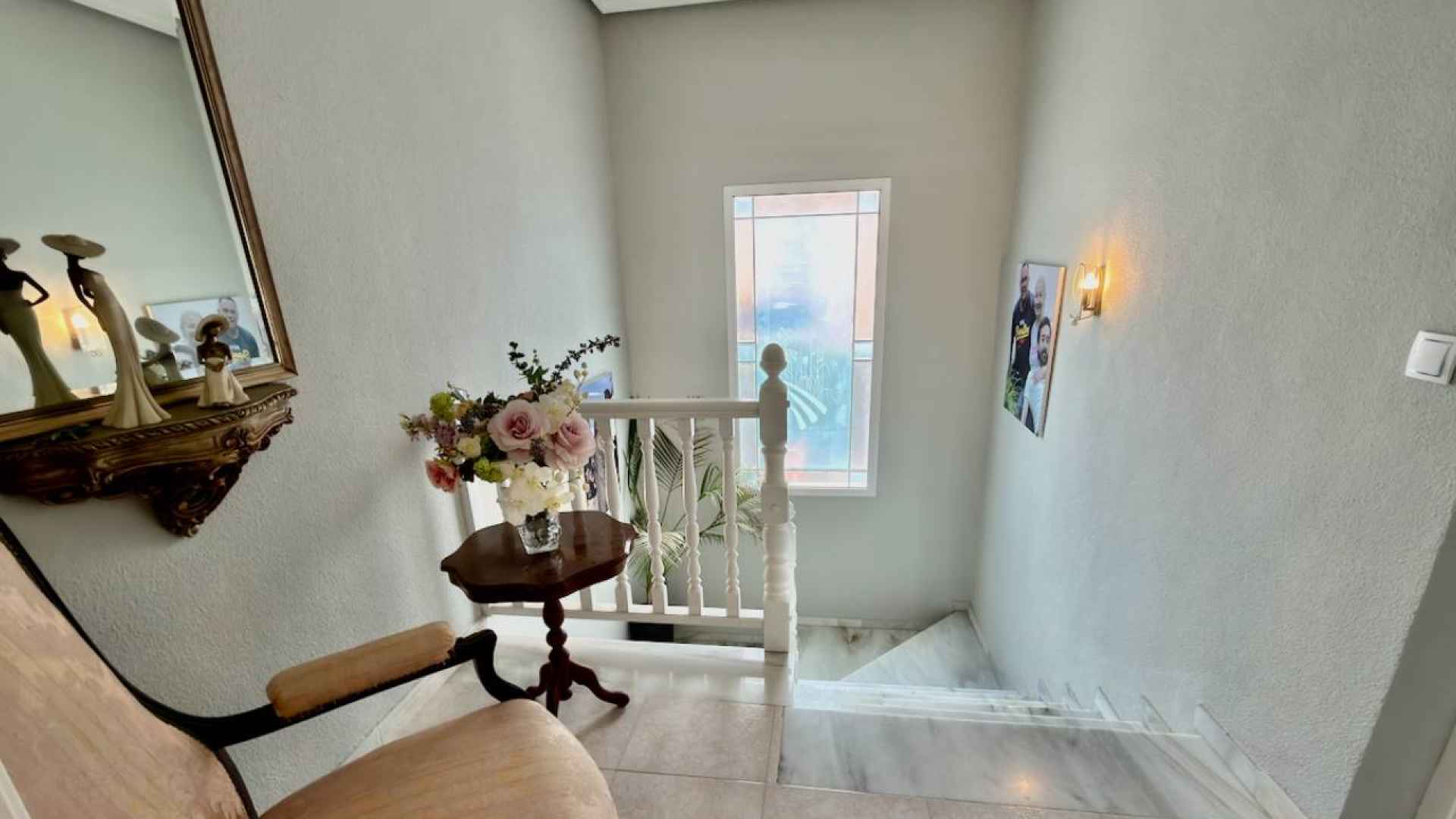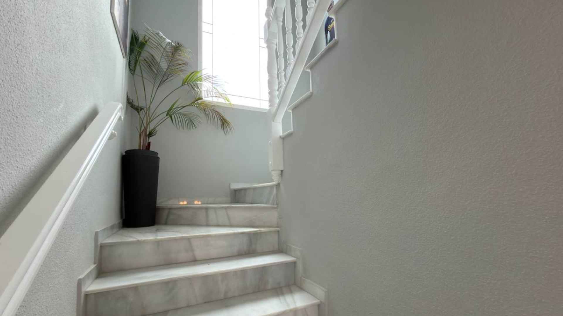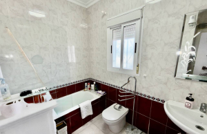 A marble staircase from the living room leads upstairs where you will find two further double bedrooms each with patio doors leading out to a sun terrace, one of them has an en-suite bathroom, plus there is also a family bathroom, both bathrooms have bathtubs.
