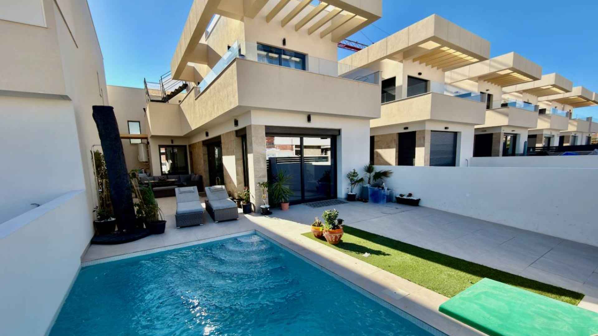 Los Montesinos is a typical Spanish village and boasts all amenities you could want including; bars, restaurants, a fabulous main plaza surrounded by coffee shops, several bus routes plus a municipal pool and football ground. This village hosts regular Spanish fiestas all year round. Los Montesinos is situated 10-15 minutes from the award winning blue flag sandy beaches of Guardamar del segura and is only a short drive from various stunning golf courses such as La Finca, Vistabella and La Marquesa. The city of Torrevieja is also just 10 minutes away and both Alicante and Murcia airports are about a 35-40 minute drive with the new Corvera airport reached in under an hour.
