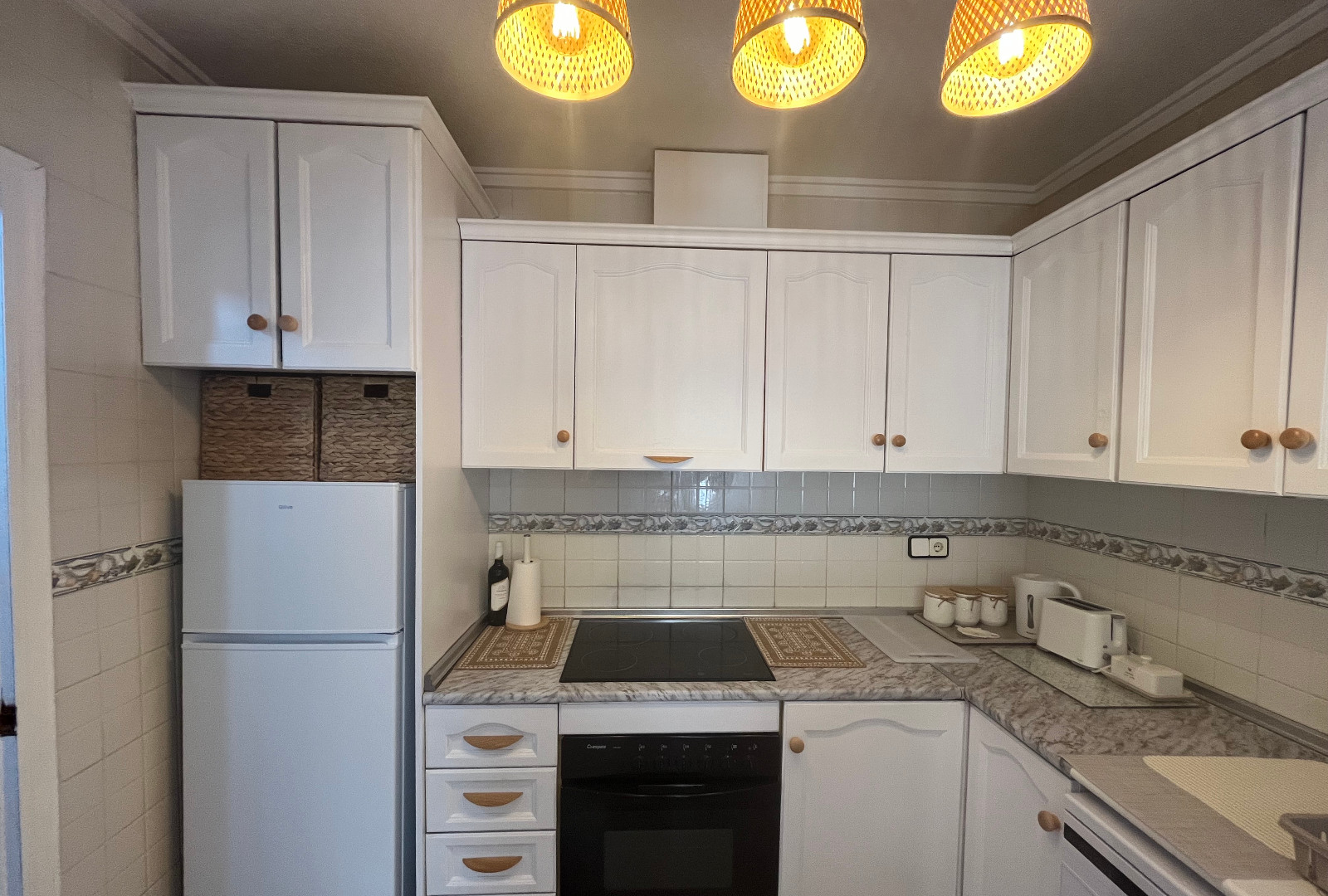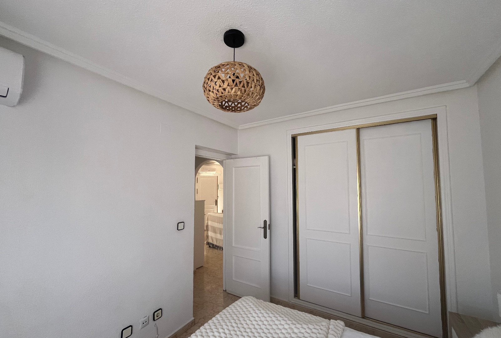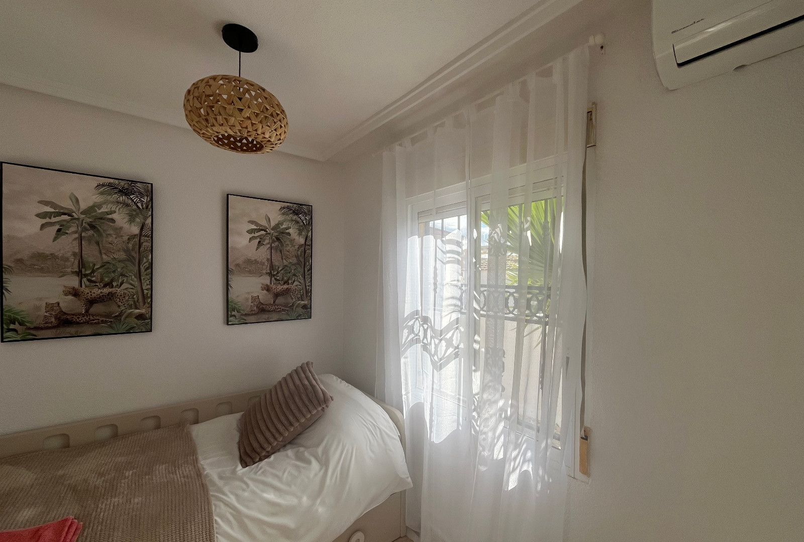Internal stairs lead to the upper level, where you will find the main bedroom, featuring fitted wardrobes, hot and cold A/C, and access to a private sun terrace with lovely views over the communal swimming pool. This floor also includes a shower room and an additional rear door that opens directly onto the private solarium, ideal for sunbathing, relaxing, or enjoying the Mediterranean climate.