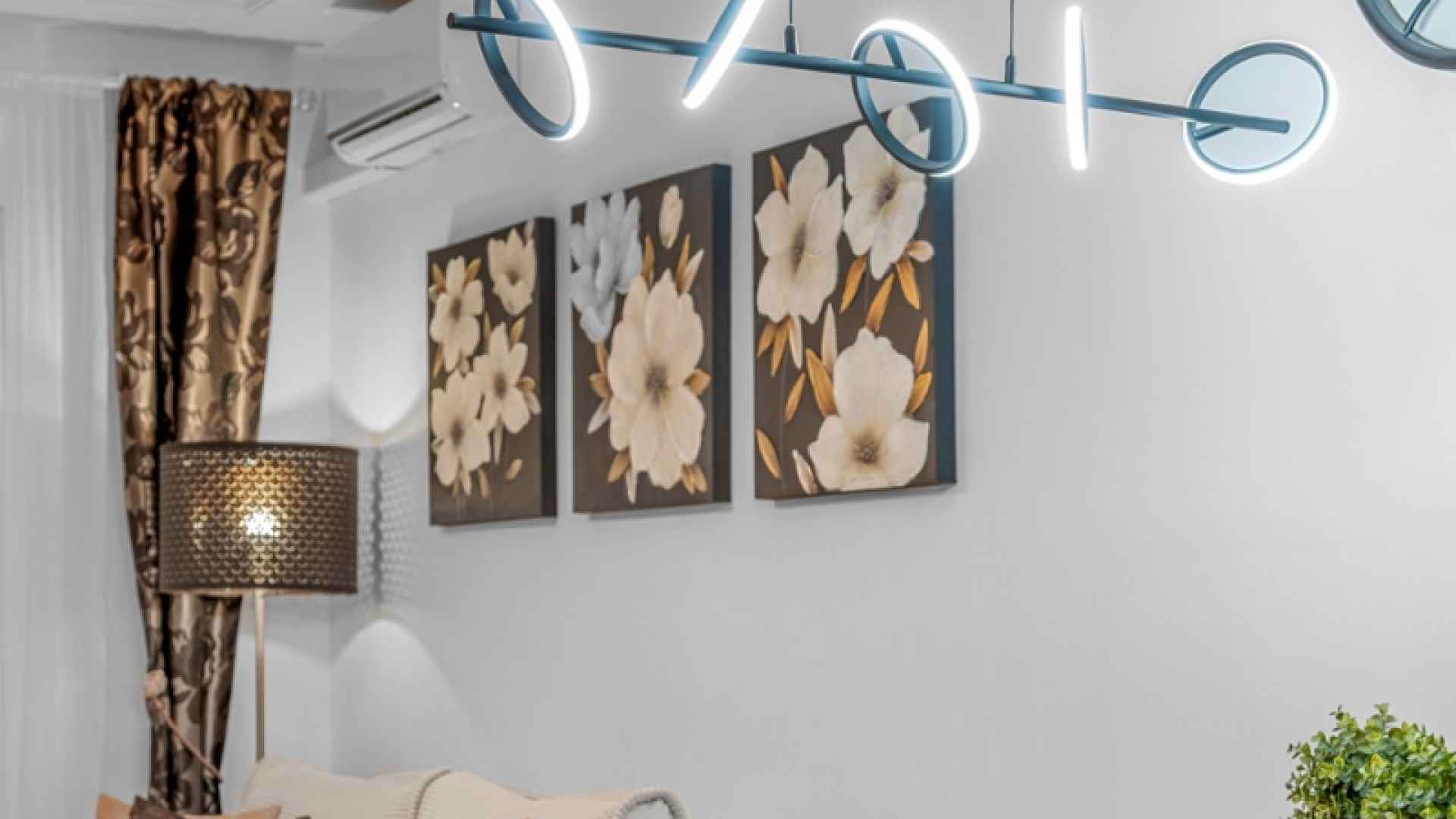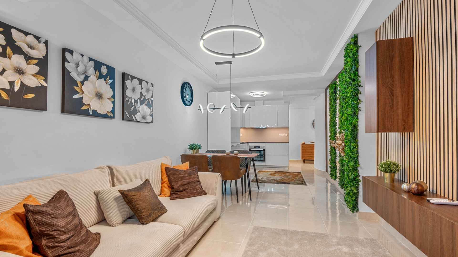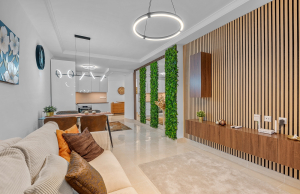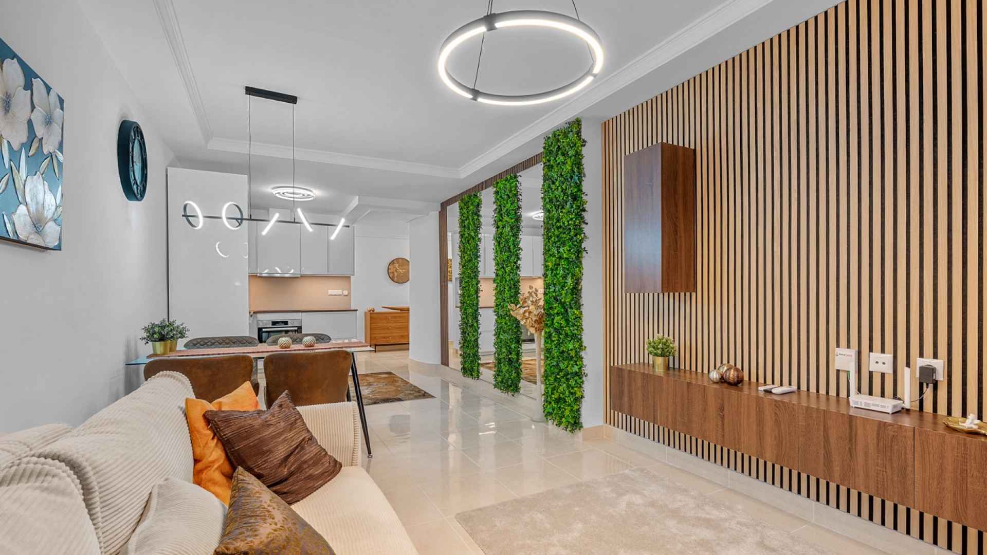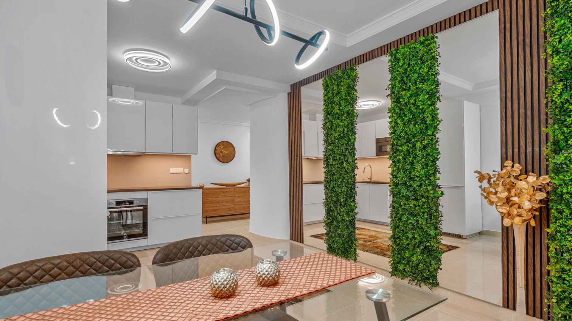 The interior is finished in a modern, minimalist style, blending elegant white tones with warm wood and touches of natural greenery.