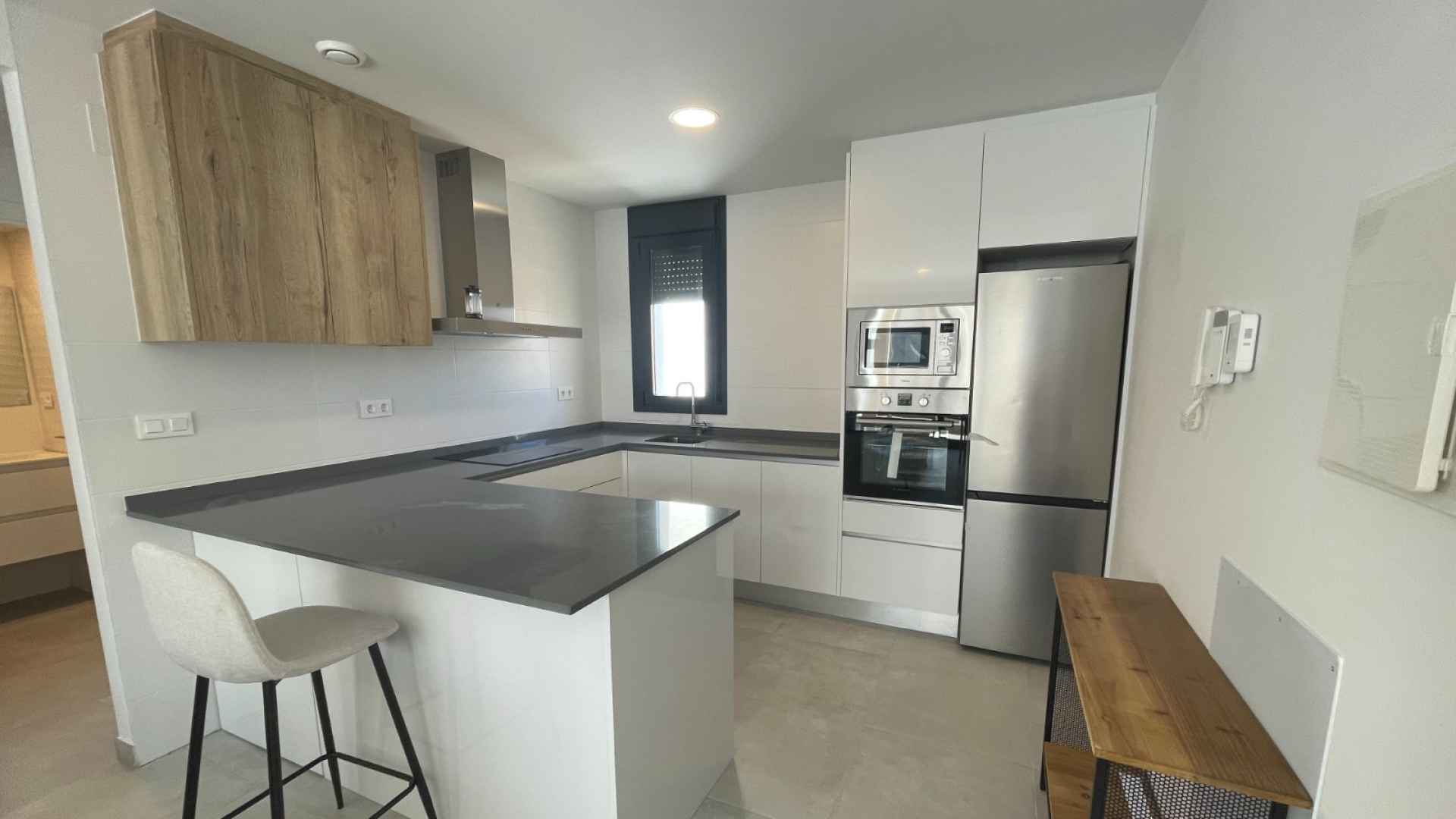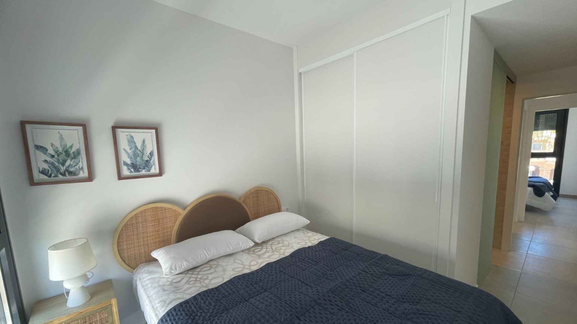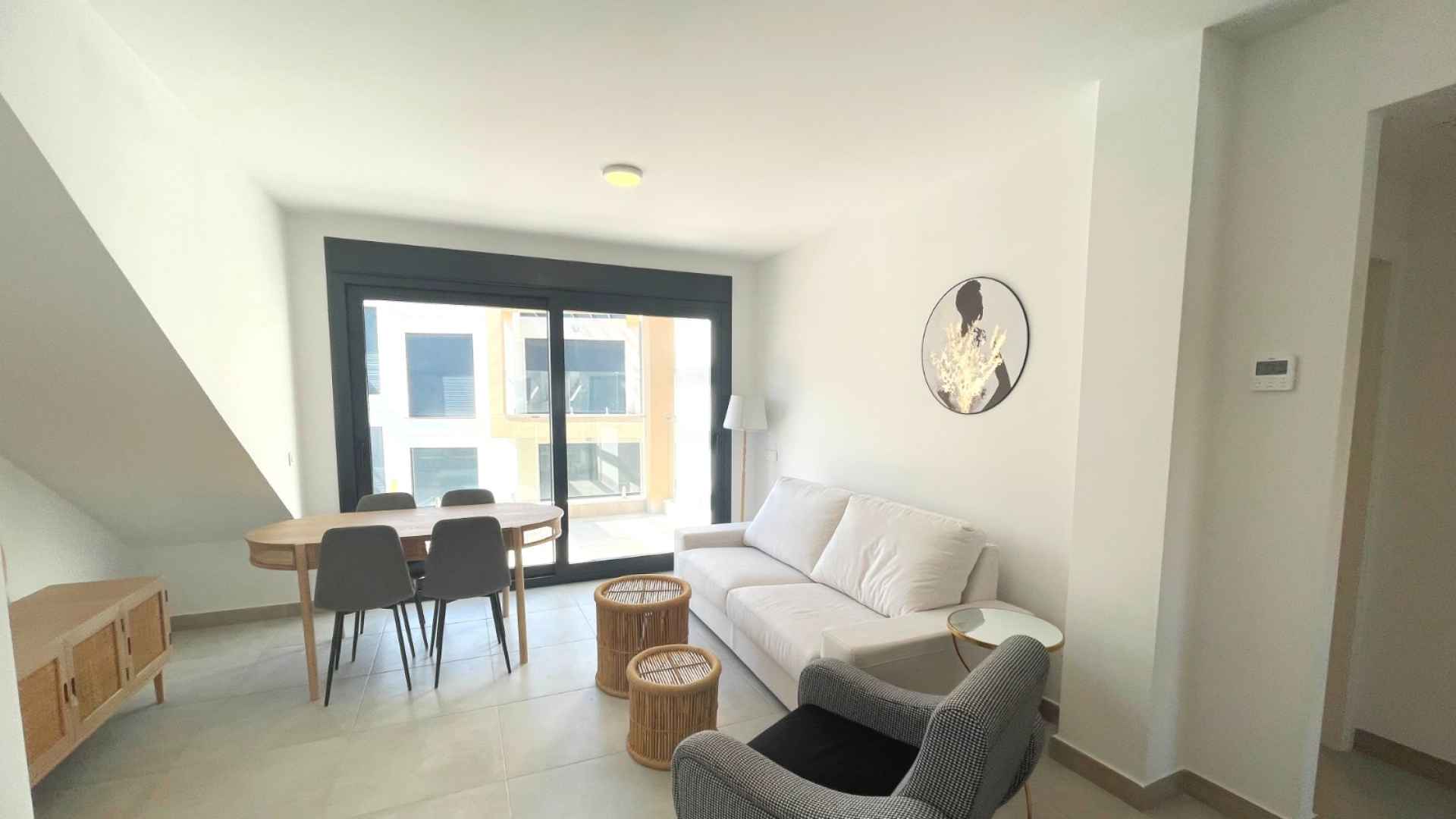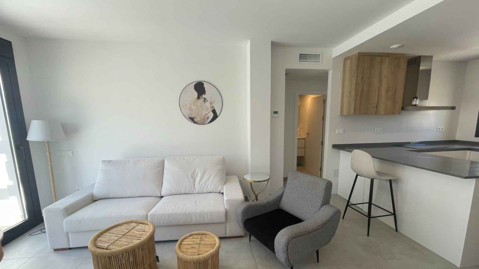 Built in 2023, this stylish first-floor apartment boasts a modern design and bright interior. The open-plan living area features double sliding doors leading out to a partly covered sun terrace with views over the beautifully laid out communal pool area. The spacious fitted kitchen which is open plan to the living room offers ample work and storage space along with a breakfast bar. There are also two double bedrooms, both with built-in wardrobes, and two sleek shower rooms with under floor heating, one of which is en-suite.