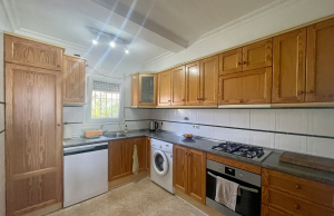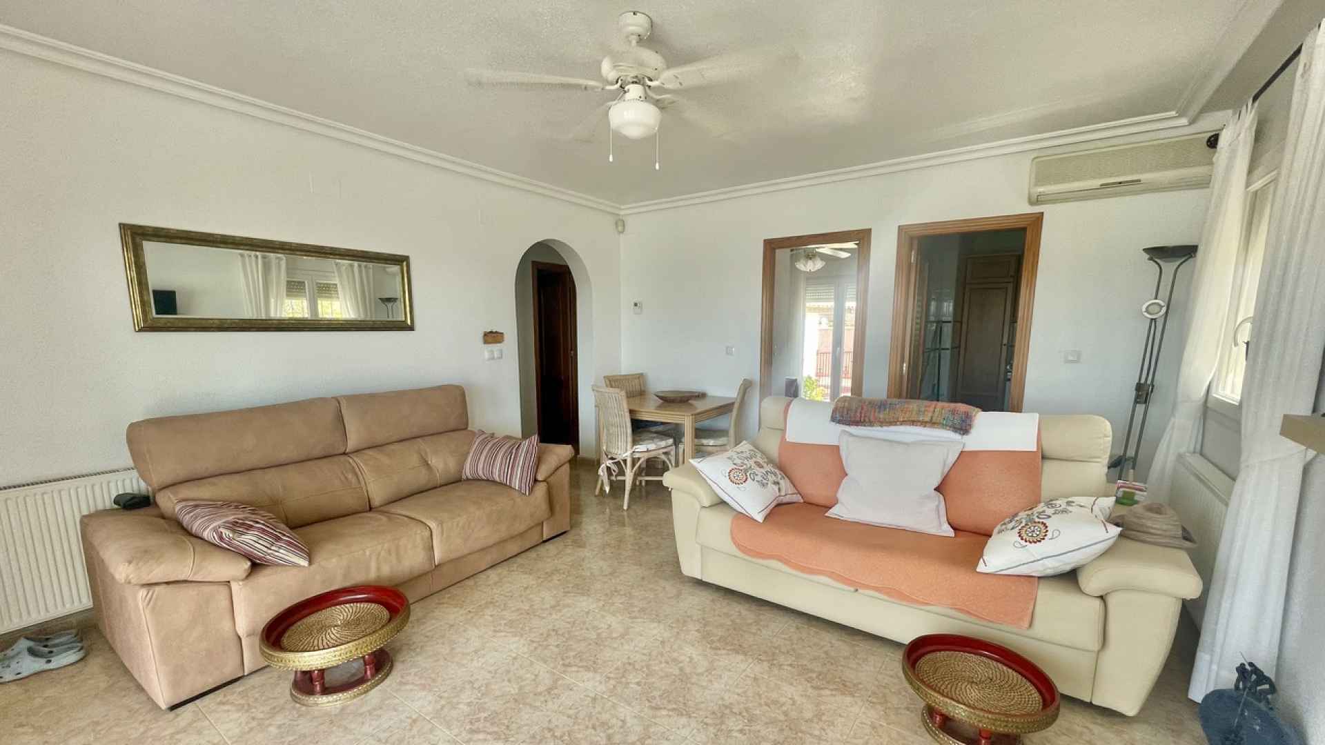 Inside, the property offers generous living space filled with natural light and all ideally set out over one level. Upon entering from the front raised sun terrace, you are welcomed into a spacious living room with large bi-fold doors, bringing the outside indoors. The separate, fully equipped fitted kitchen provides ample space for cooking and entertaining. The villa boasts three well-proportioned bedrooms, including a master suite with en-suite bathroom, a second large double bedroom, plus a third bedroom overlooking the garden, which would be deal as a guest room or office. There is also a large family bathroom.