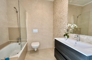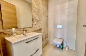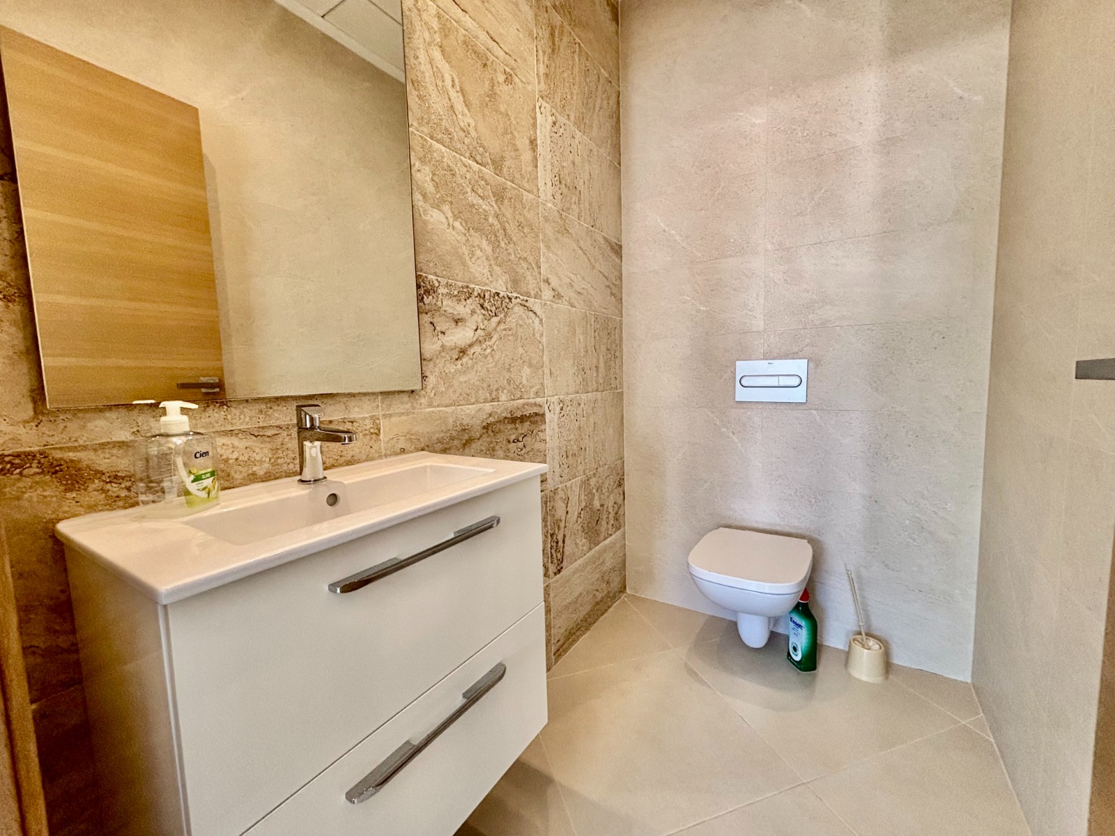 The villa itself is very spacious and offers 2 floors of bright and airy, modern style accommodation with the ground floor housing: a large lounge-diner, a well-appointed designer kitchen with plenty of workspace and storage along with top of the range appliances, a utility room, one double bedroom with fitted wardrobes and its own en-suite shower room, plus an additional guest toilet. The downstairs bedroom also features large patio doors which leads out the pool area.
