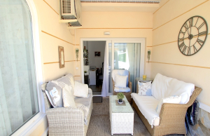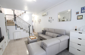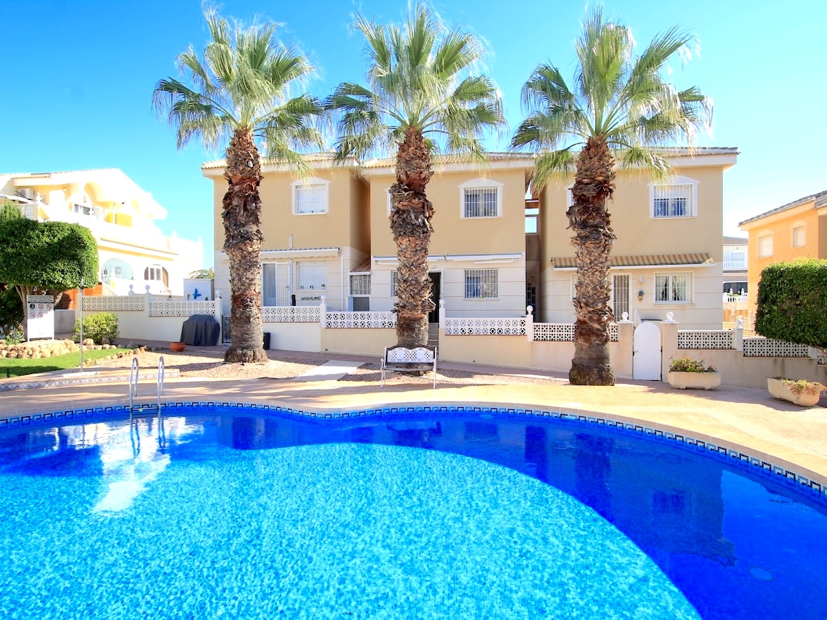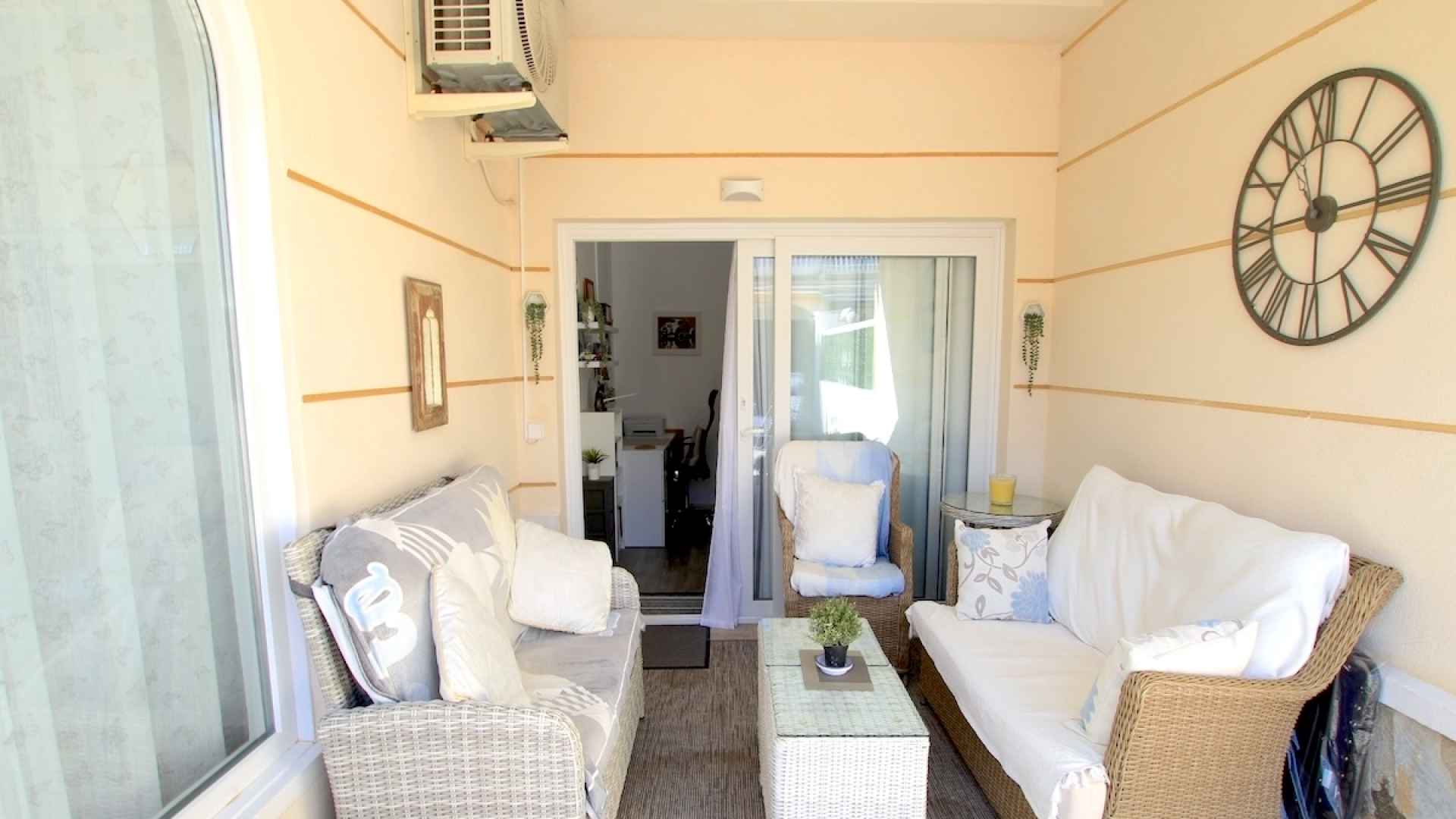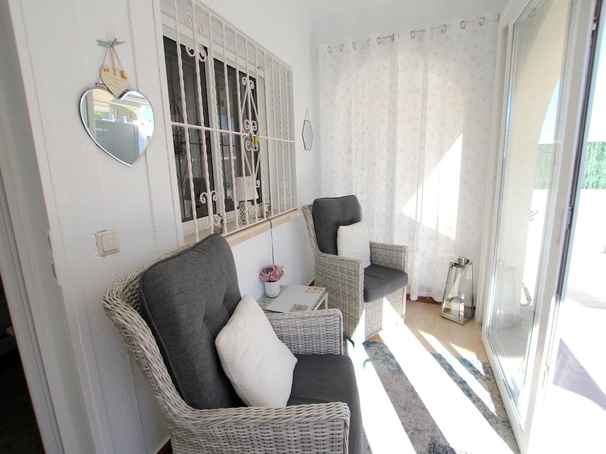 This popular style of property offers two levels of accommodation with the ground floor comprising of; a large East-facing glazed patio provides the ideal spot for morning coffee, a spacious, bright and airy lounge-diner featuring elegant décor, one double bedroom with fitted wardrobes (currently used as a formal dining room), a modern shower room, plus a designer fitted kitchen with ample workspace and storage, and a door leading out to the rear of the property which opens directly onto the communal pool and gardens, perfect for entertaining or enjoying the Spanish sunshine.
