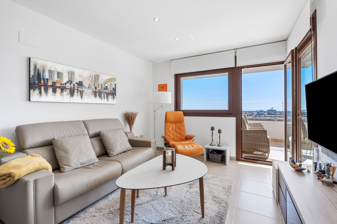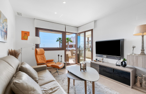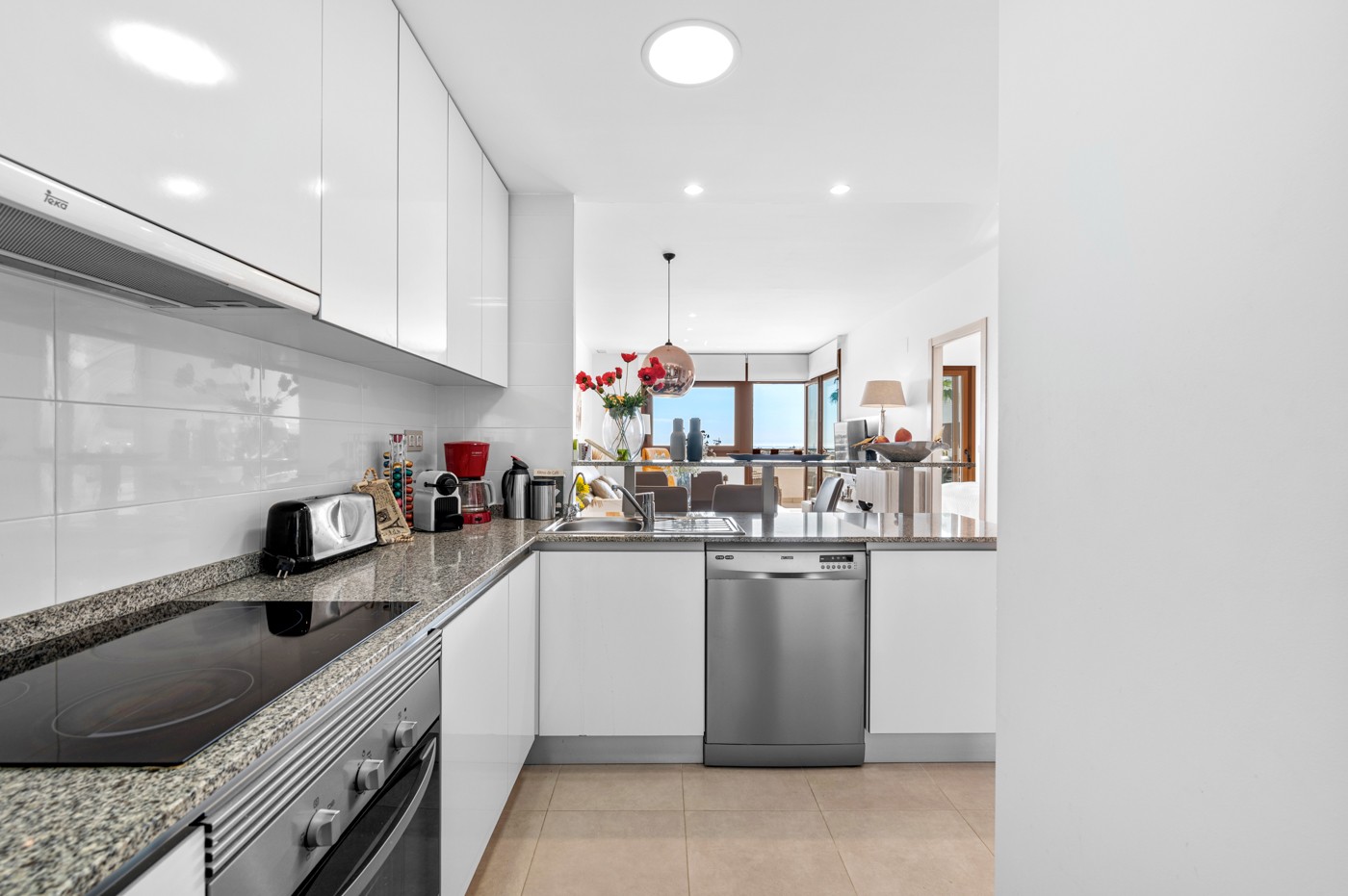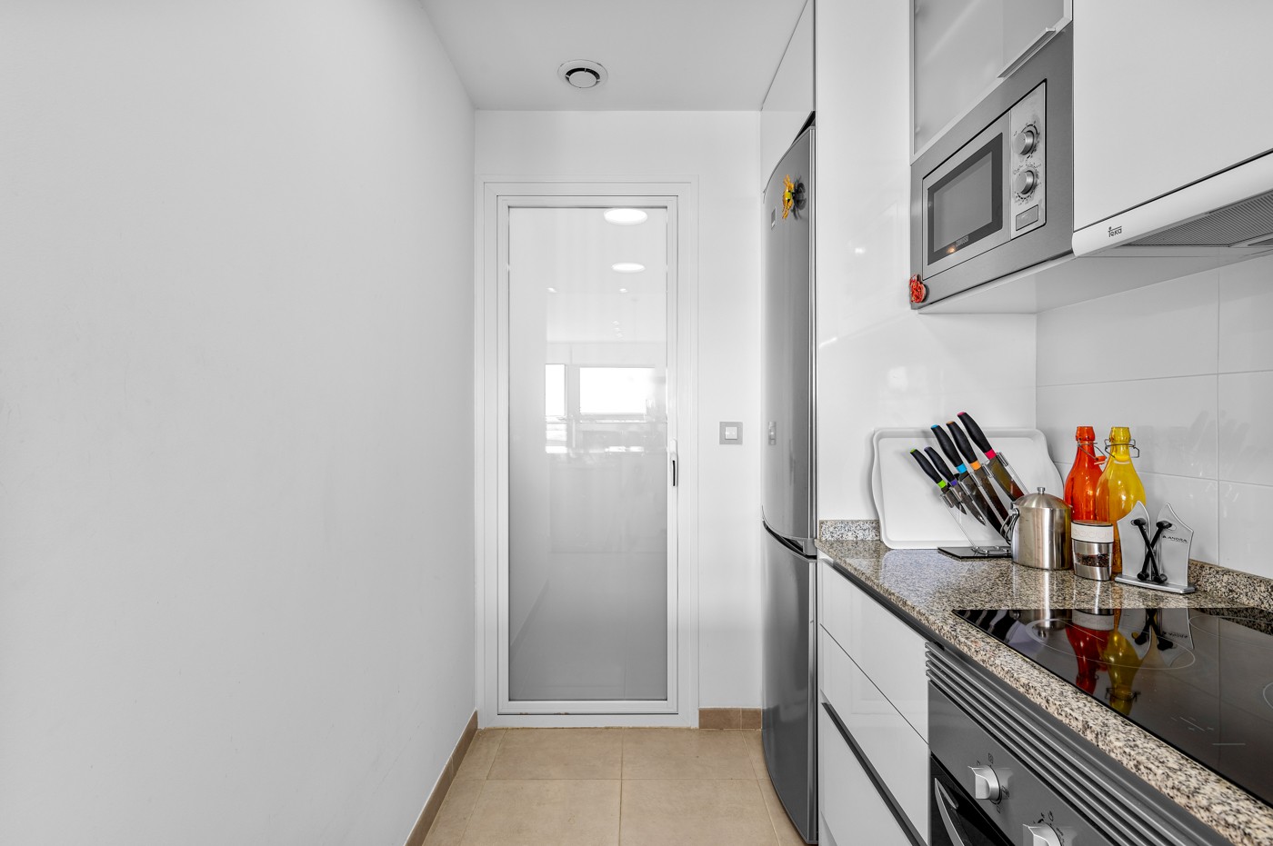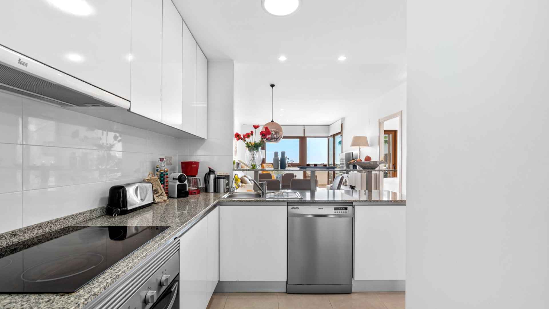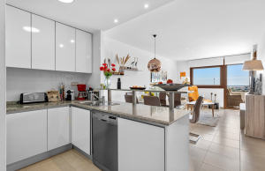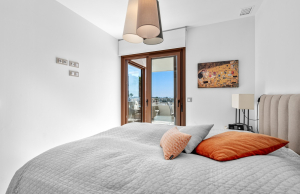 This beautiful, South-facing modern apartment benefits from high ceilings and large windows that allow for plenty of natural light. The lovely, spacious, sun terrace boasts fabulous sea views and is accessed from the living room and is the perfect spot to relax or enjoy dining all fresco. The apartment comprises of two bedrooms, with the master bedroom benefiting from fitted wardrobes, a door leading out onto the sun terrace and an en-suite bathroom with a shower, whilst the guest bedroom also has fitted wardrobes and is served by the house bathroom. The living room is bright and airy and flows into an open plan, stylish fitted kitchen with a separate utility room.