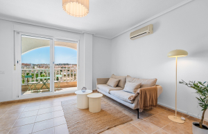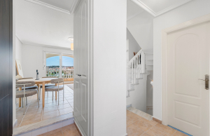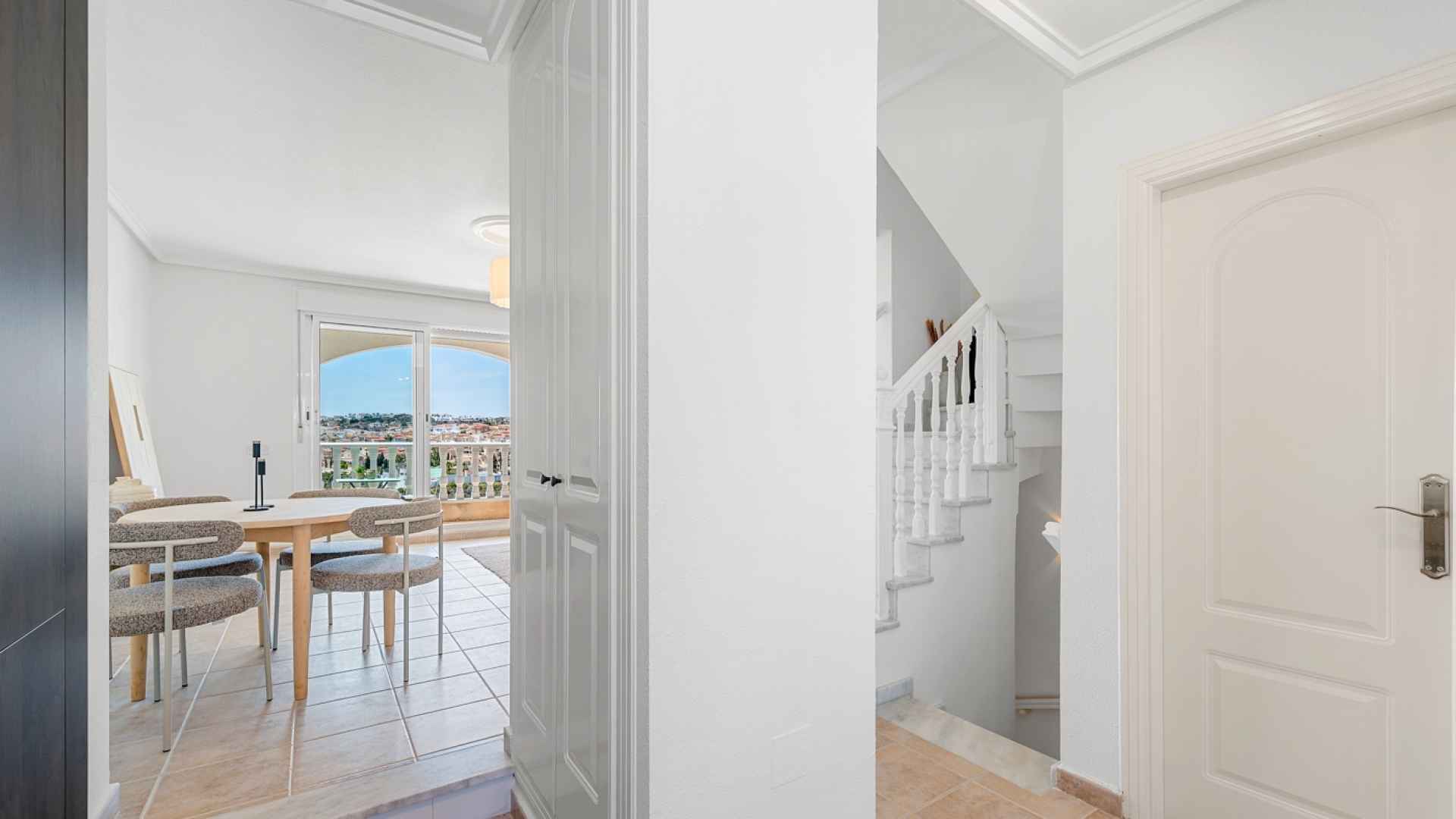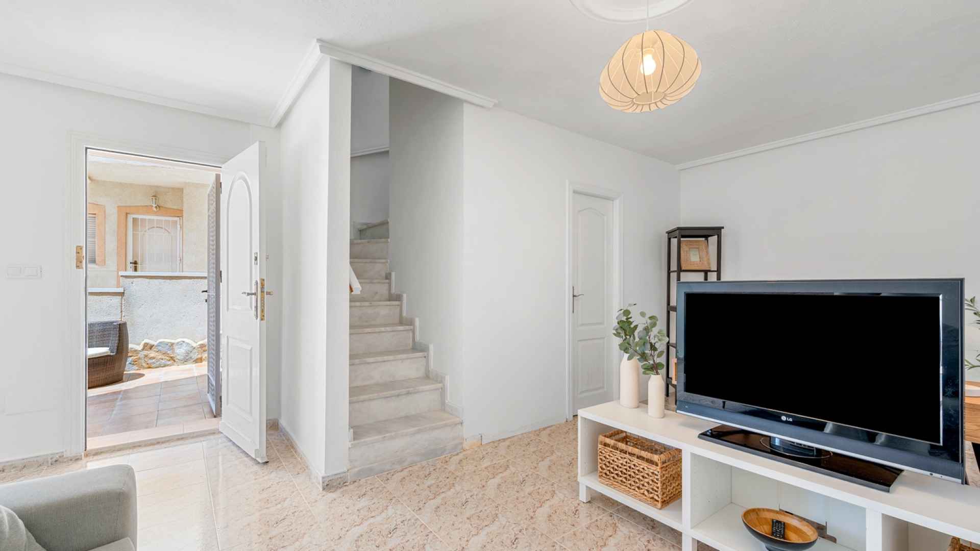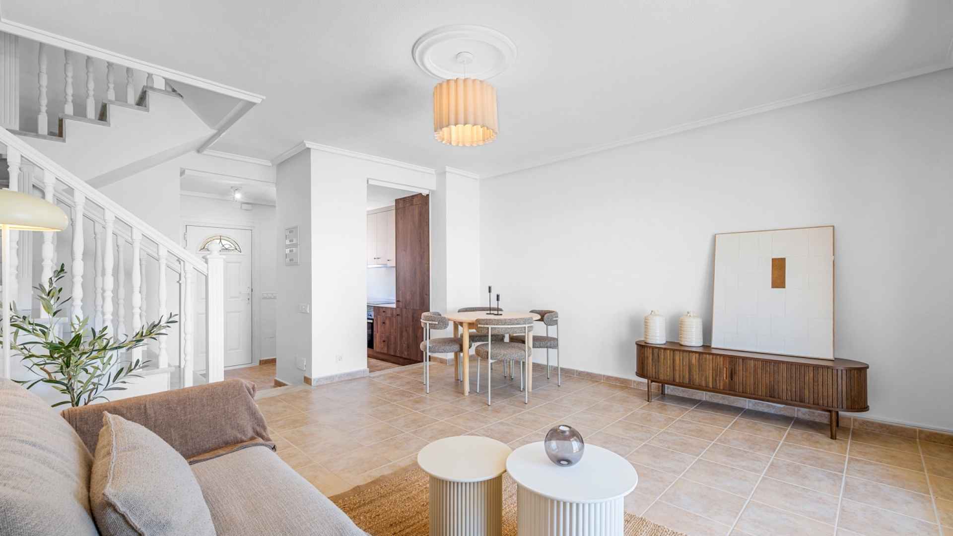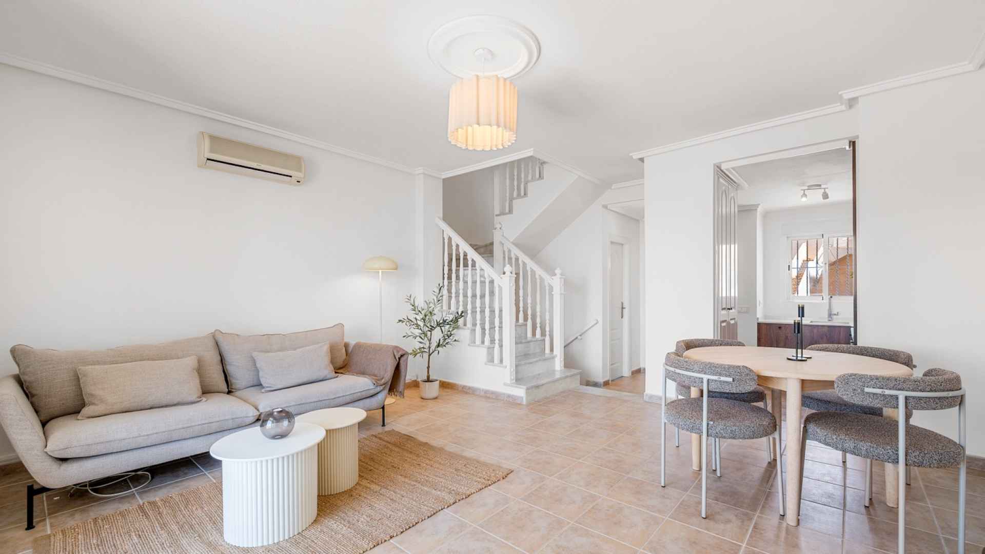 Built in 2006, the property sits on a 137m2 plot and features 105m2 of interior living space thoughtfully distributed across three levels. The main floor welcomes you with a recently renovated, fully equipped kitchen that flows into the spacious bright and open plan living room with both dining and lounging areas. This level also includes a guest toilet and two lovely outdoor spaces; a southwest-facing balcony with open views toward the La Marquesa golf course and green zones, and a charming front patio facing the quiet street, ideal for seating or casual outdoor dining.