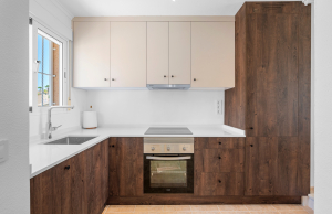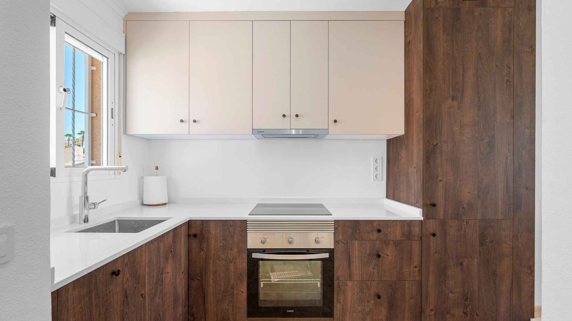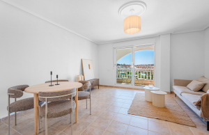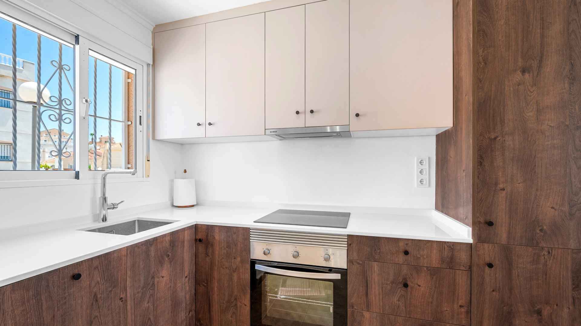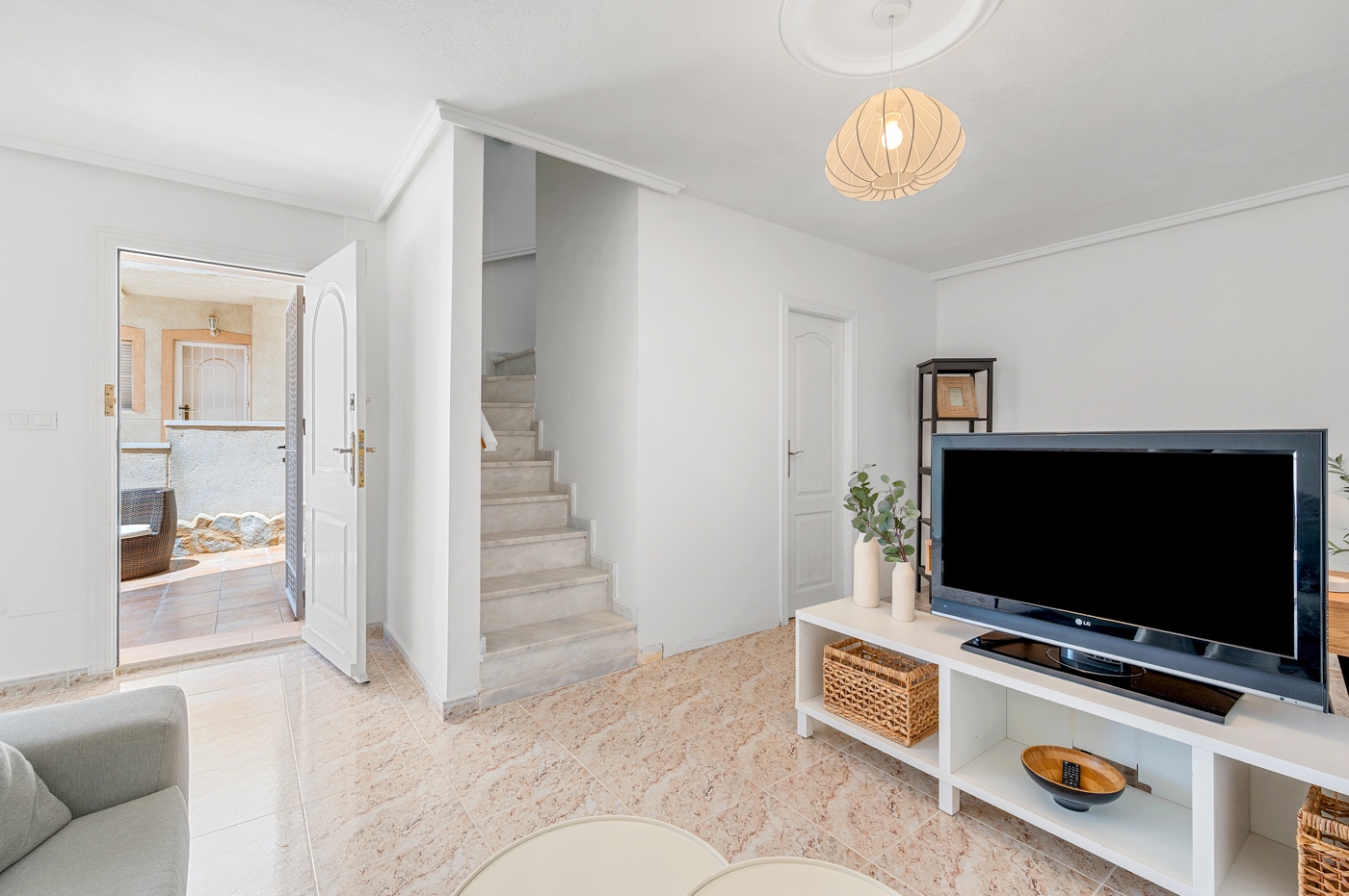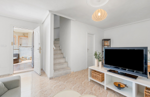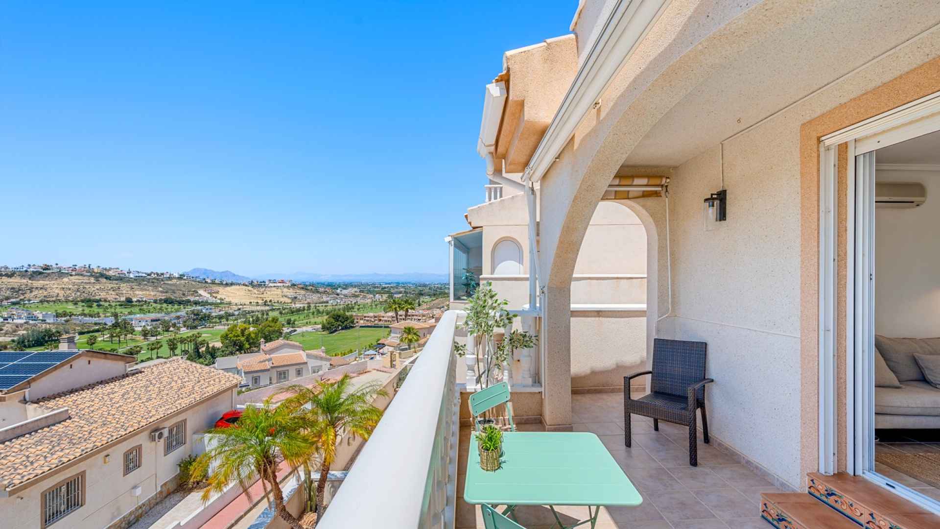 Built in 2006, the property sits on a 137m2 plot and features 105m2 of interior living space thoughtfully distributed across three levels. The main floor welcomes you with a recently renovated, fully equipped kitchen that flows into the spacious bright and open plan living room with both dining and lounging areas. This level also includes a guest toilet and two lovely outdoor spaces; a southwest-facing balcony with open views toward the La Marquesa golf course and green zones, and a charming front patio facing the quiet street, ideal for seating or casual outdoor dining.