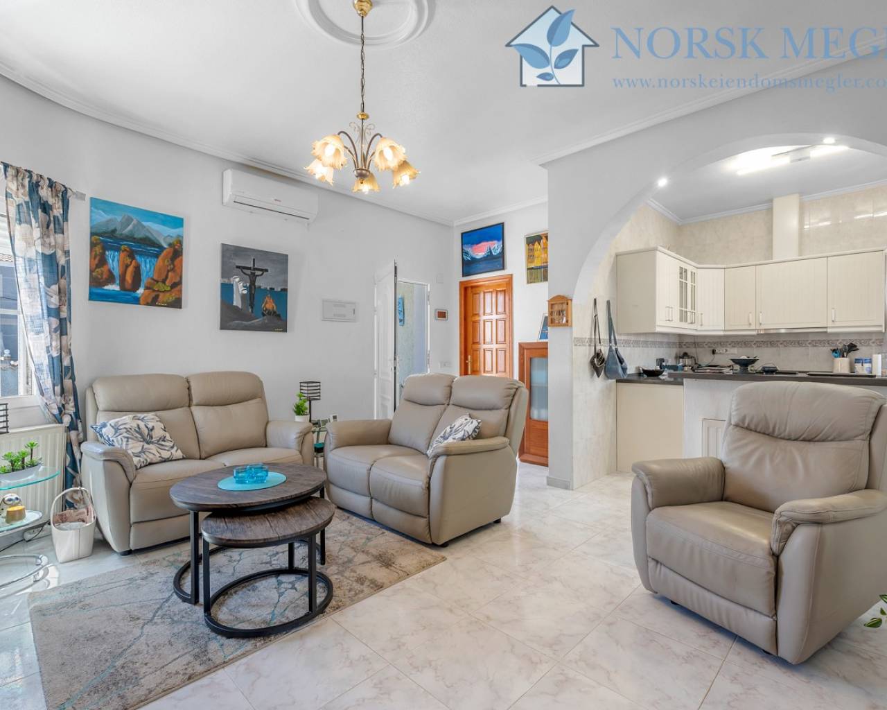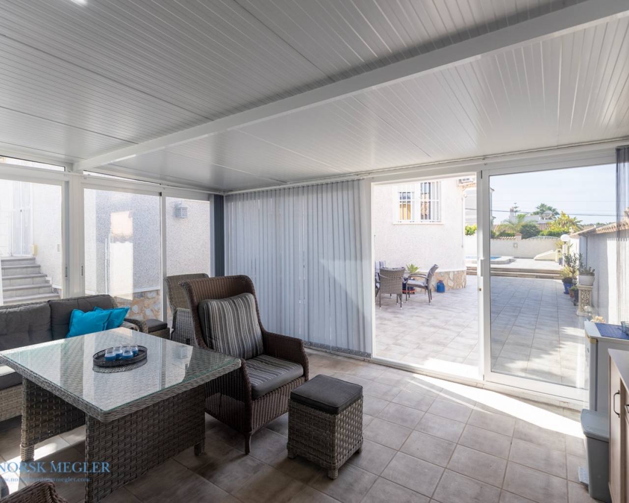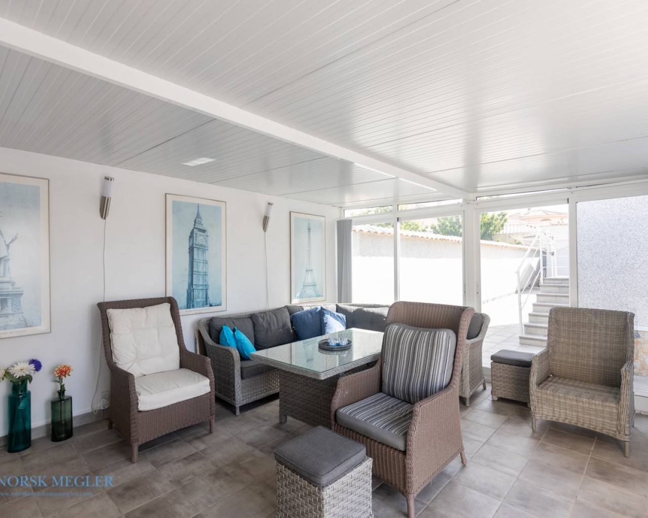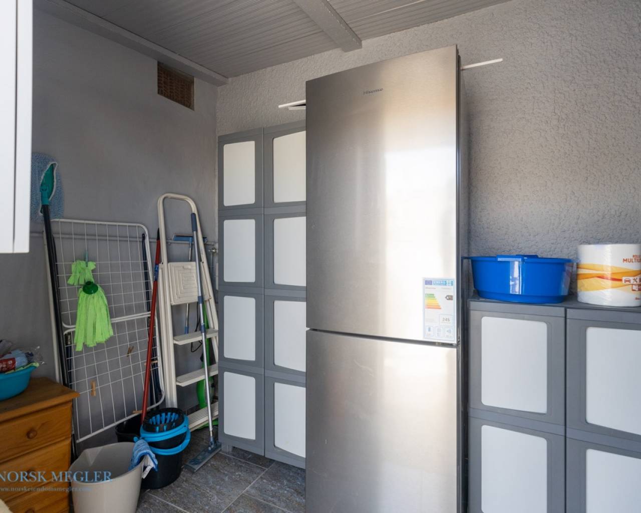 The garden is a great size yet easily maintained and features a newly renovated heated saltwater pool, surrounded by anti-slip tiles that extend throughout the entire outdoor space. There is a carport with electric gate for off-road parking. Due to its South-facing orientation it is a very sunny plot so a pergola has been installed for the welcome shade. Behind the house there is a large storage, and a utility room with a refrigerator.