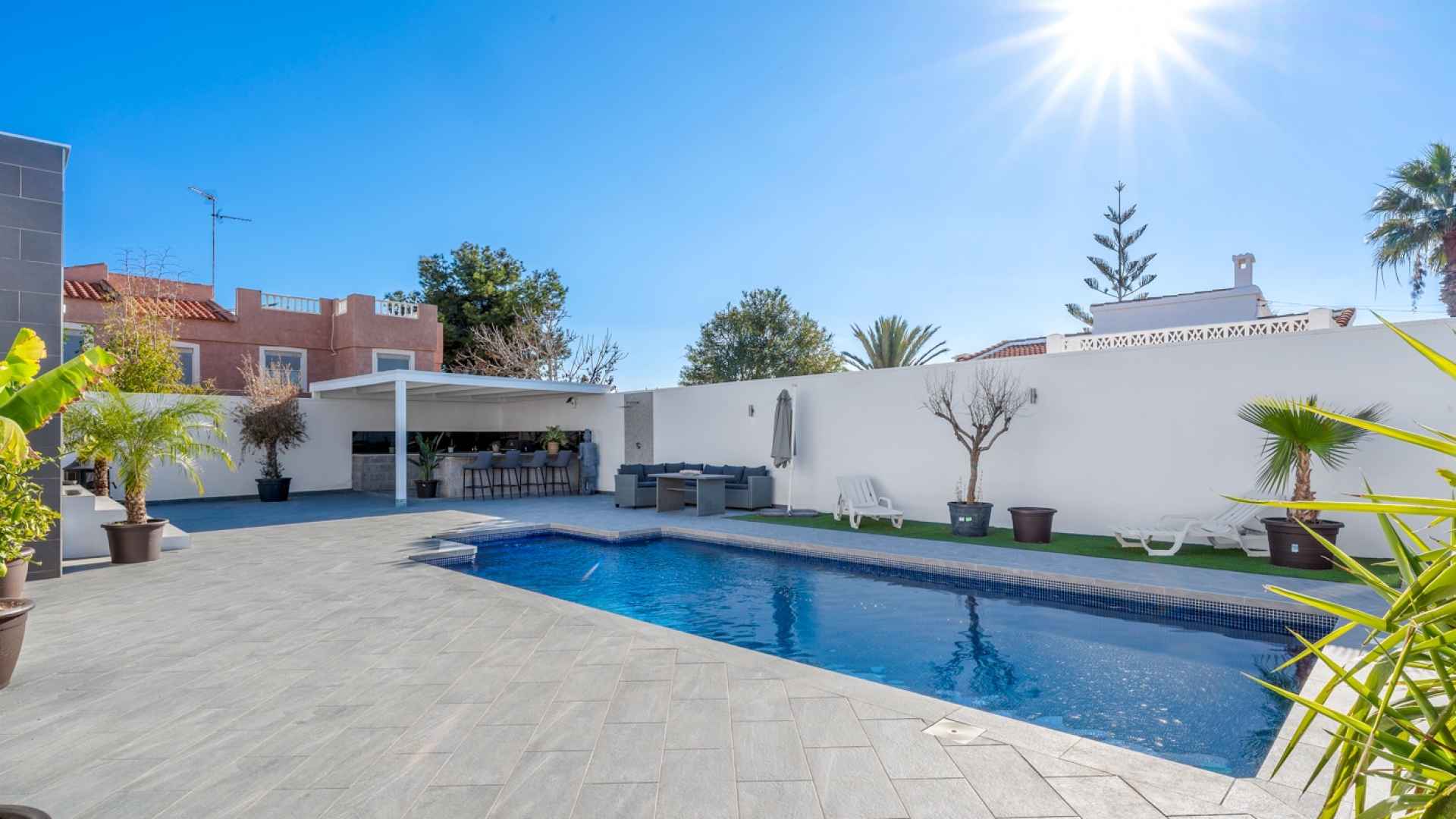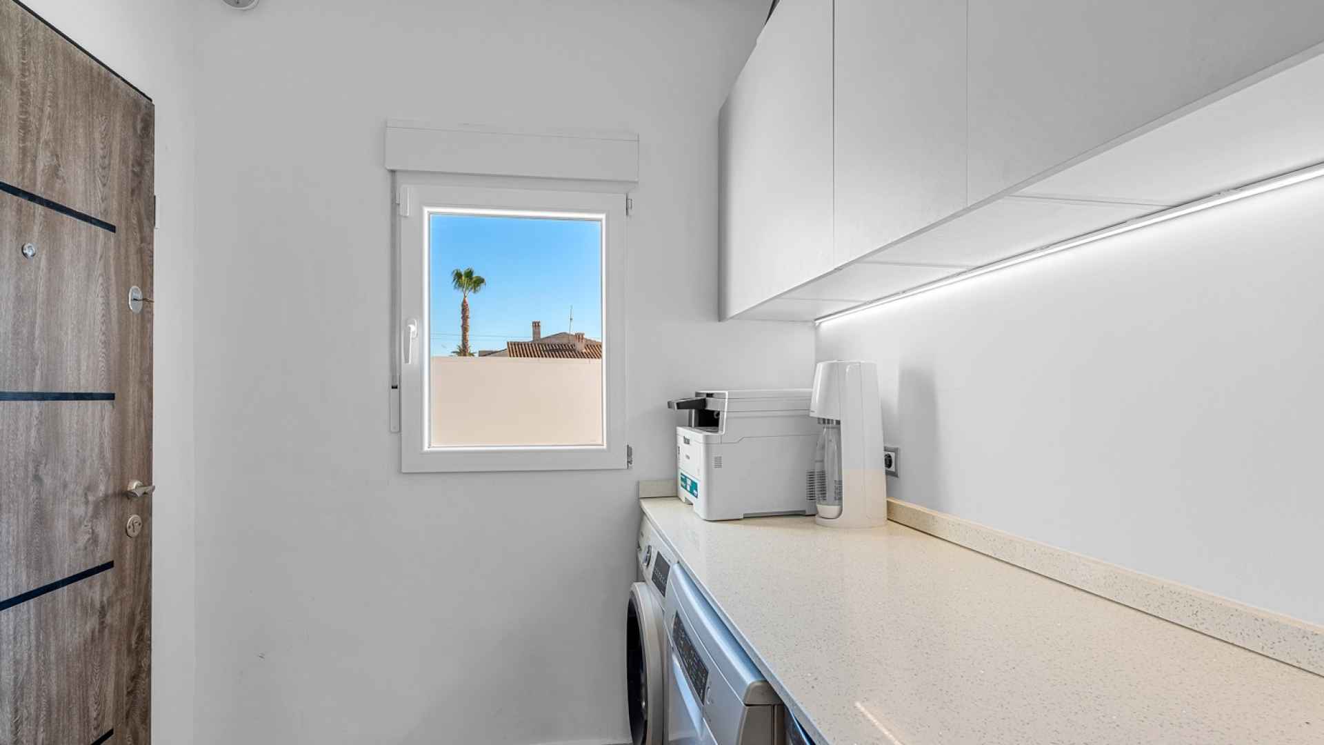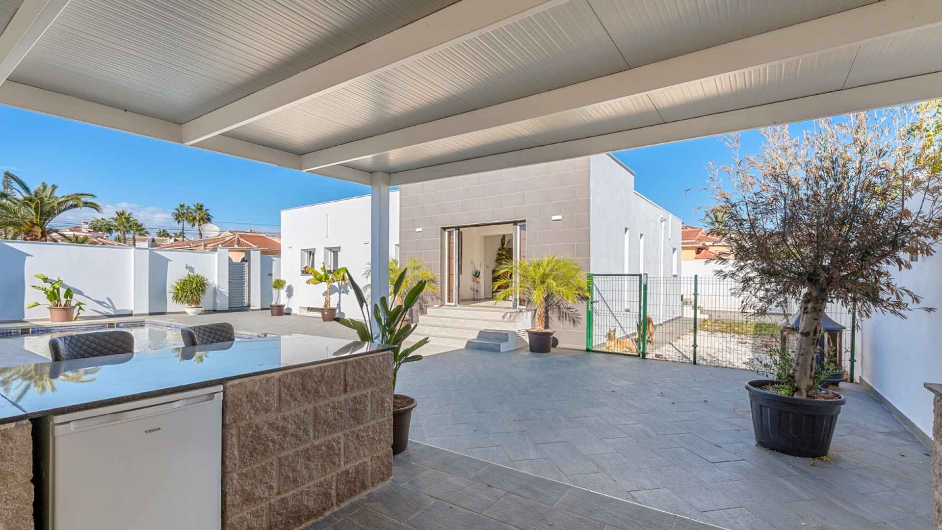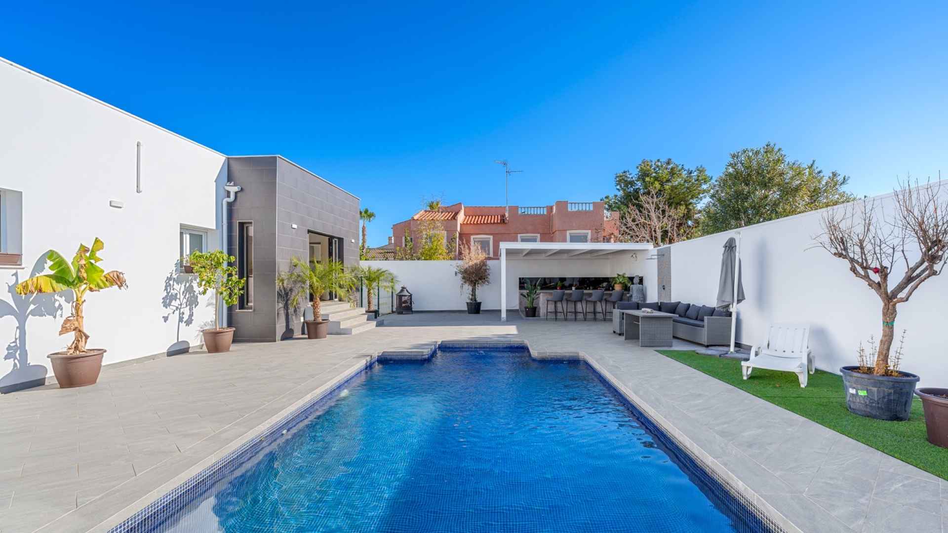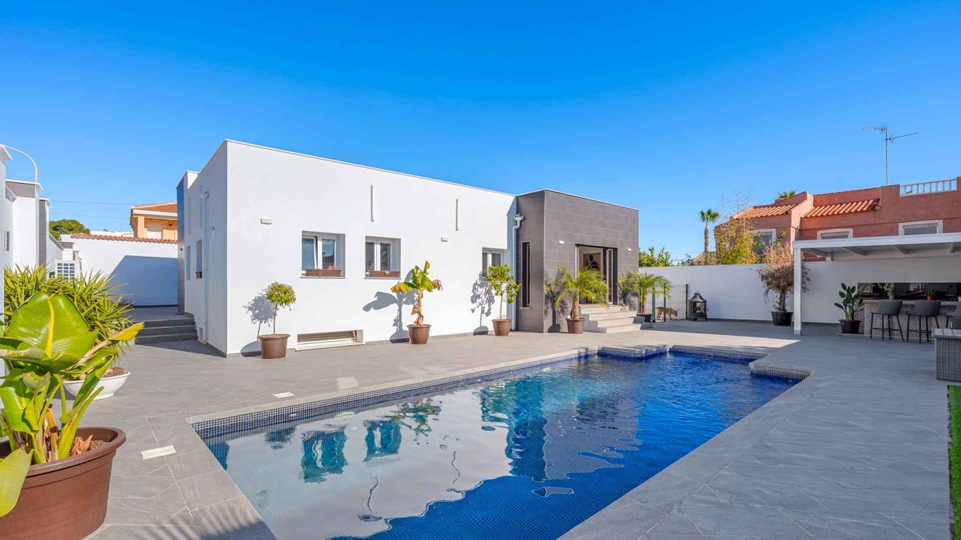 The exterior is designed to make the most of the excellent Costa Blanca climate thanks to a private and very inviting 8x4 metre swimming pool and a fully equipped Summer kitchen, which becomes the perfect place for al fresco meals and gatherings. The South-West orientation allows for all-day sun, and the spacious grounds surrounding the entire house offer ample room for a garden, relaxation areas, or any other project you might wish to develop. Furthermore, the plot has enough space to park two vehicles within its boundaries, ensuring convenience and security.