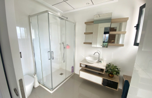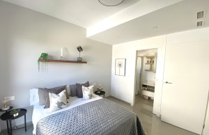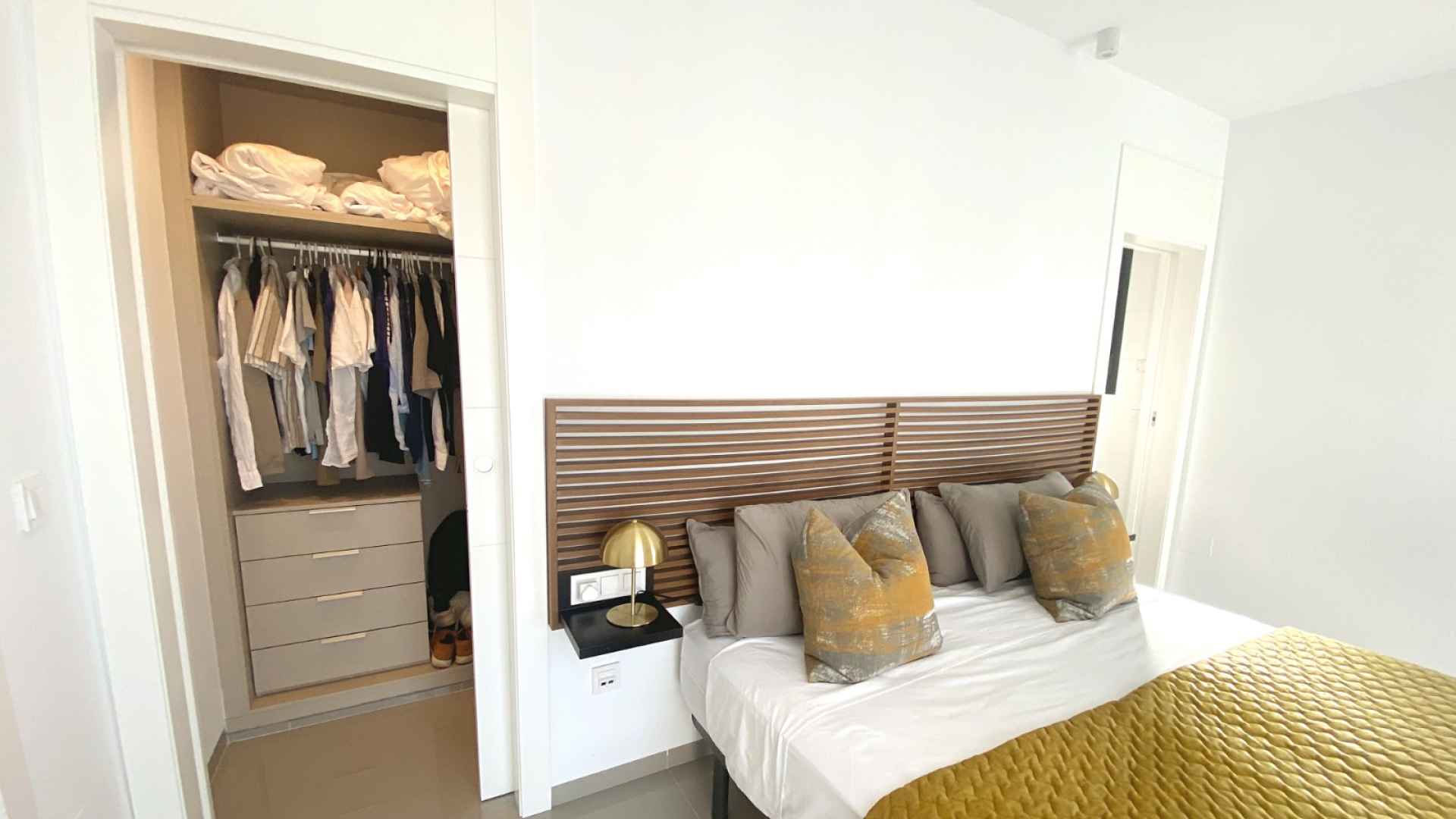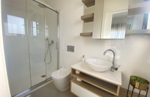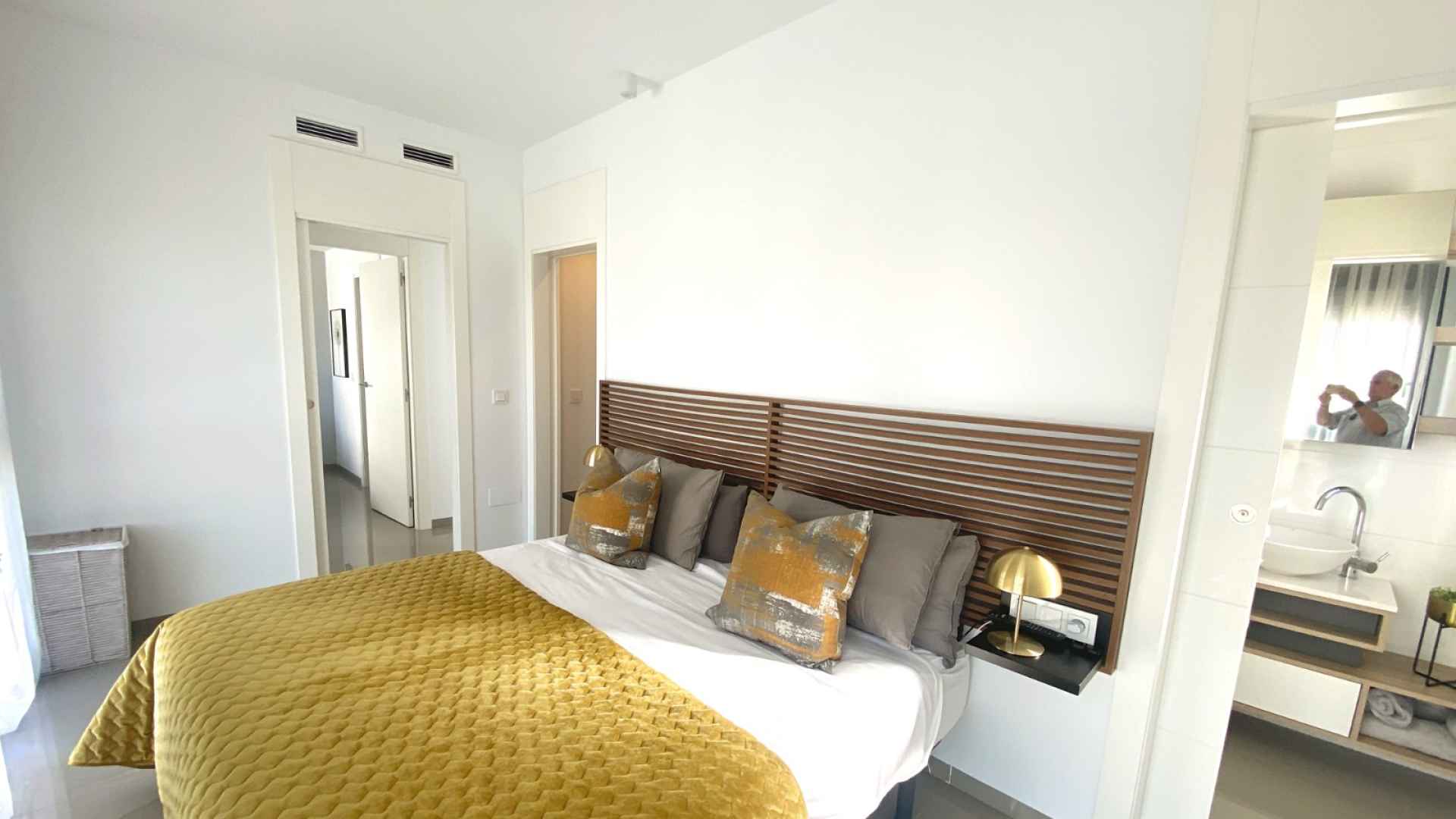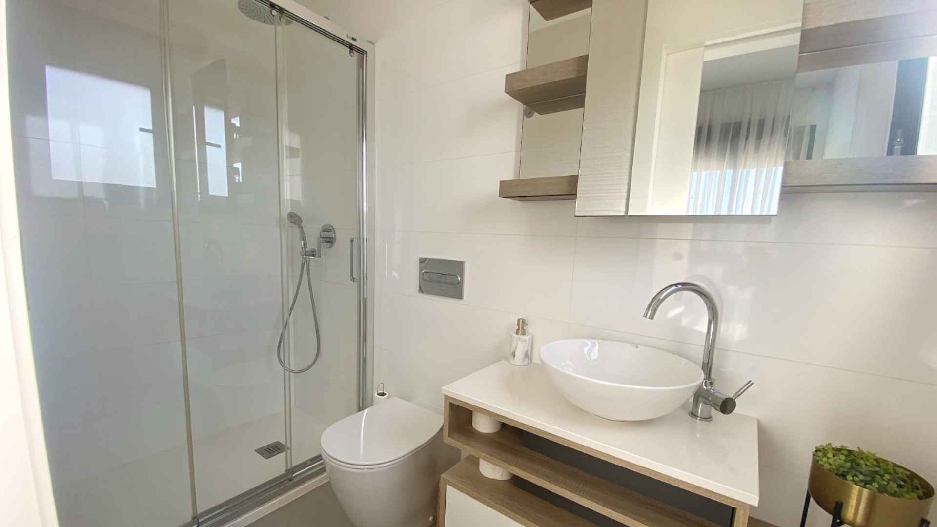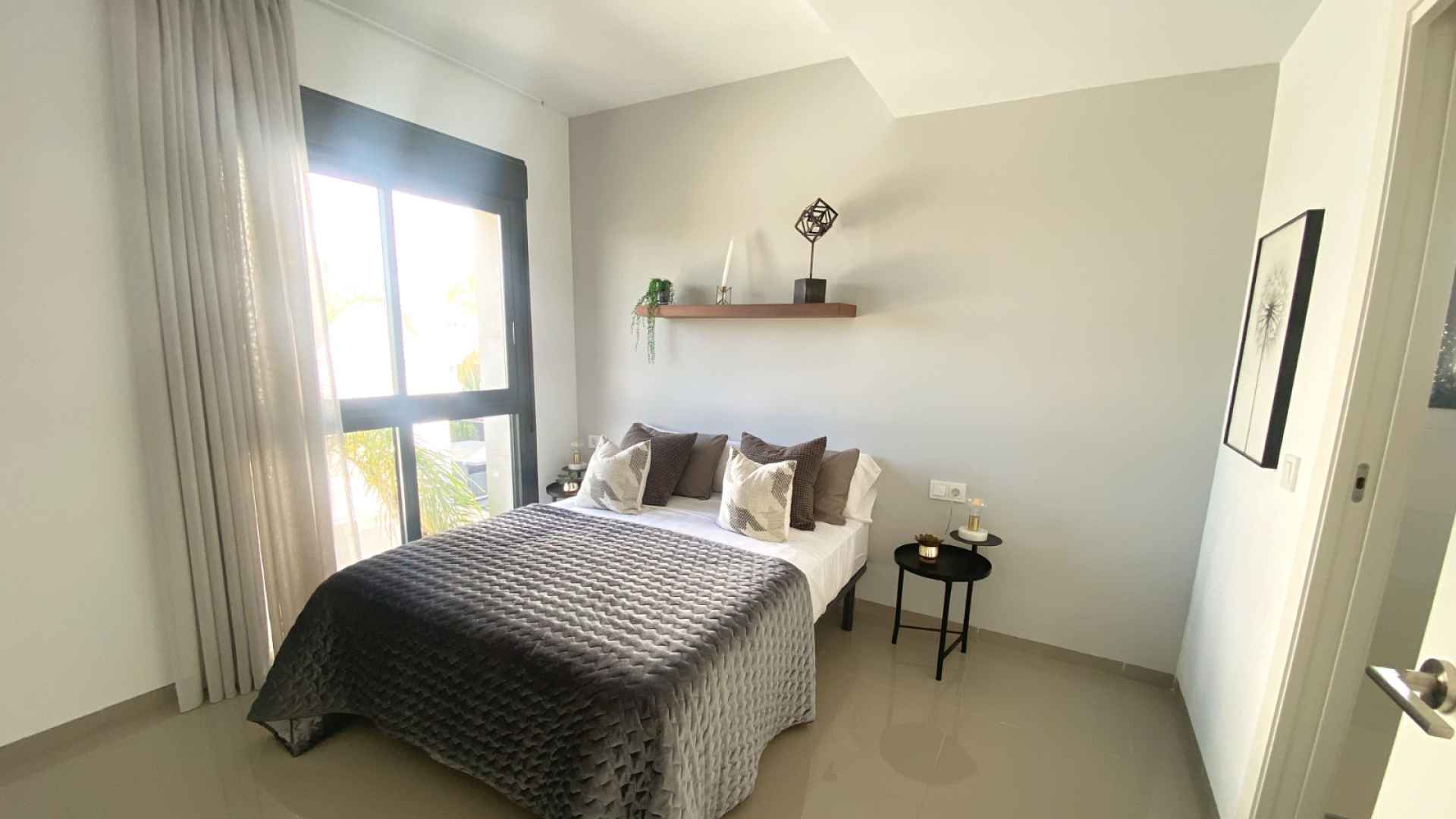 Inside this villa is a large open plan living and dining area with multi aspect patio doors opening onto the pool terraces and gardens which fill the entire ground floor with natural light. There is a part separate, fully fitted new style kitchen complete with all the appliances fittings expected in a design of this quality. Also on the ground floor is large double bedroom and family bathroom. There is excellent use of space for closed in storage which is a rarity for a lot of the new build designs.