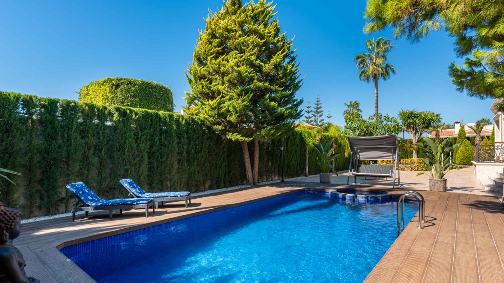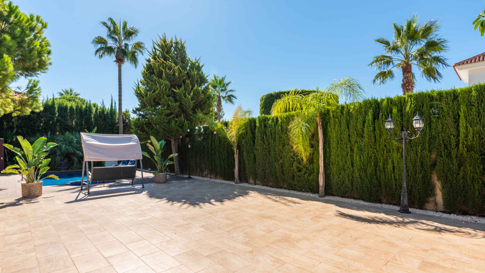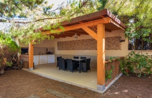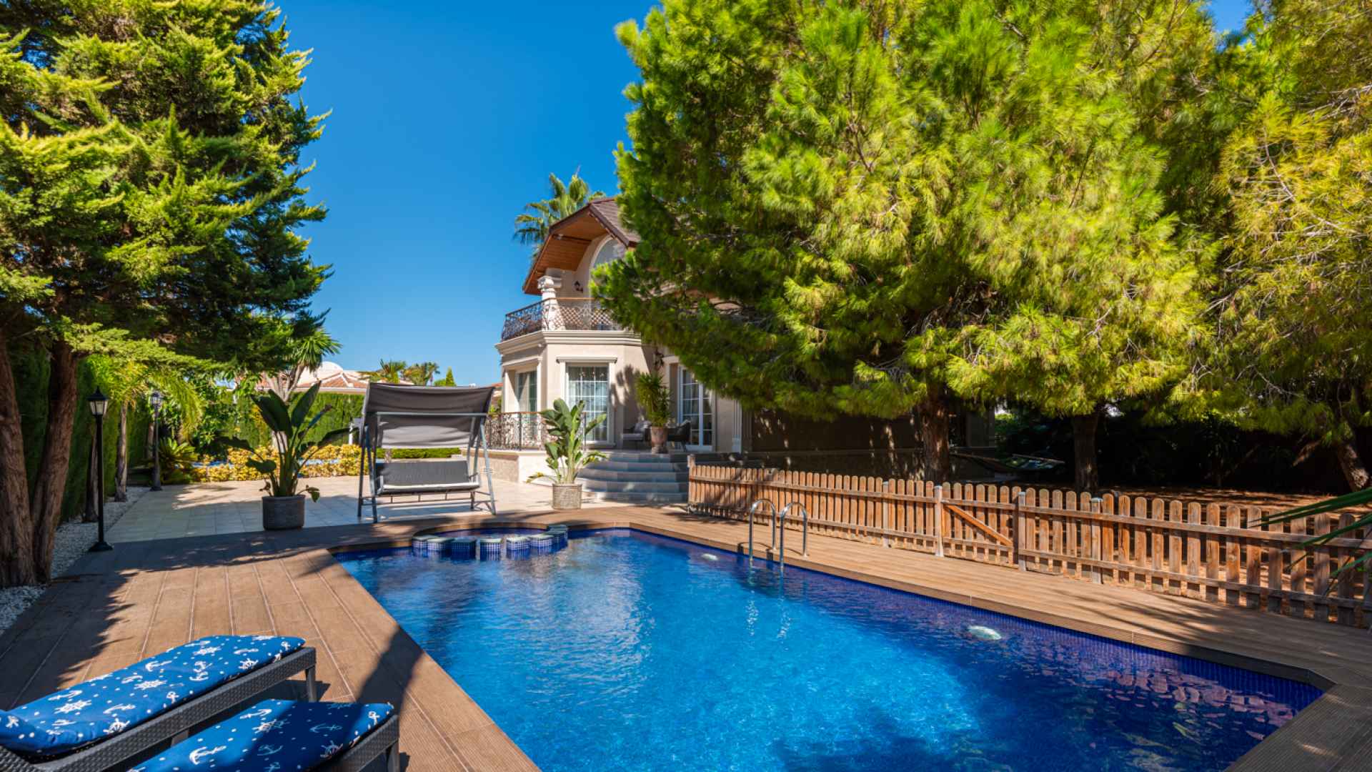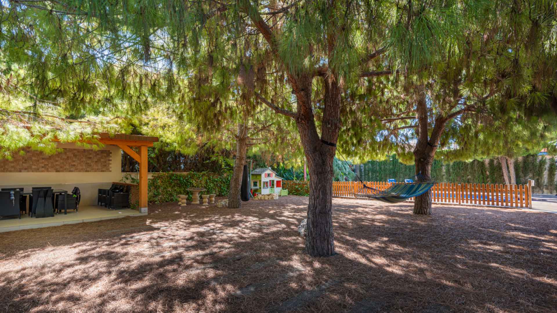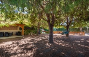 Outside, the property occupies a very large corner plot of some 882m2 where you will find a fabulous private saltwater swimming pool, a lovely, partially covered outdoor kitchen with barbecue and a kids playground. There is plenty of space both sunny and shaded in which to create some wonderful seating/dining areas in which to fully maximise the famous temperate weather that the Costa Blanca South is famous for. There is also a lovely selection of established, trees, shrubs and plants along with off-road parking.
