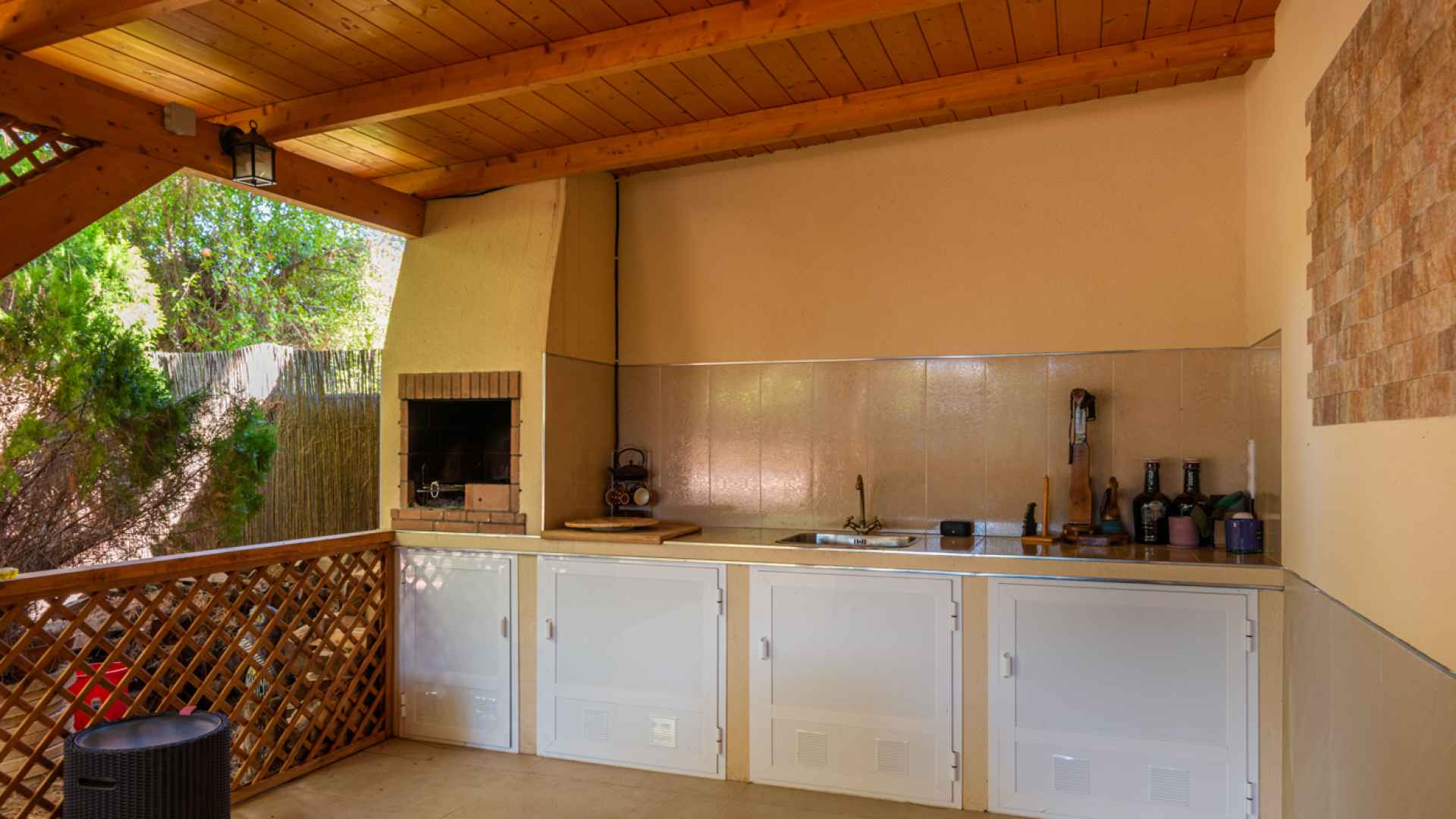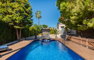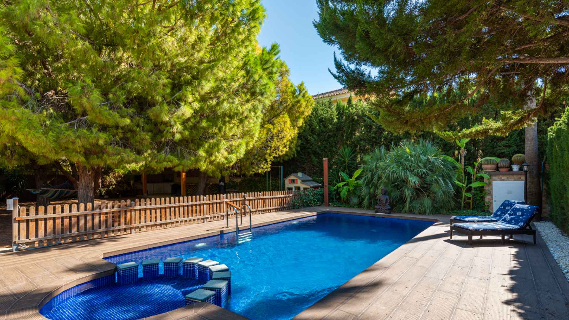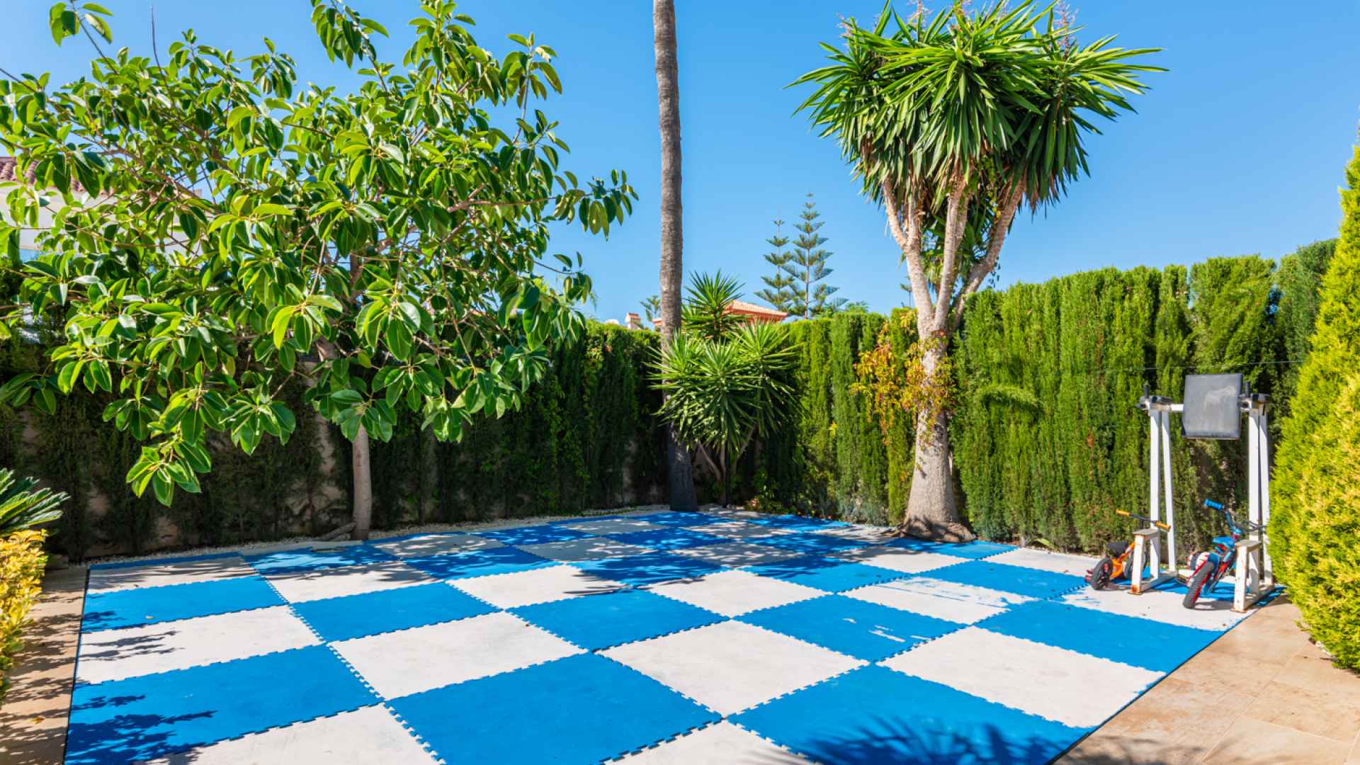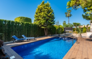 Outside, the property occupies a very large corner plot of some 882m2 where you will find a fabulous private saltwater swimming pool, a lovely, partially covered outdoor kitchen with barbecue and a kids playground. There is plenty of space both sunny and shaded in which to create some wonderful seating/dining areas in which to fully maximise the famous temperate weather that the Costa Blanca South is famous for. There is also a lovely selection of established, trees, shrubs and plants along with off-road parking.