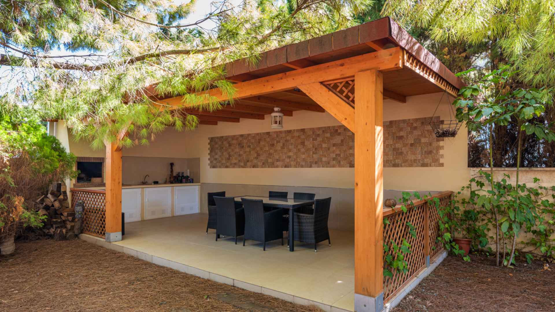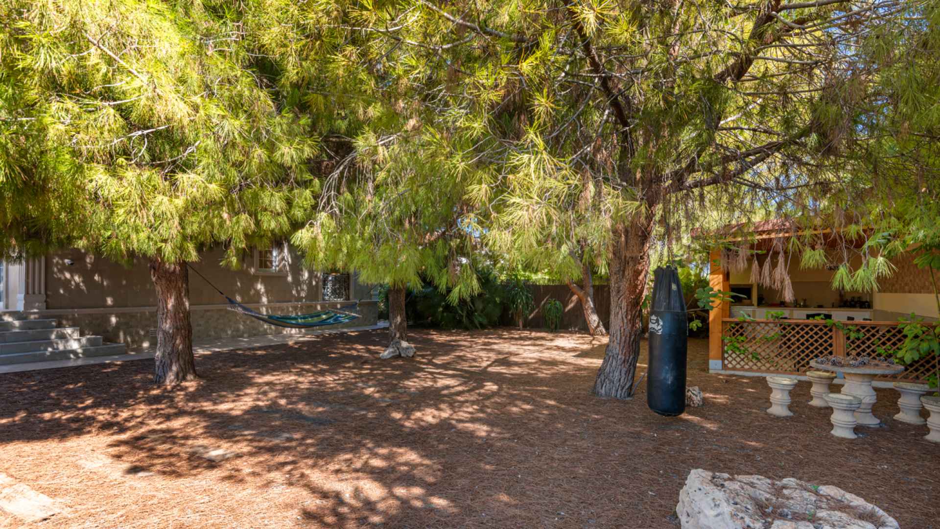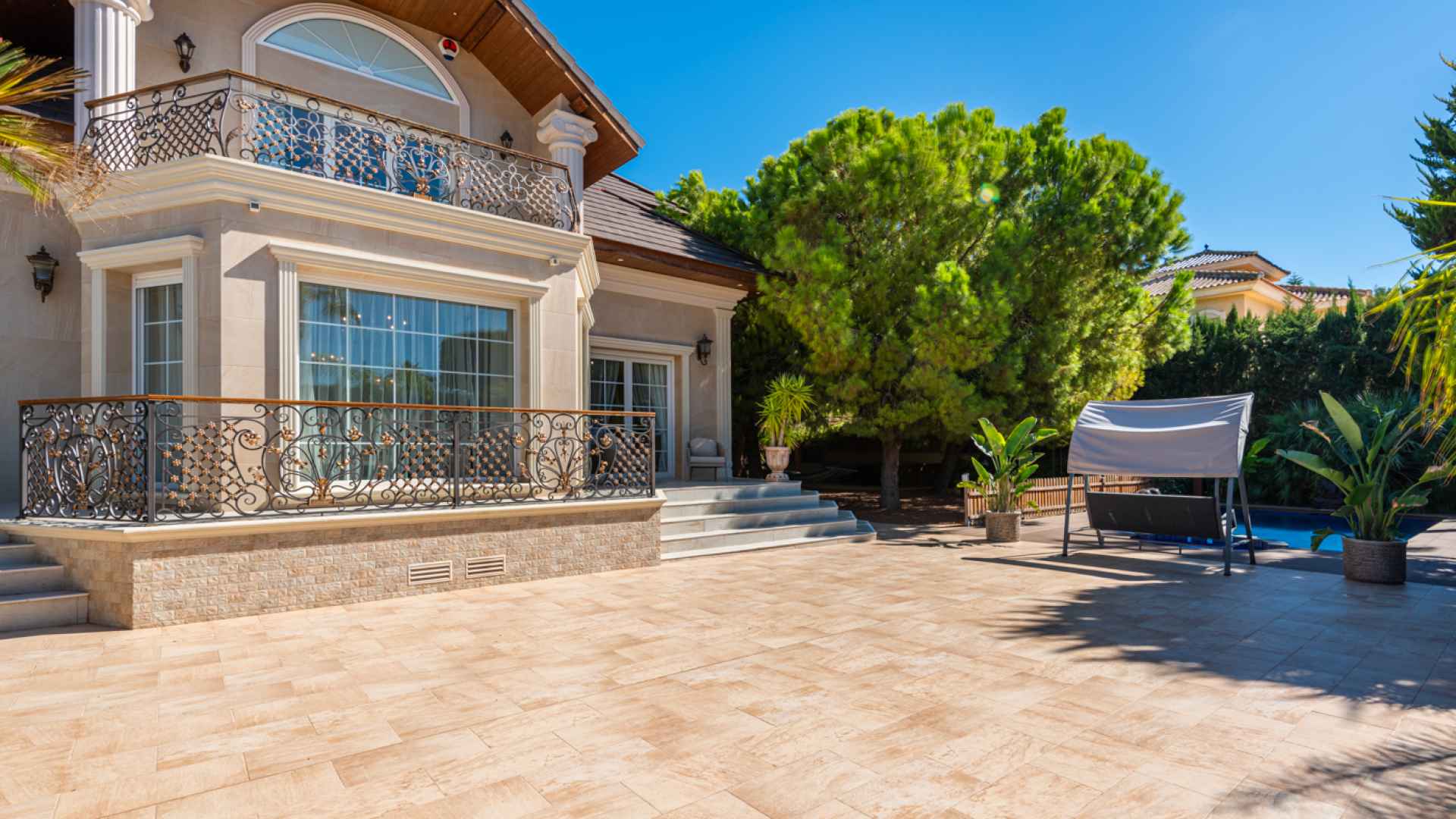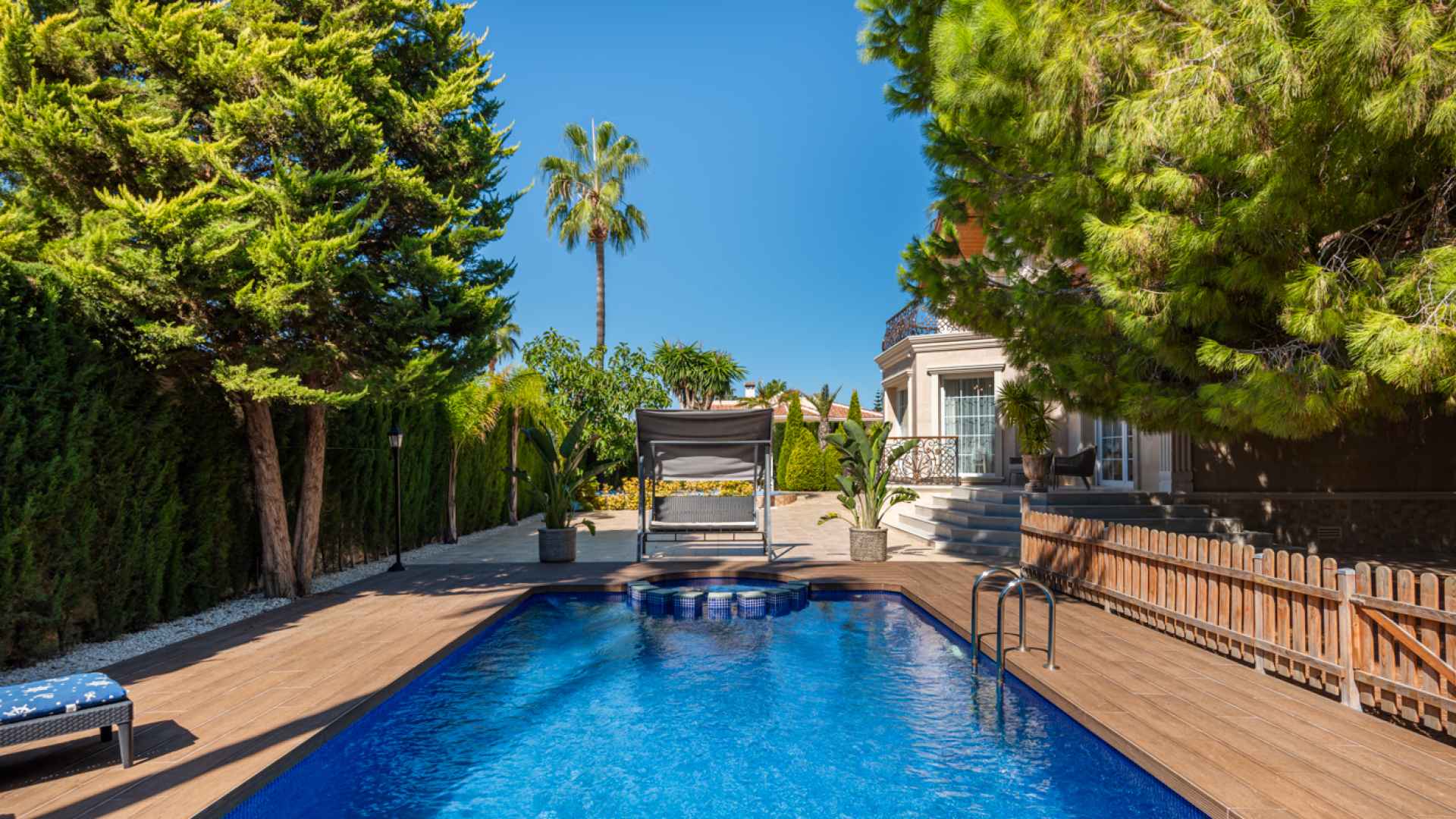 Outside, the property occupies a very large corner plot of some 882m2 where you will find a fabulous private saltwater swimming pool, a lovely, partially covered outdoor kitchen with barbecue and a kids playground. There is plenty of space both sunny and shaded in which to create some wonderful seating/dining areas in which to fully maximise the famous temperate weather that the Costa Blanca South is famous for. There is also a lovely selection of established, trees, shrubs and plants along with off-road parking.