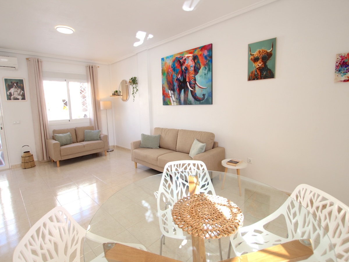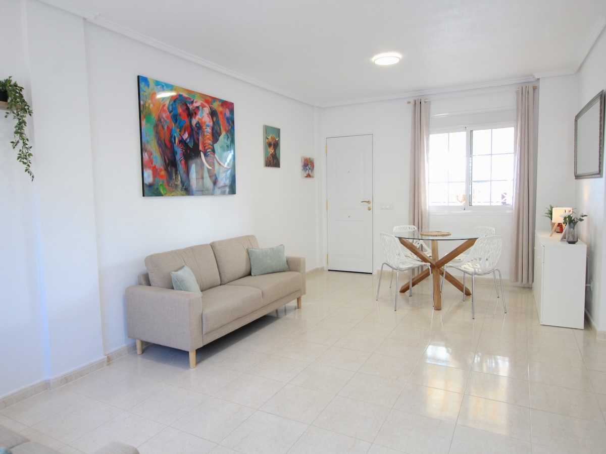 This Attractive & Beautifully Presented, South-facing, three bedroom, two bathroom semi-detached townhouse is located in the very sought after area of Dona Pepa, Ciudad Quesada on the Costa Blanca South. Ideally situated within walking distance there is a good choice of local amenities such as local bars, restaurants, pharmacy, a language school plus a large medical centre. The very popular main Quesada high street is also within easy walking distance and here you will find a huge array of amenities such as; shopping boulevards, banks, cafes, bars, restaurants, supermarkets and much more...Just a short drive away will take you to the beautiful La Marquesa golf course, the Recorral nature park with its forest and lovely lakes, plus the family Aqua Park. The nearest beautiful sandy beaches can be reached in an easy 10 minute drive at Guardamar del Segura.