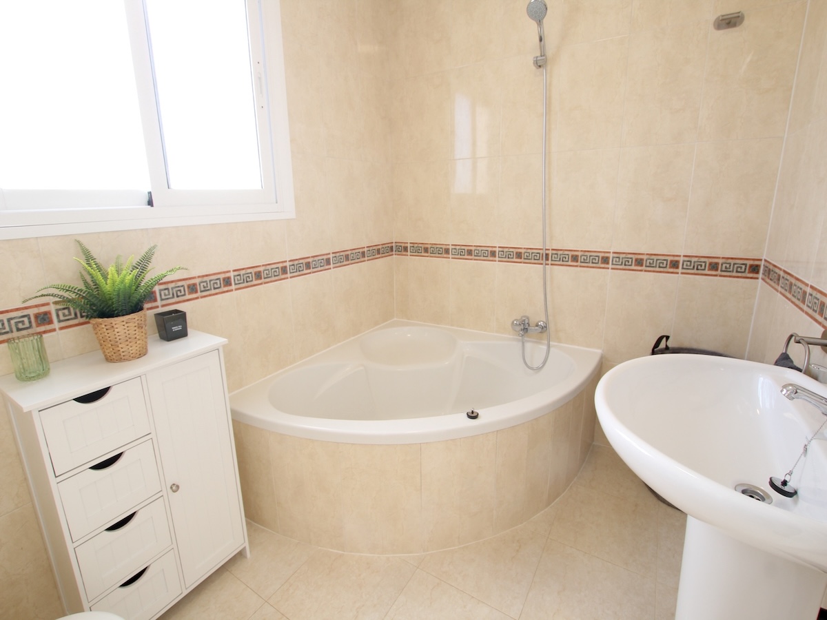 An ornate staircase from the living room leads upstairs where you will find the master bedroom which features fitted wardrobes, A/C, a private en-suite bathroom with a corner bath feature, plus access out to a sun terrace with some lovely views. There is also a third, guest bedroom with built-in storage providing additional flexibility for family or visitors.