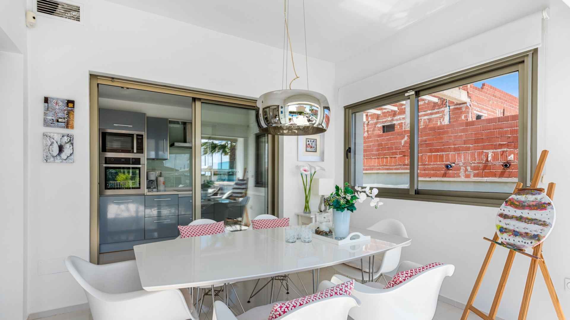 Outside, the property occupies a generous South-facing plot of 500 m2 where you will find a terrific and very inviting private swimming pool with space next to it for sun beds. At the end of the pool there is an outdoor kitchen / BBQ area with a covered dining table. There is also a lovely terrace facing the pool with access from the living room and dining room where you can find a lounge area. On the plot you can also find off-road parking with an automatic gate and a storage room.