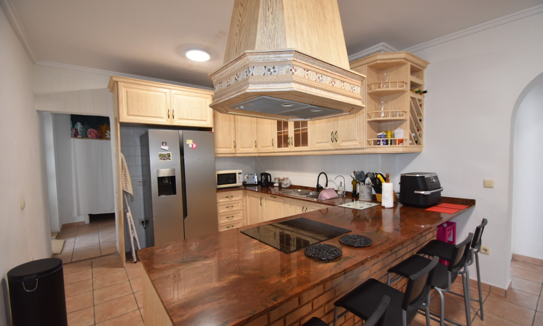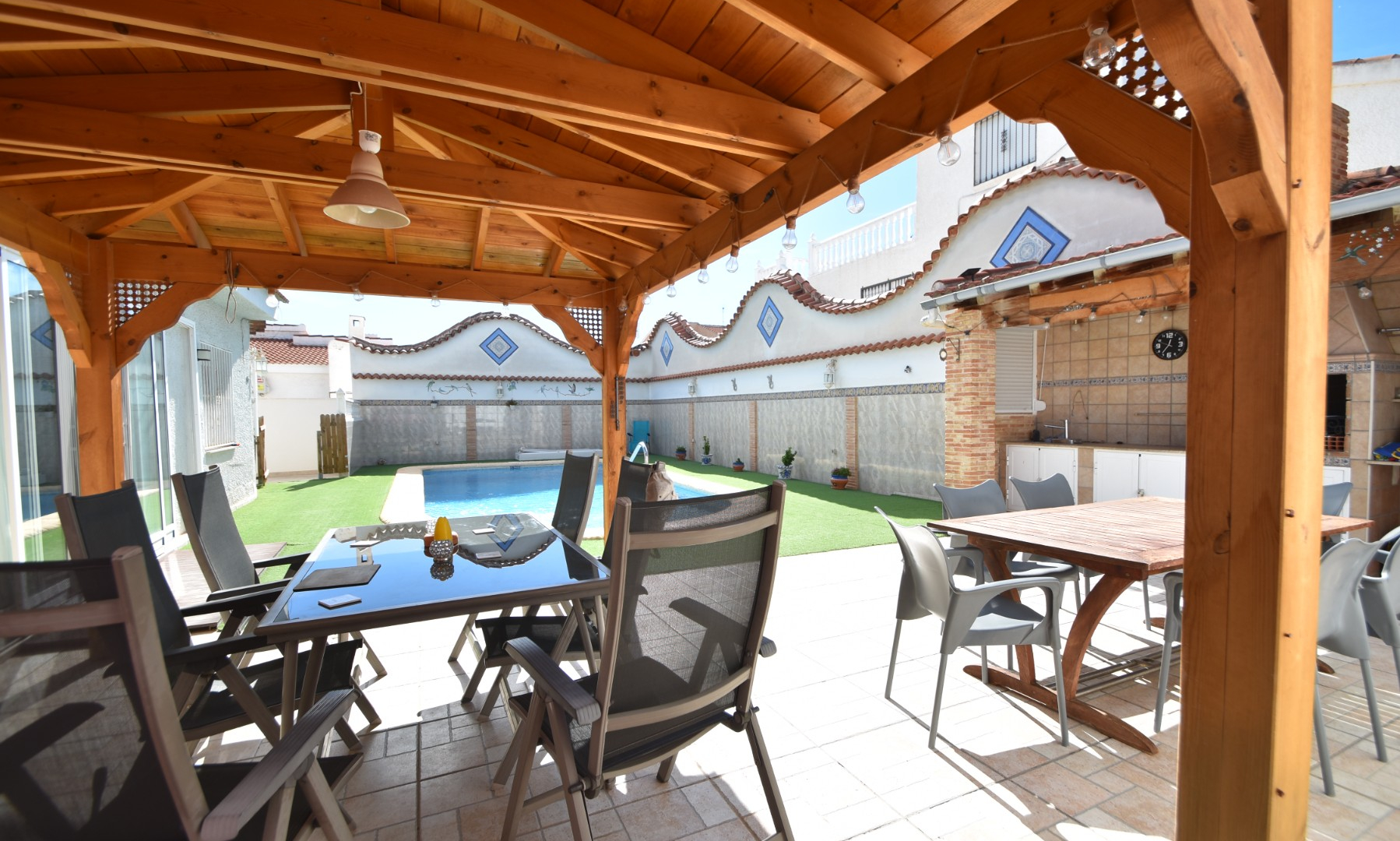 The villa sits on a generous South facing plot and offers; off street parking with a closed garage, a private swimming pool with plenty of space for seating and entertaining, a charming outside summer kitchen, outdoor toilet and shower room, storage room, plus a large sun-drenched solarium.