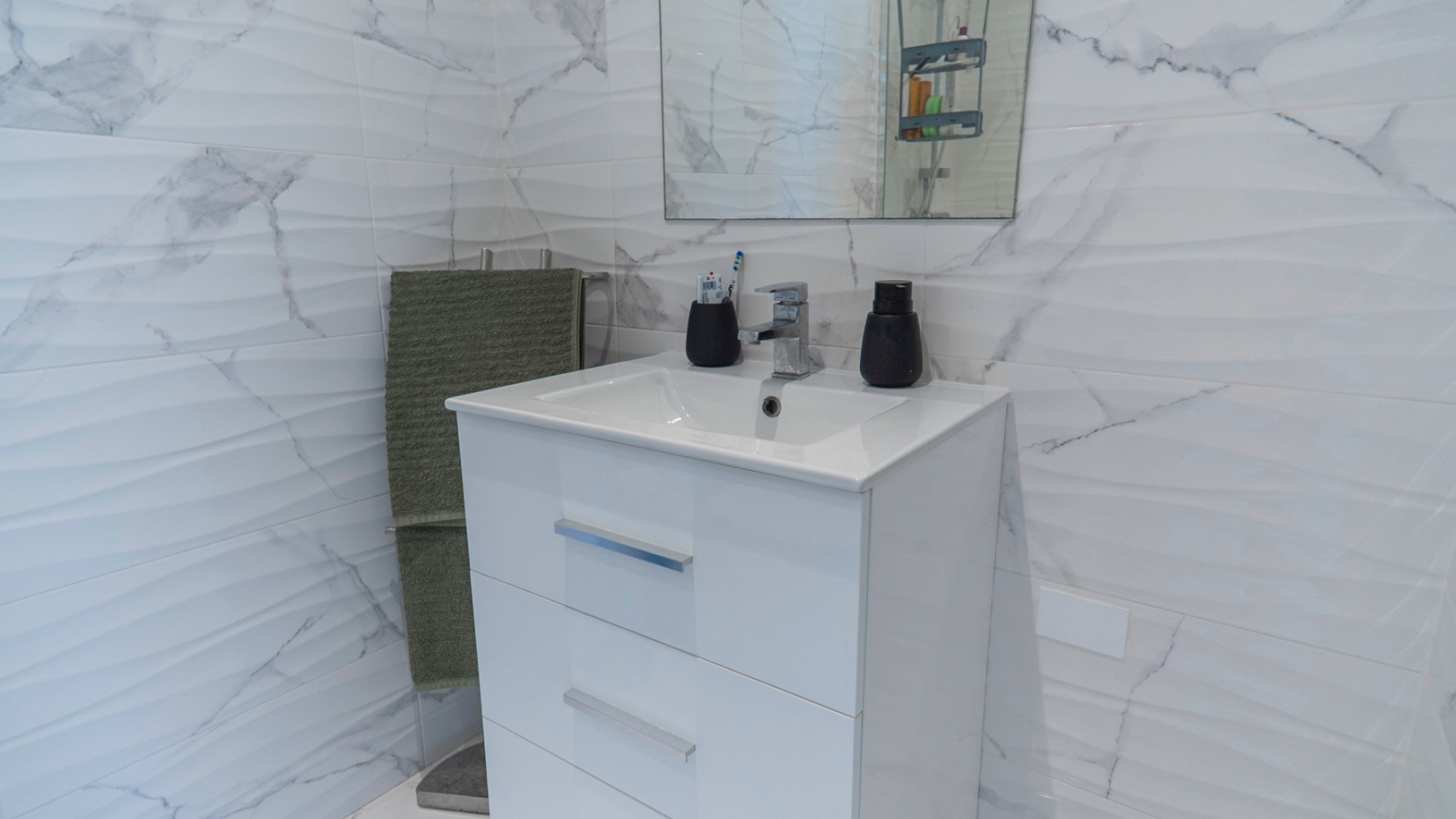The bright, open-plan living area combines lounge, dining, and kitchen spaces, with large picture windows framing the golf course. A pellet burner, feature fireplace, and air conditioning provide year-round comfort. From the living room, step out onto a terrace overlooking the seventh hole, or take the external stairs up to the rooftop solarium for panoramic views and all-day sun.