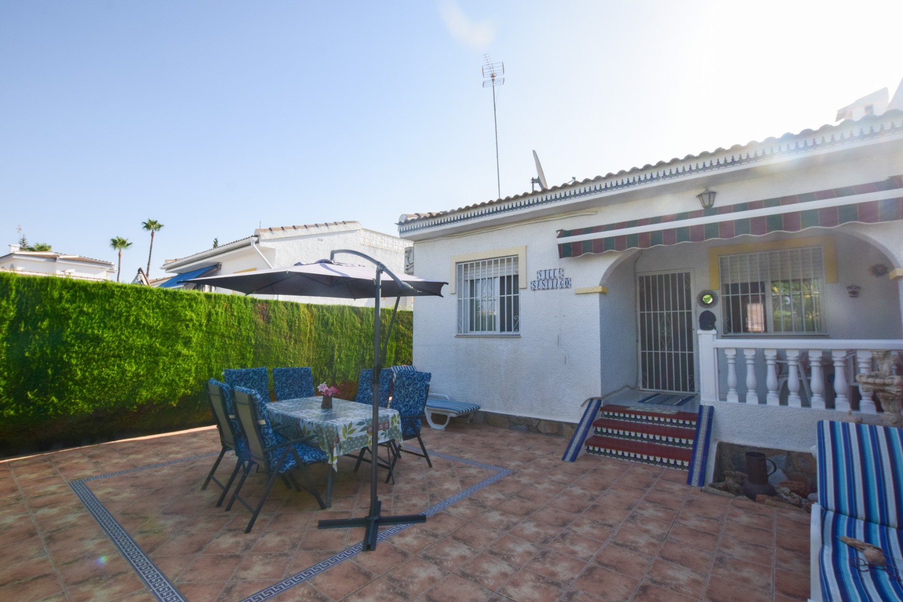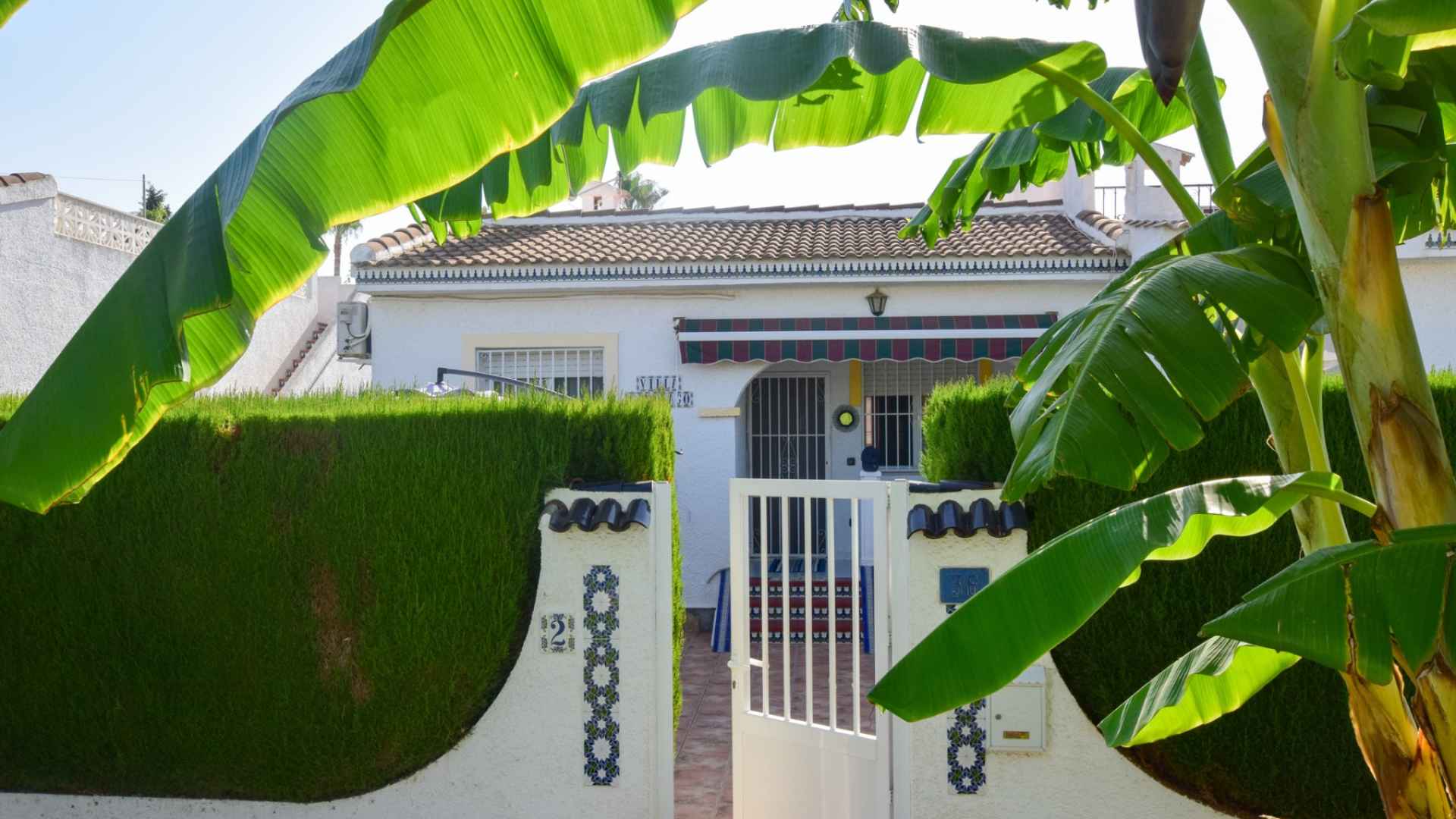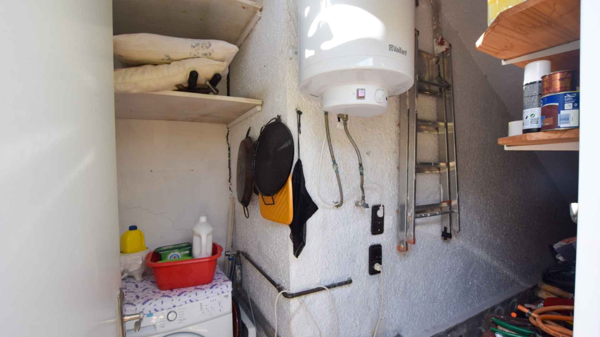 Outside, the property occupies a generous plot with ample room for sun beds, plus lounging and dining furniture and a large storage/utility cupboard. The gate at the front part of the garden leads directly out to the communal pool.