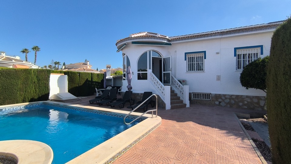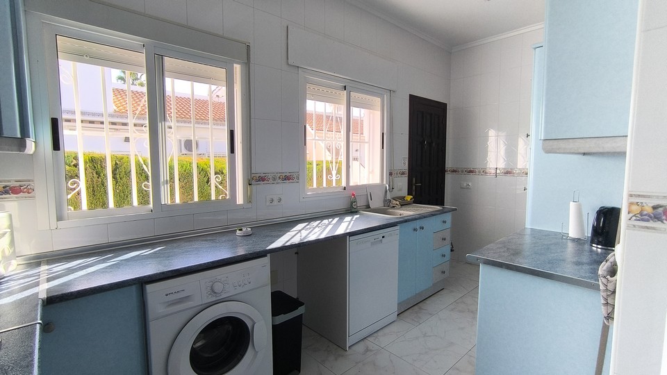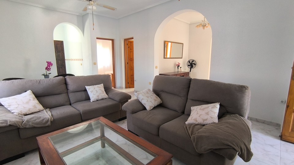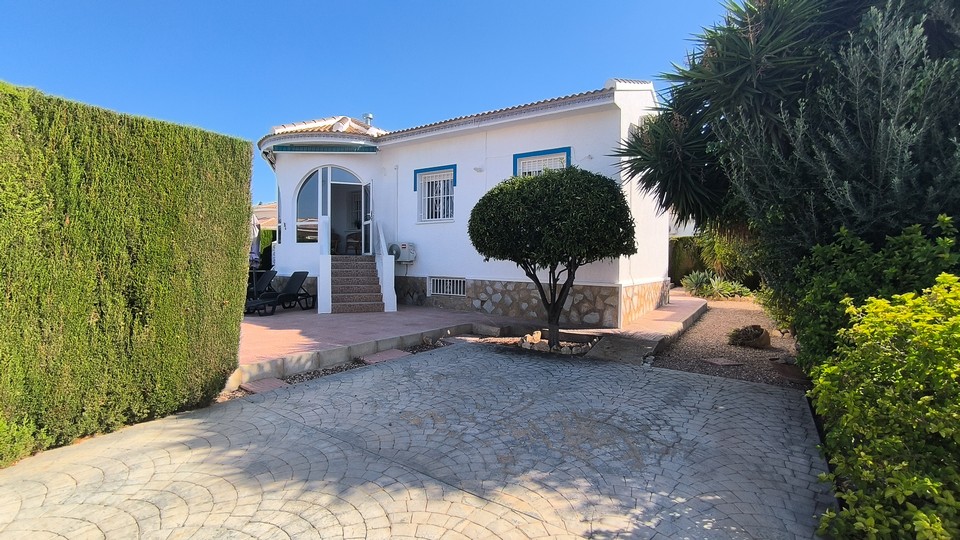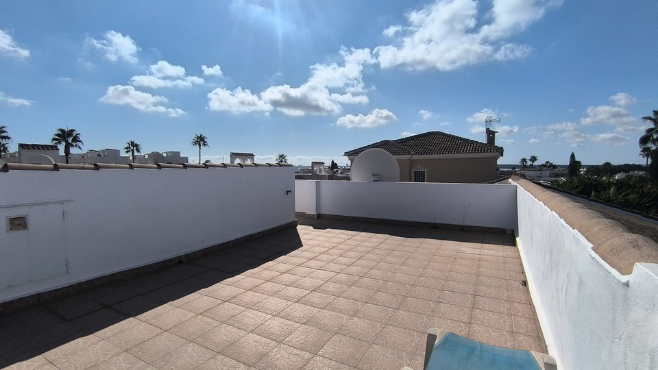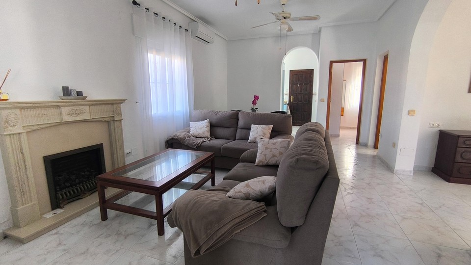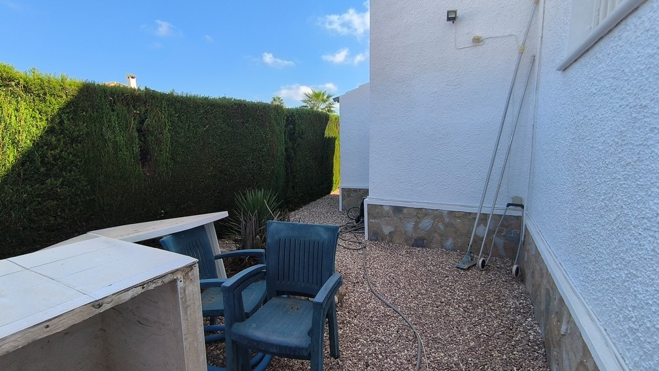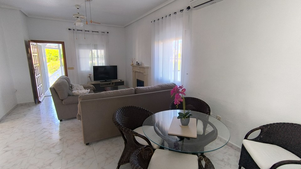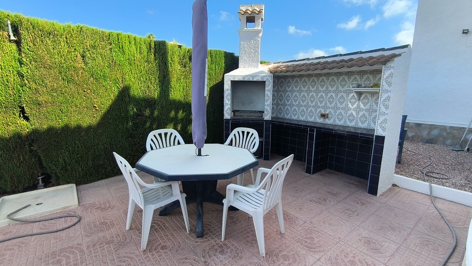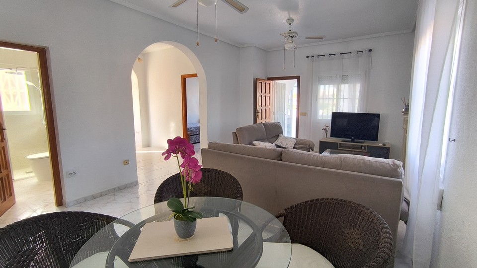 This Attractive and well presented three bedroom, two bathroom detached villa is located in the highly desirable area of Pueblo Bravo, Ciudad Quesada on the Costa Blanca South. Within walking distance you will find; a main brand supermarket, bars, restaurants, and a private school. Also very nearby you have the local amenities of Dona Pepa to include; a pharmacy, bars, restaurants, medical centre, language school plus the lovely La Laguna spa hotel. An easy 5 minute drive will take you into the very popular main Quesada high street which offers a further wealth of amenities and services including; restaurants, bars, supermarkets, banks, petrol station, bowling alley and two shopping boulevards. Also close by is the beautiful La Marquesa golf course with its lovely clubhouse, a main brand supermarket plus several bars and restaurants. The pretty Recorral Nature Park with its lovely lakes and picnic areas and the Rojales family Aqua park are also just a short drive away. The nearest stunning sandy beaches can be reached in an easy 10 minute drive at Guardamar del Segura.