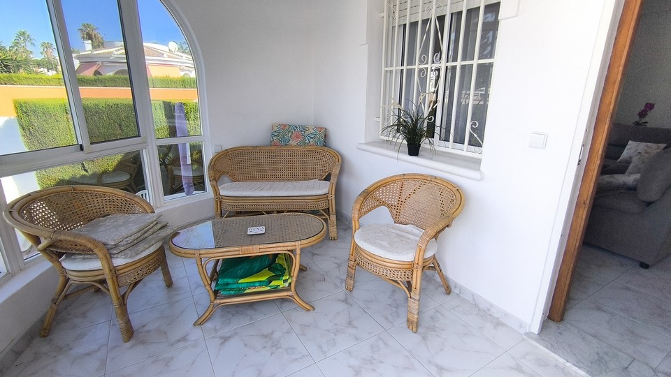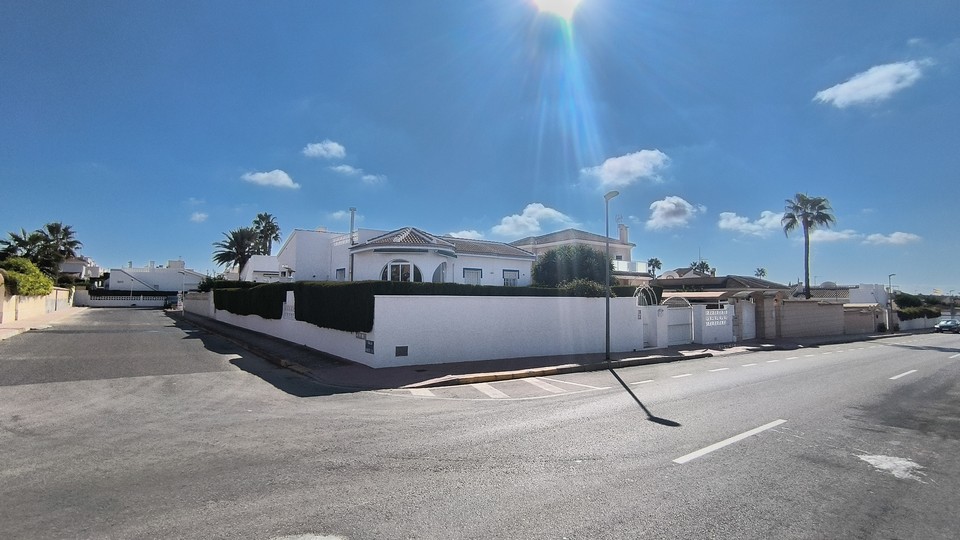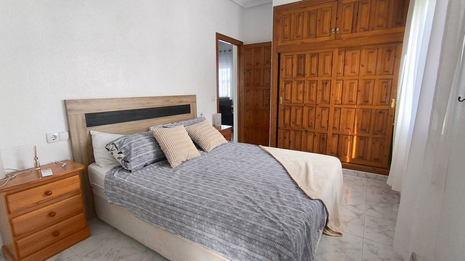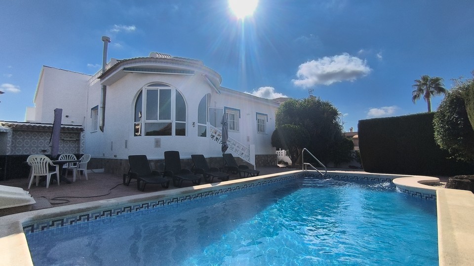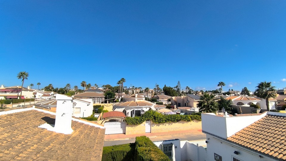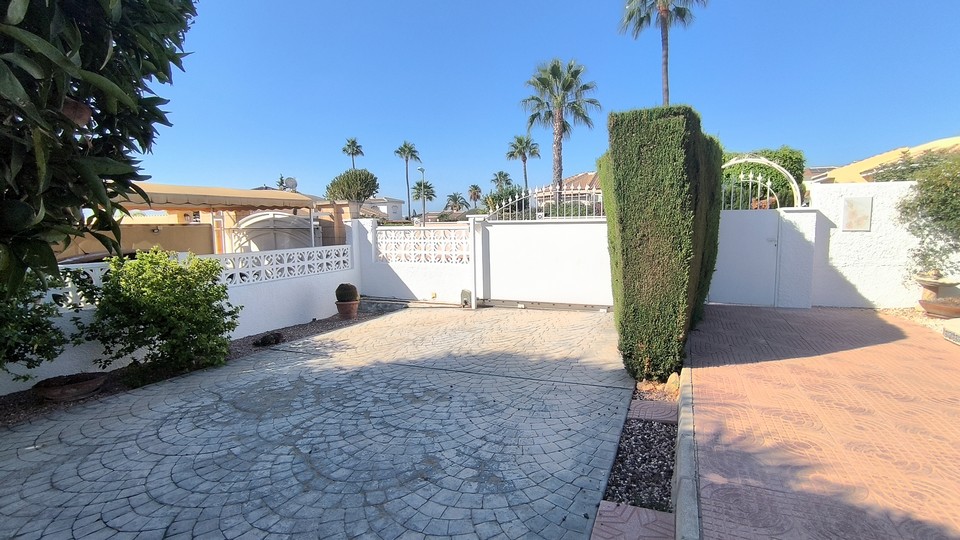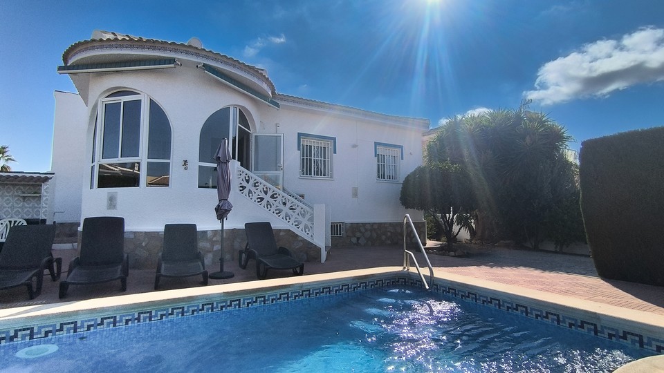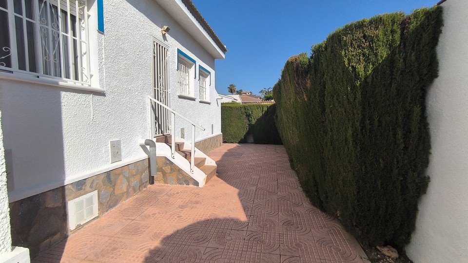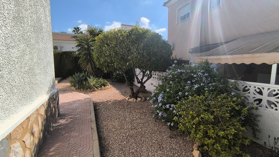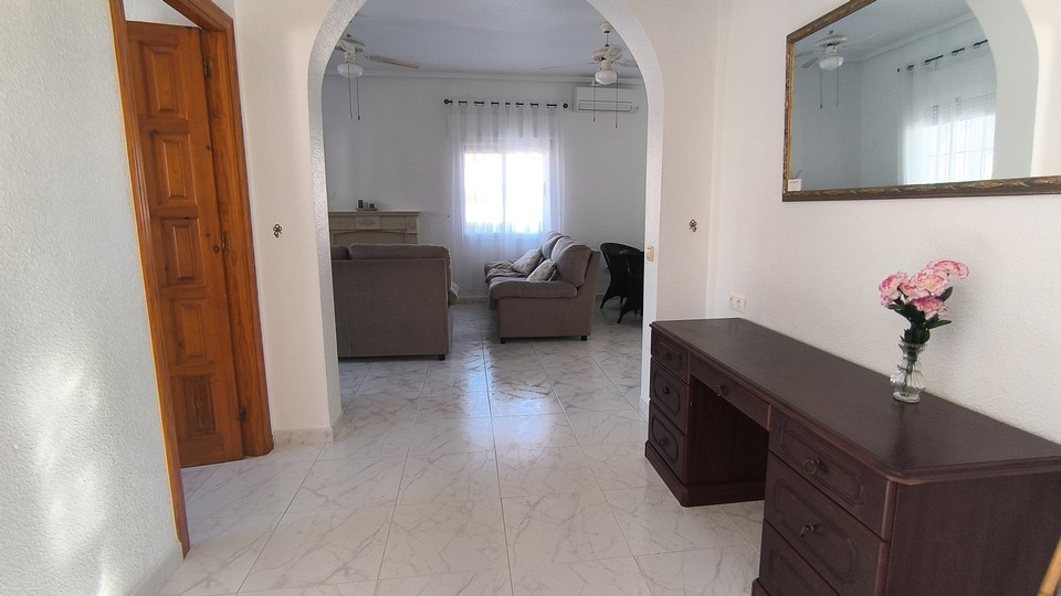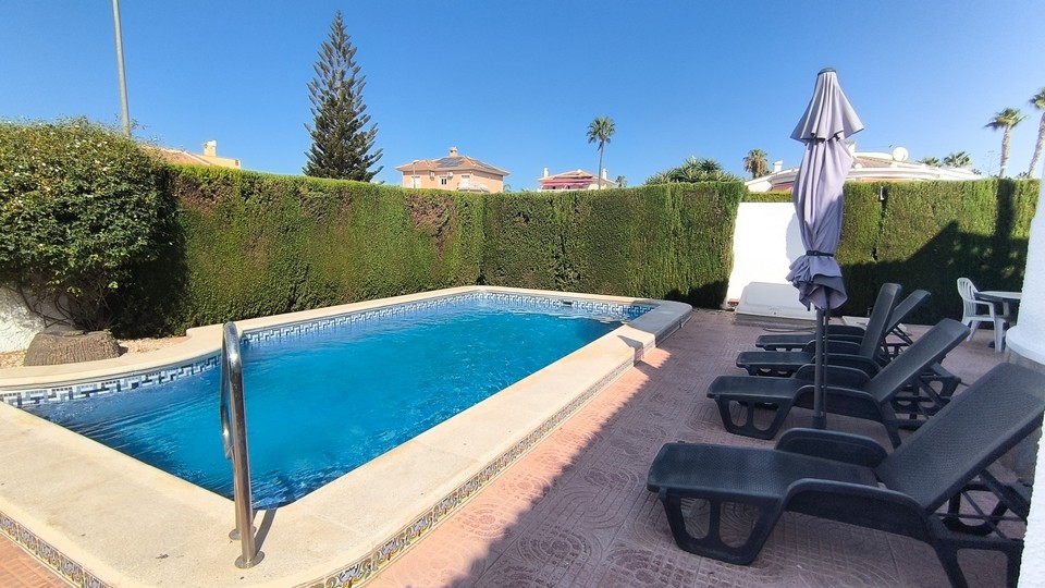 This Attractive and well presented three bedroom, two bathroom detached villa is located in the highly desirable area of Pueblo Bravo, Ciudad Quesada on the Costa Blanca South. Within walking distance you will find; a main brand supermarket, bars, restaurants, and a private school. Also very nearby you have the local amenities of Dona Pepa to include; a pharmacy, bars, restaurants, medical centre, language school plus the lovely La Laguna spa hotel. An easy 5 minute drive will take you into the very popular main Quesada high street which offers a further wealth of amenities and services including; restaurants, bars, supermarkets, banks, petrol station, bowling alley and two shopping boulevards. Also close by is the beautiful La Marquesa golf course with its lovely clubhouse, a main brand supermarket plus several bars and restaurants. The pretty Recorral Nature Park with its lovely lakes and picnic areas and the Rojales family Aqua park are also just a short drive away. The nearest stunning sandy beaches can be reached in an easy 10 minute drive at Guardamar del Segura.
