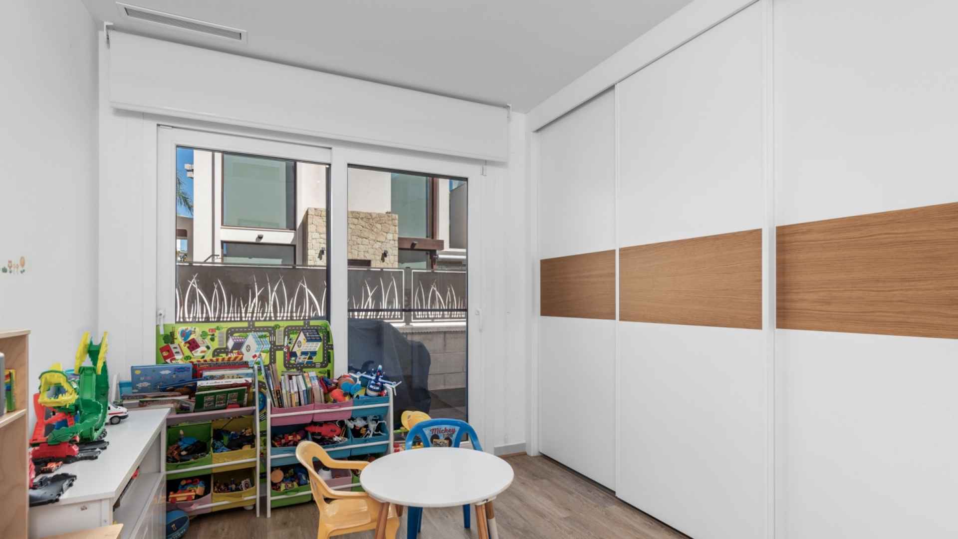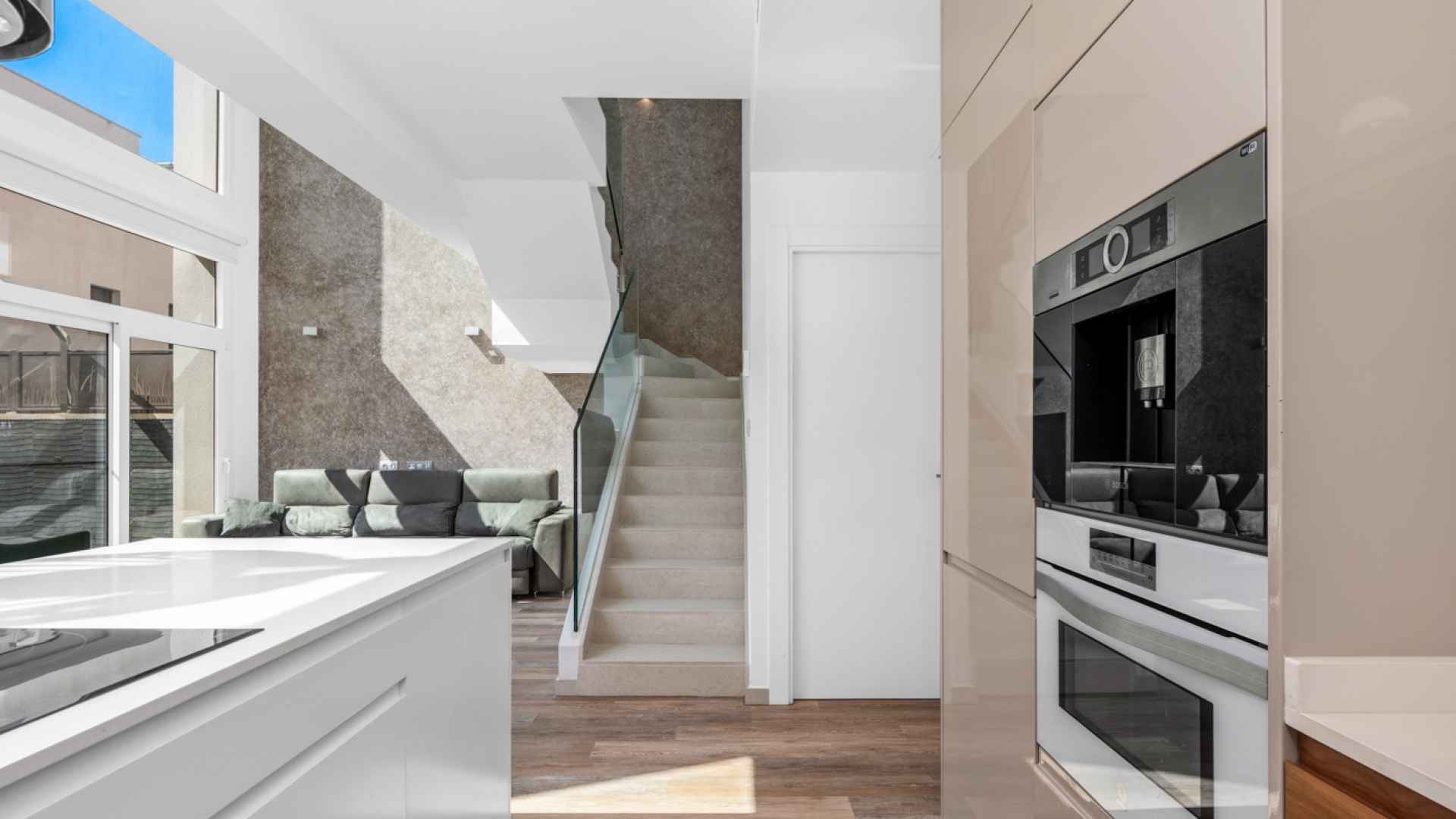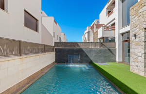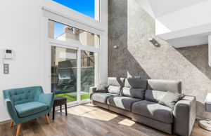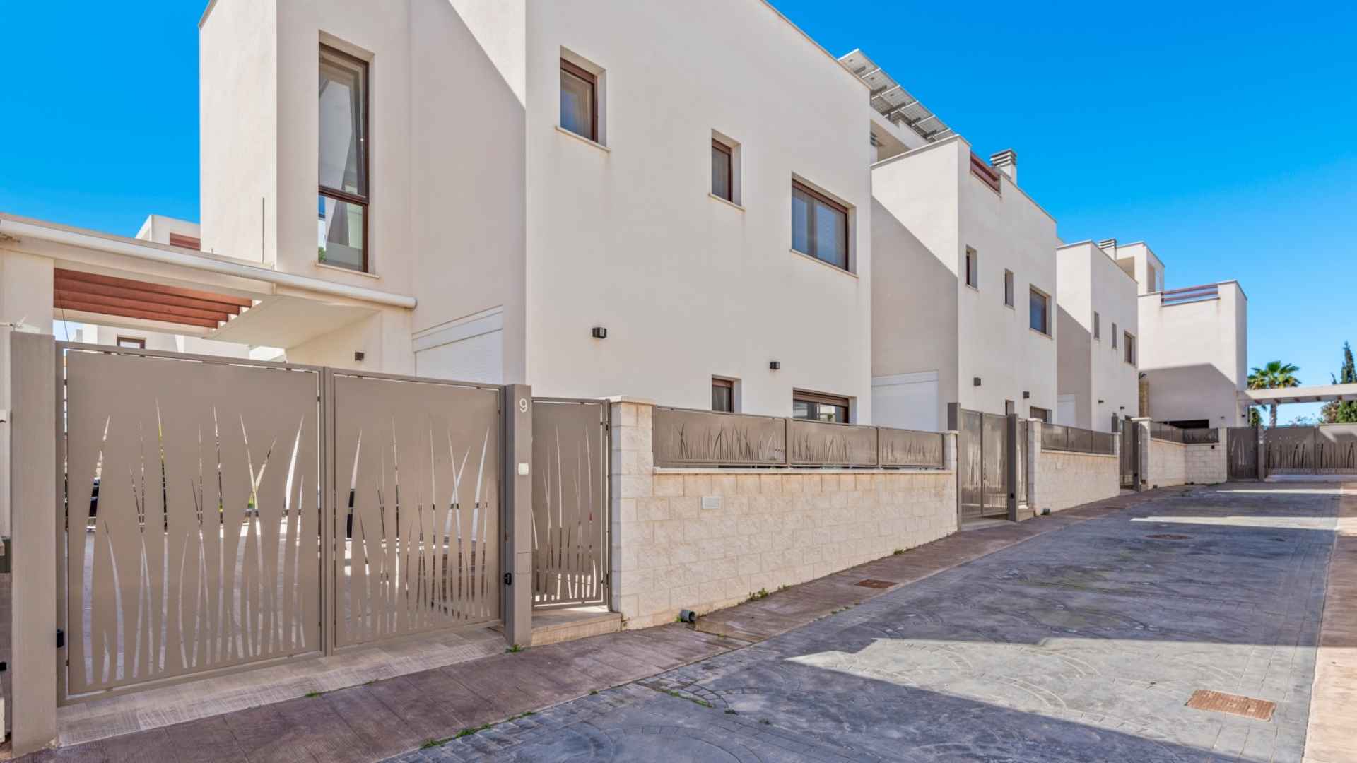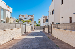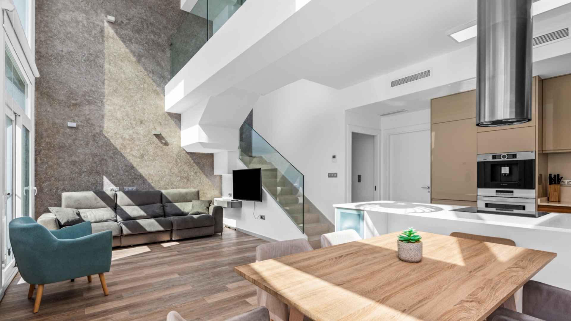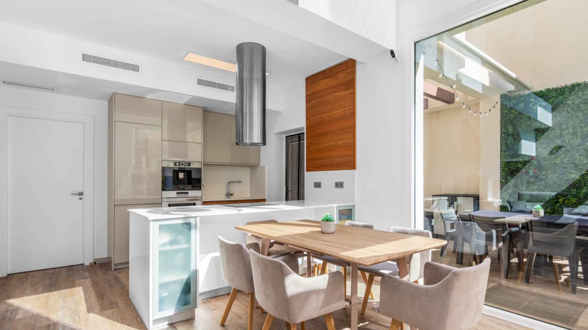 This stylish villa has a build size of 101m2 set on a plot of 182m2 and has three bedrooms and three bathrooms. The ground floor includes a living room with lovely high ceilings with an integrated kitchen, a full bathroom, one bedroom, plus a laundry area equipped with an 8 kg washer and dryer.