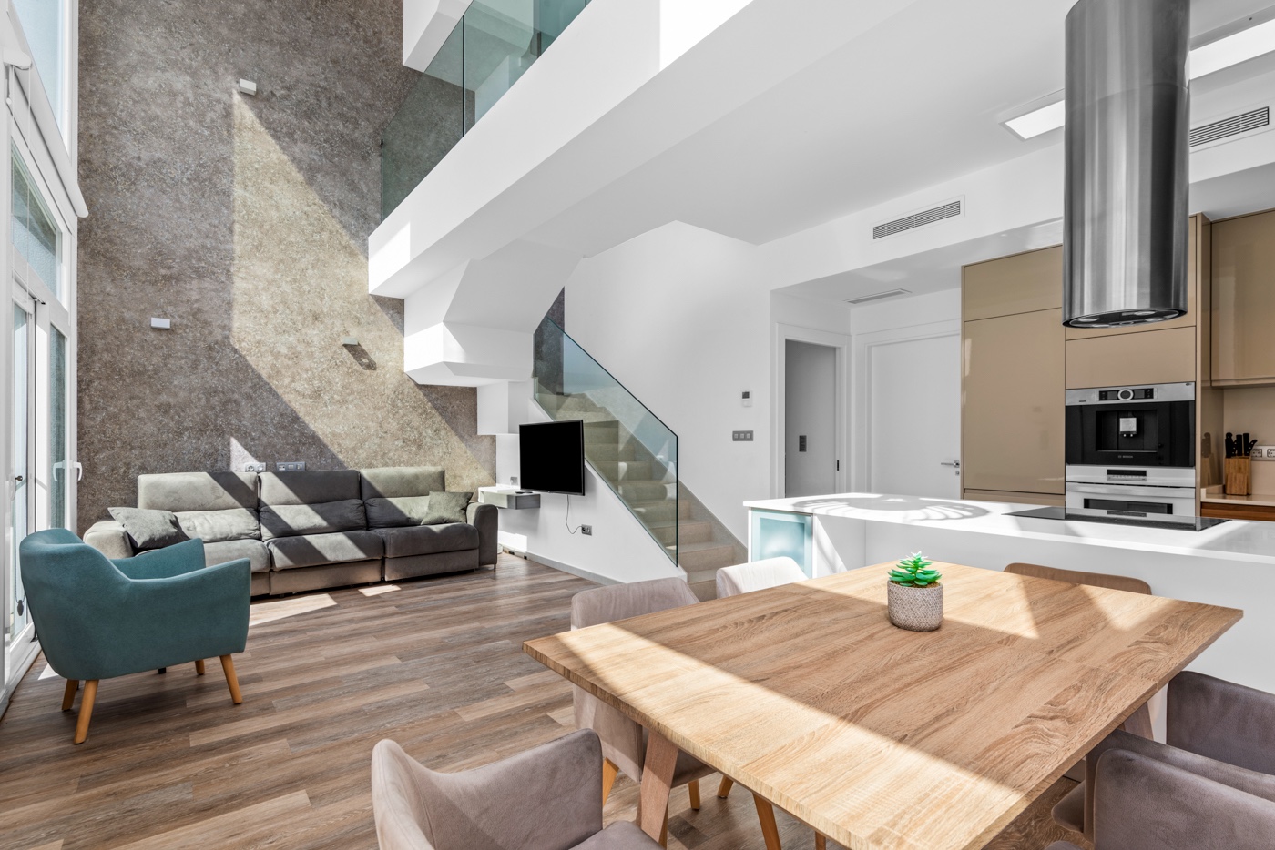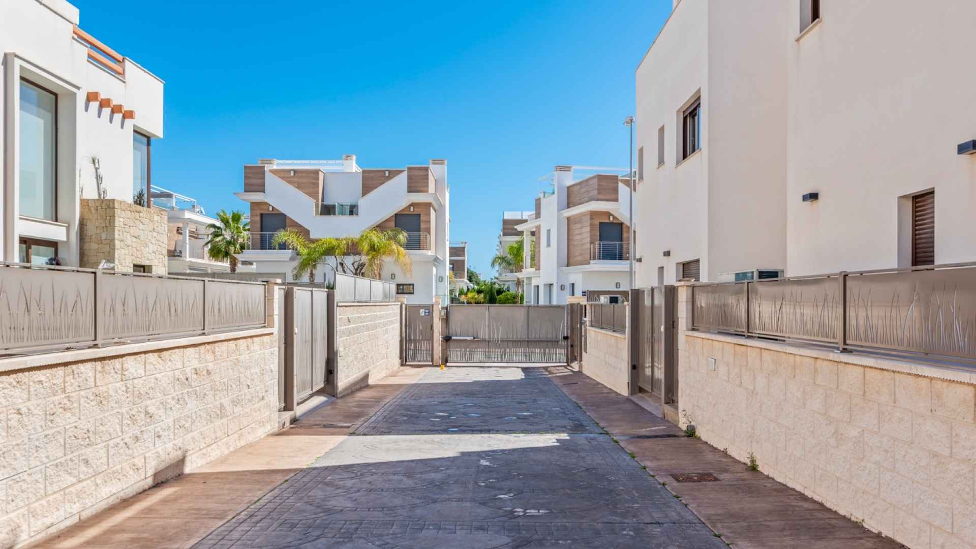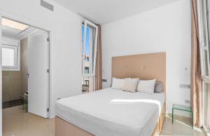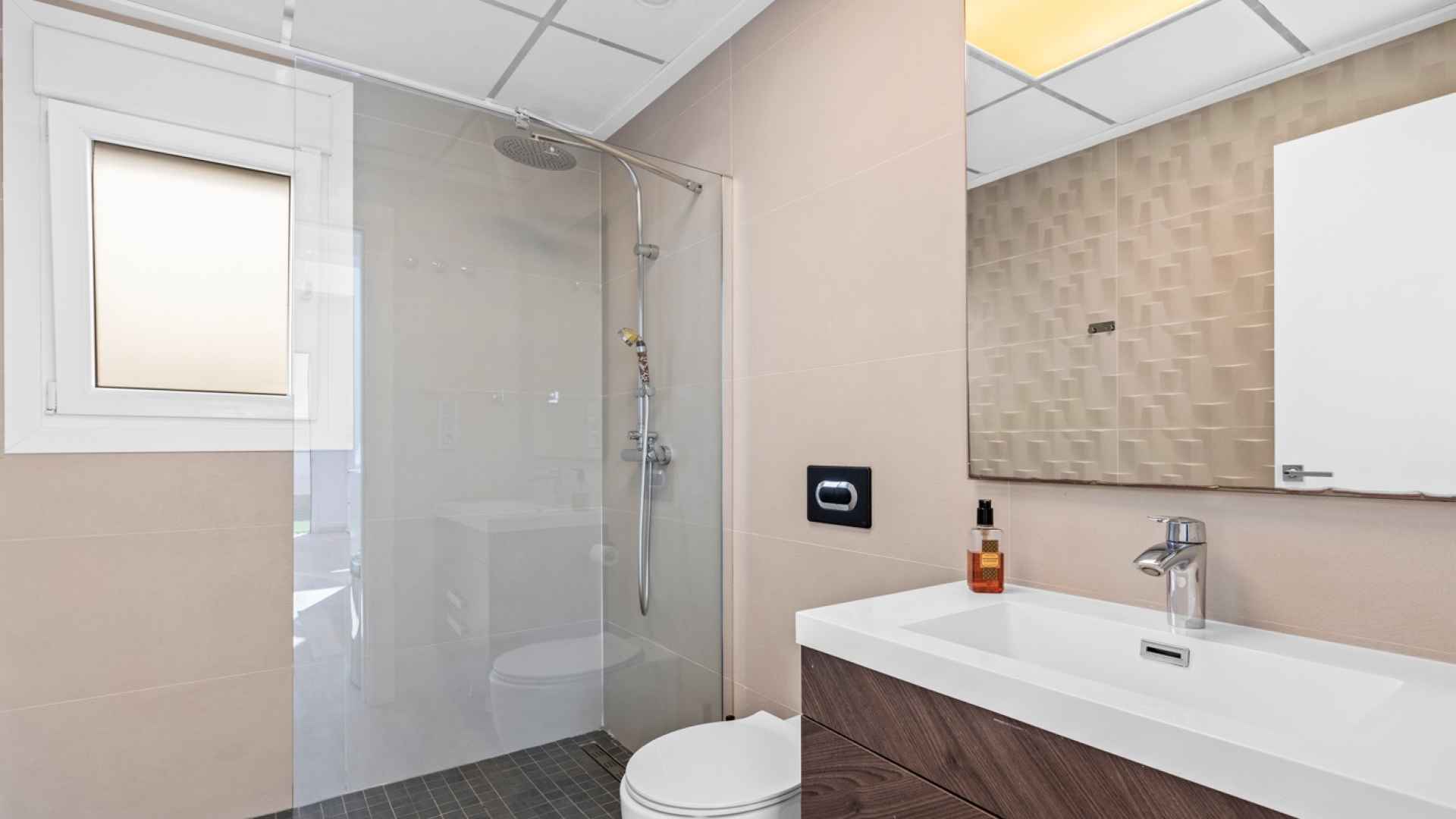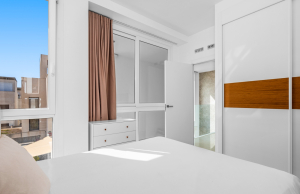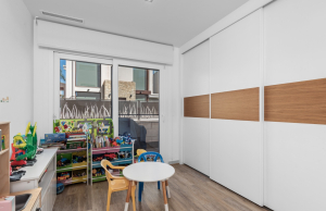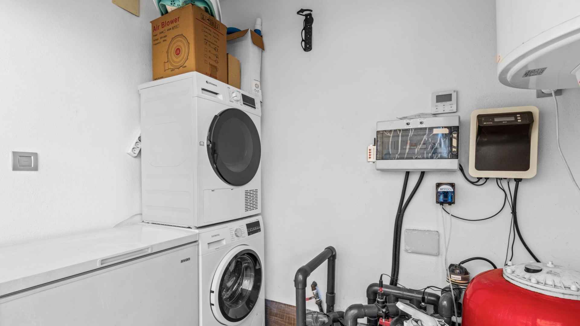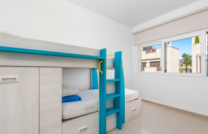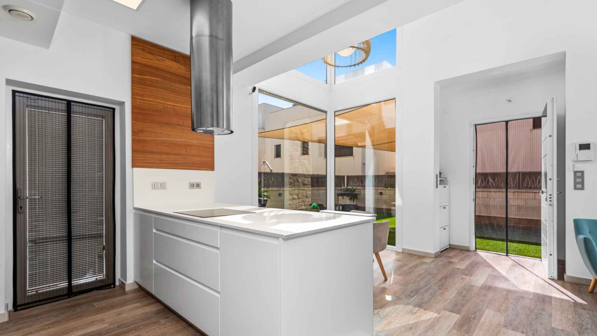 This stylish villa has a build size of 101m2 set on a plot of 182m2 and has three bedrooms and three bathrooms. The ground floor includes a living room with lovely high ceilings with an integrated kitchen, a full bathroom, one bedroom, plus a laundry area equipped with an 8 kg washer and dryer.
