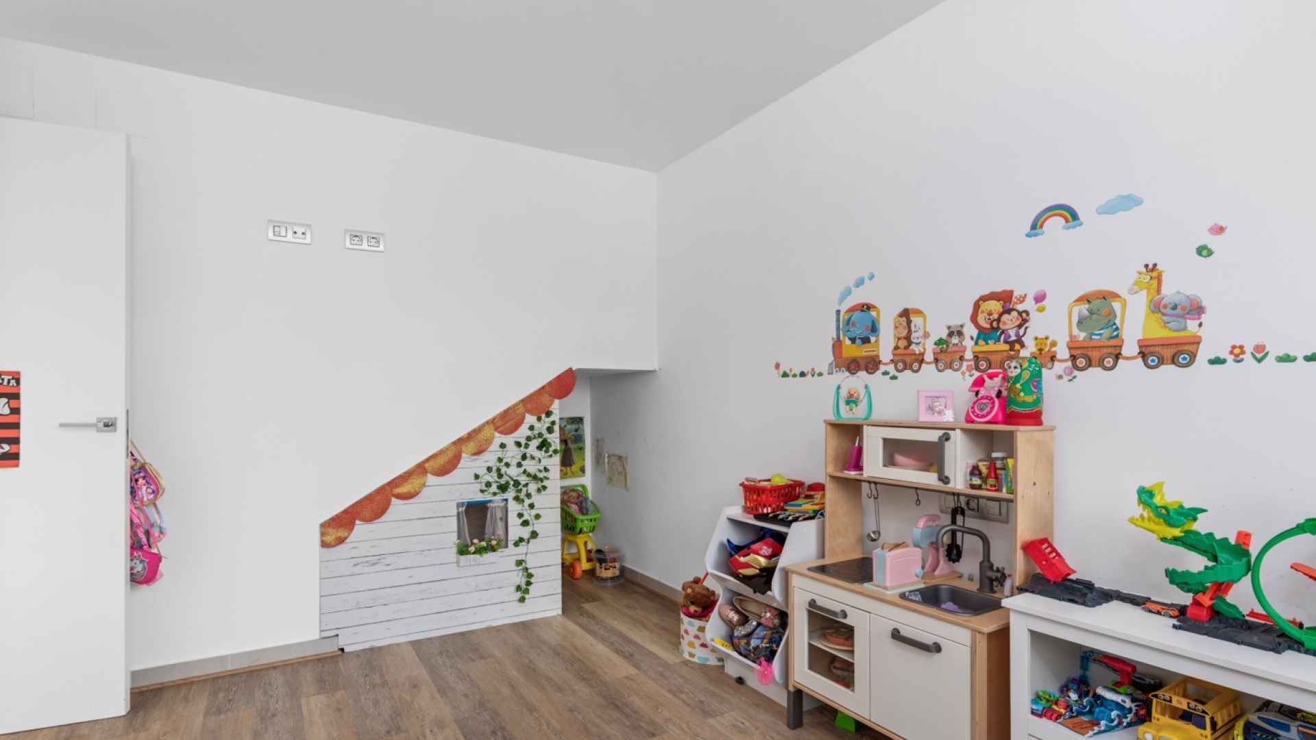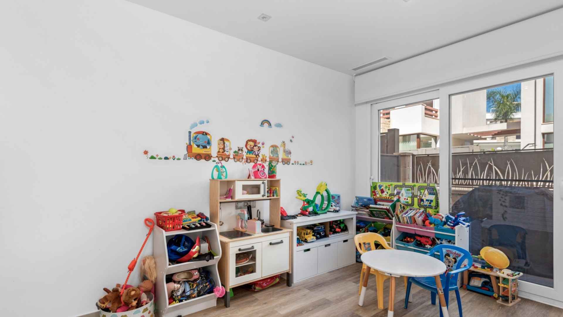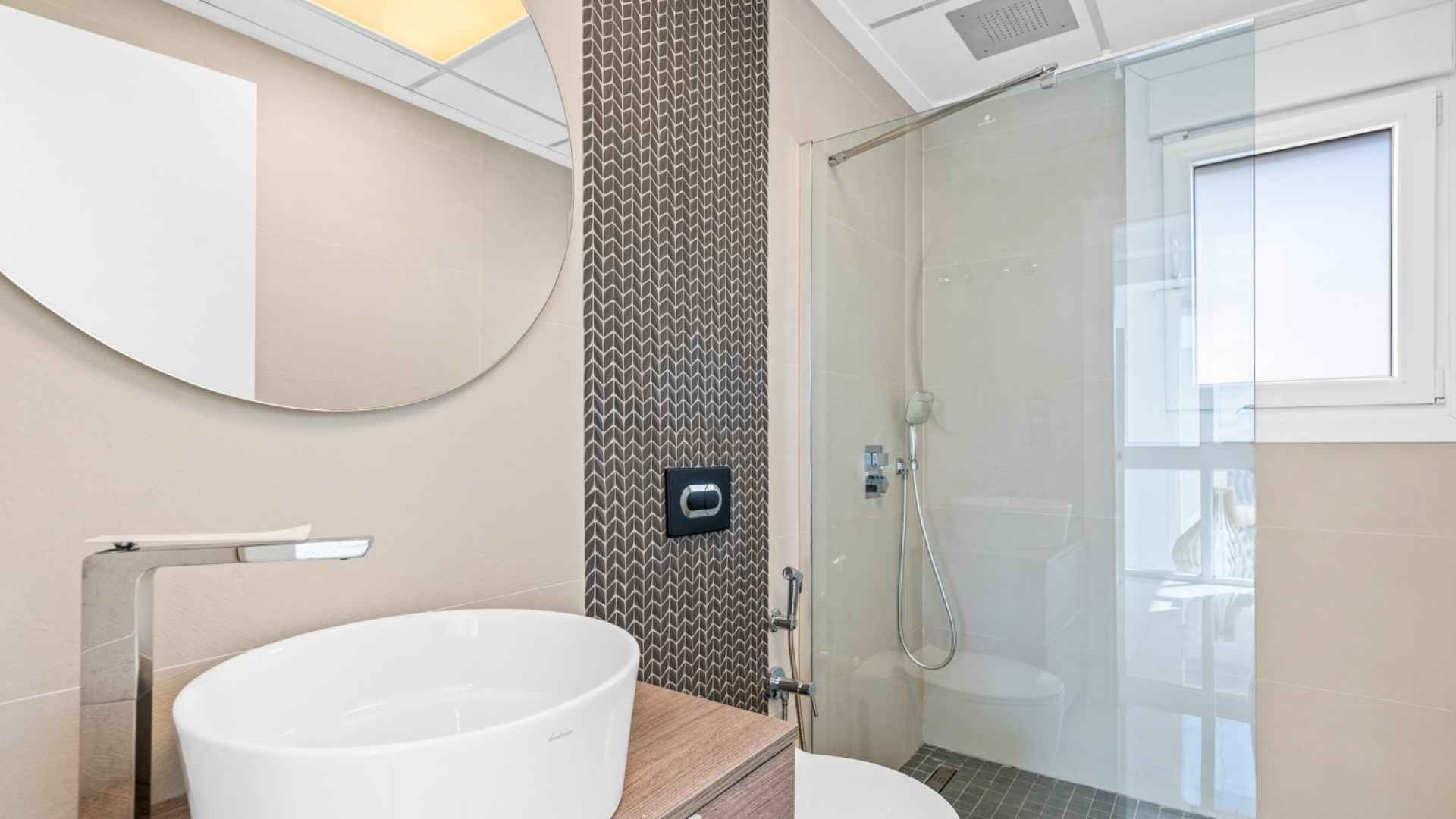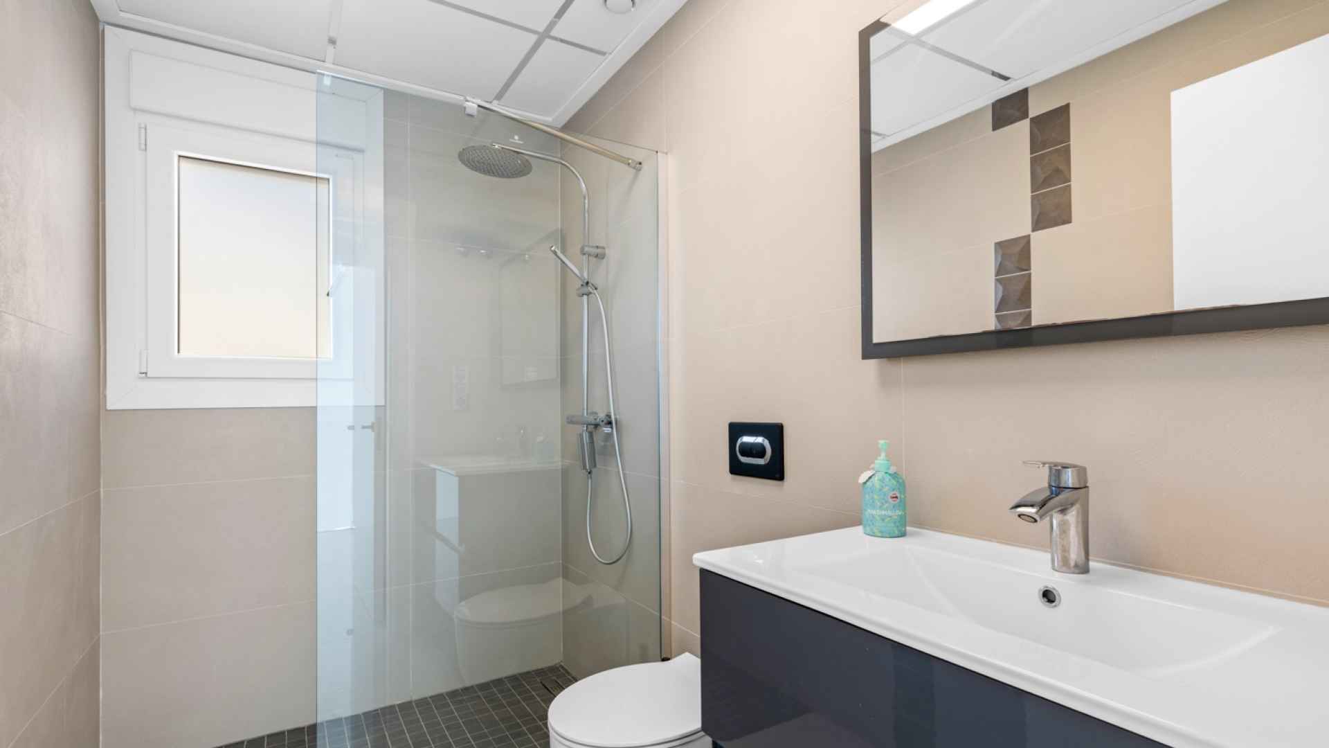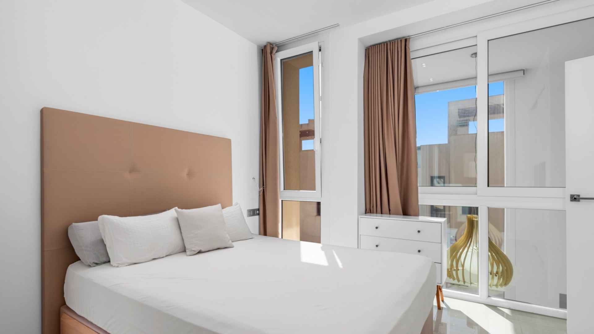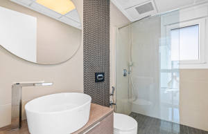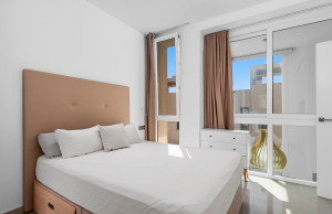 This stylish villa has a build size of 101m2 set on a plot of 182m2 and has three bedrooms and three bathrooms. The ground floor includes a living room with lovely high ceilings with an integrated kitchen, a full bathroom, one bedroom, plus a laundry area equipped with an 8 kg washer and dryer.