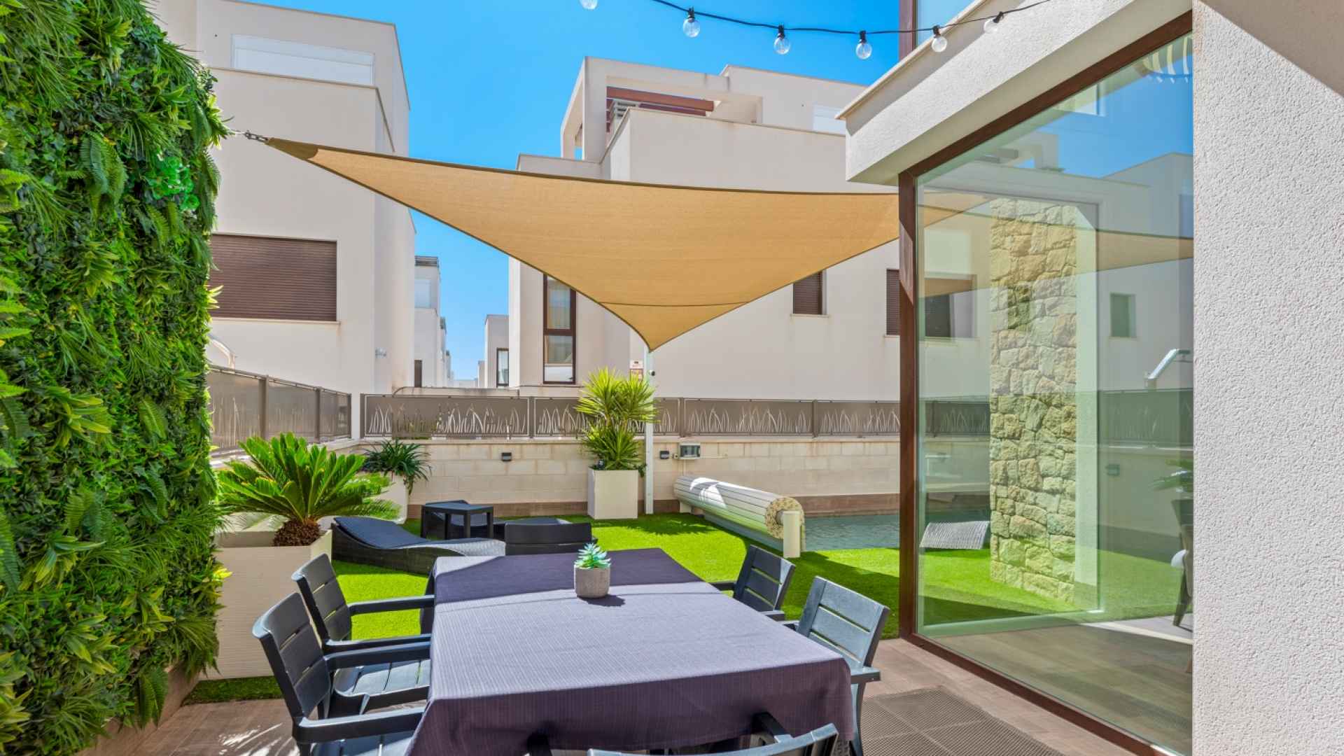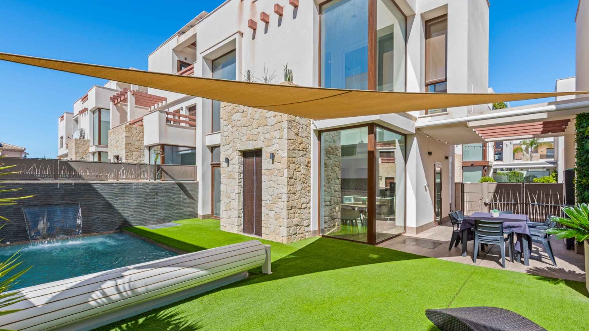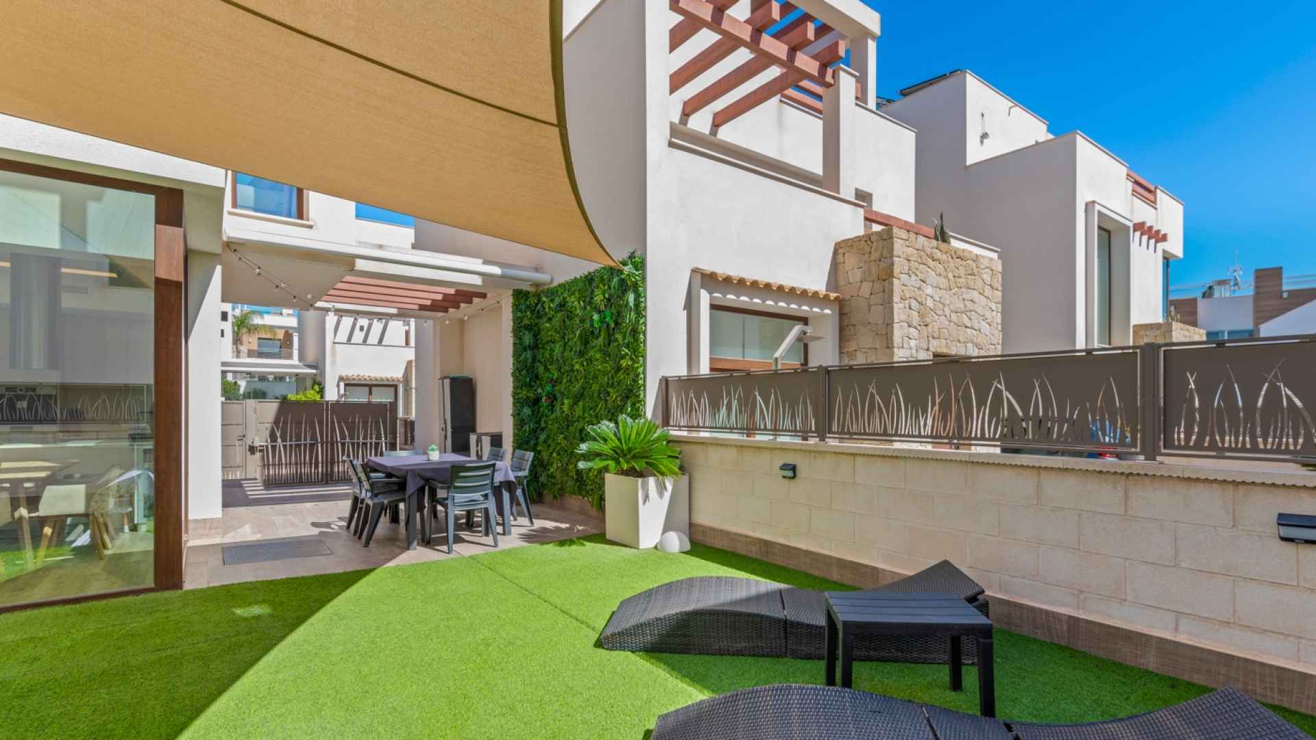 The home is equipped with an aerothermal heating and cooling system, two automatic awnings, and a solar sail for shade.