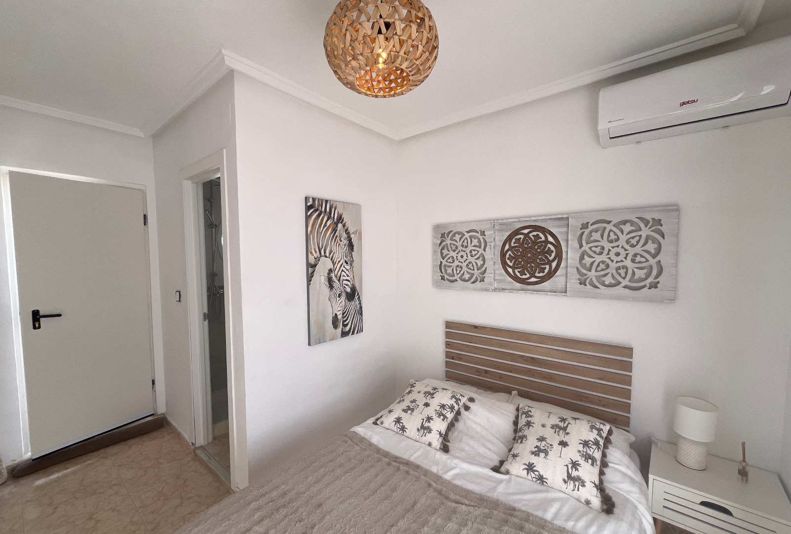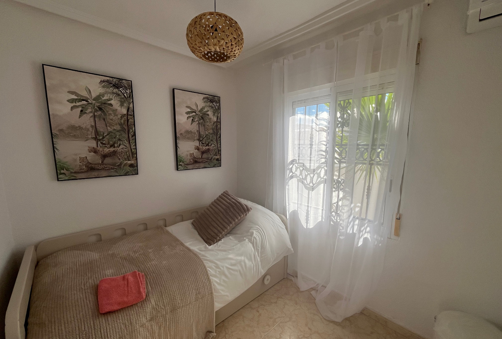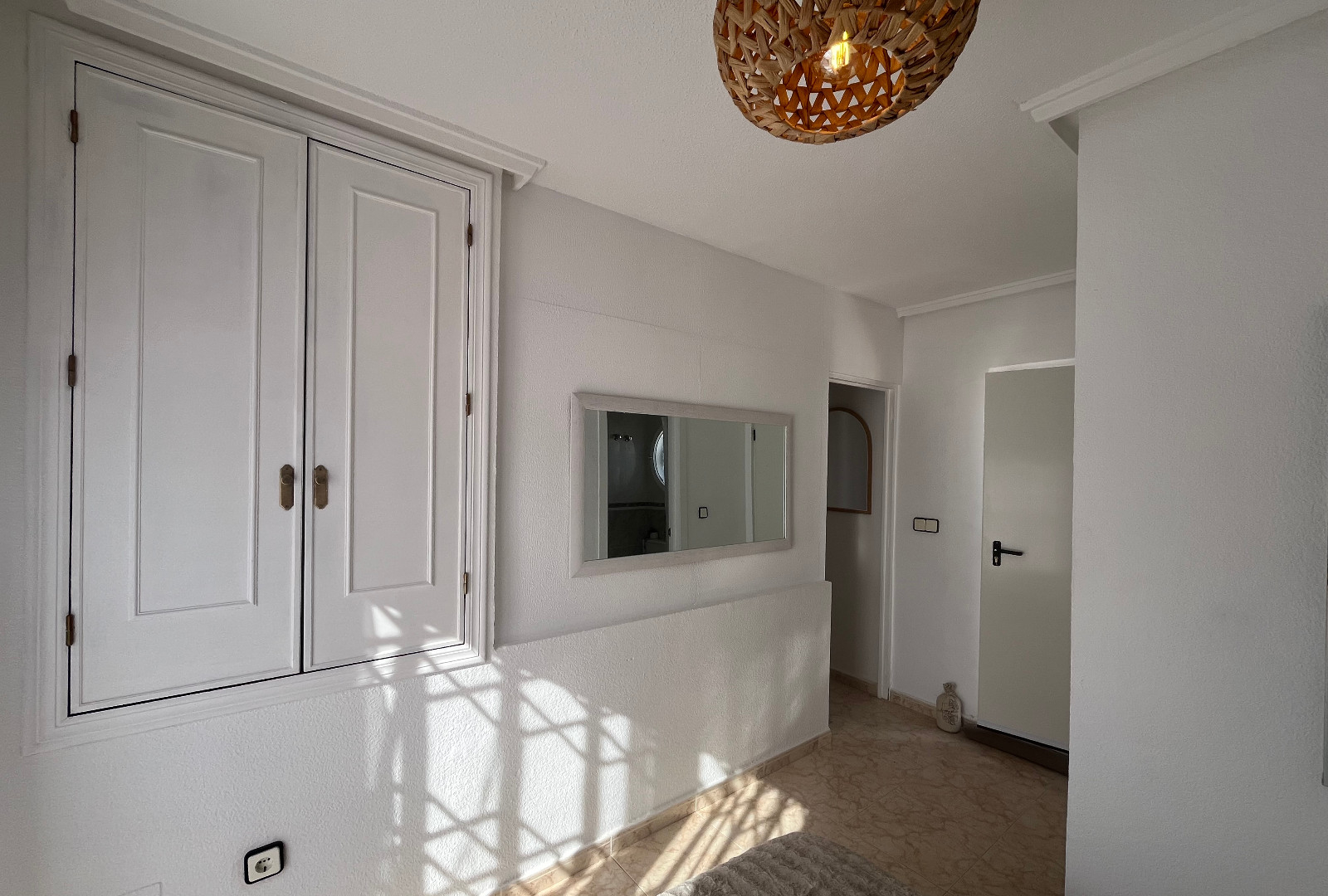 Internal stairs lead to the upper level, where you will find the main bedroom, featuring fitted wardrobes, hot and cold A/C, and access to a private sun terrace with lovely views over the communal swimming pool. This floor also includes a shower room and an additional rear door that opens directly onto the private solarium, ideal for sunbathing, relaxing, or enjoying the Mediterranean climate.