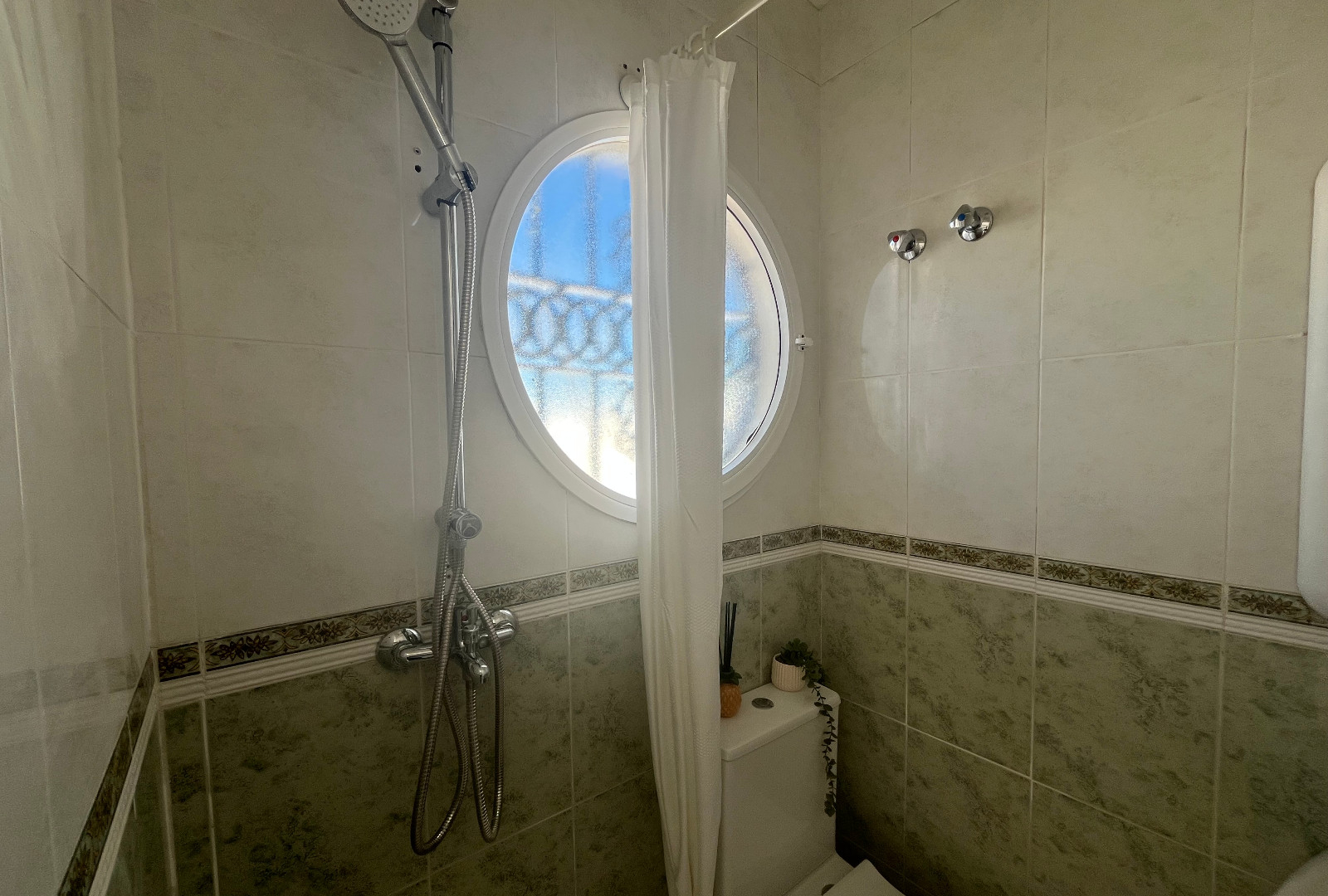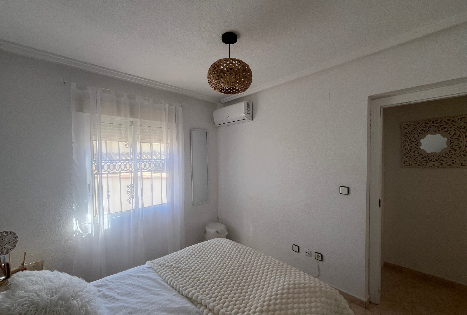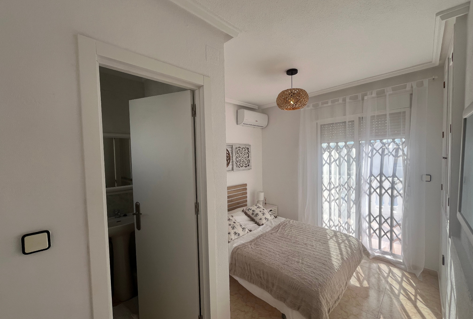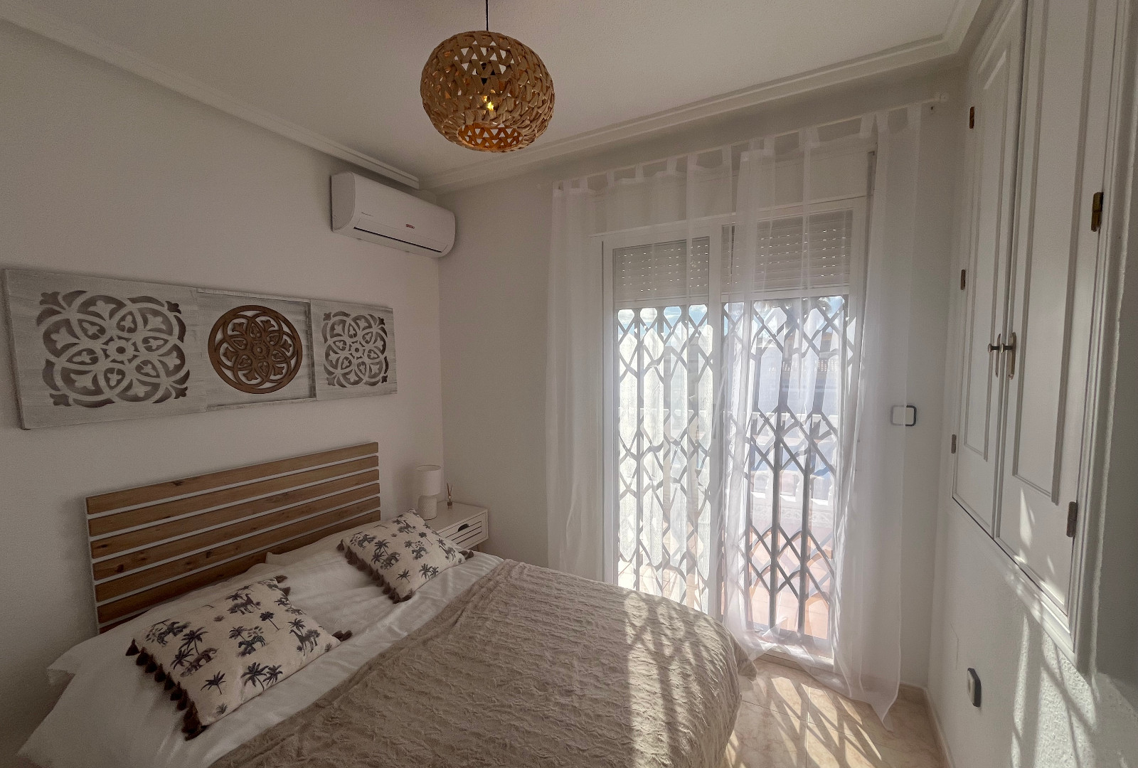 Internal stairs lead to the upper level, where you will find the main bedroom, featuring fitted wardrobes, hot and cold A/C, and access to a private sun terrace with lovely views over the communal swimming pool. This floor also includes a shower room and an additional rear door that opens directly onto the private solarium, ideal for sunbathing, relaxing, or enjoying the Mediterranean climate.