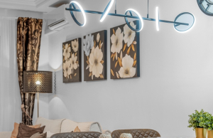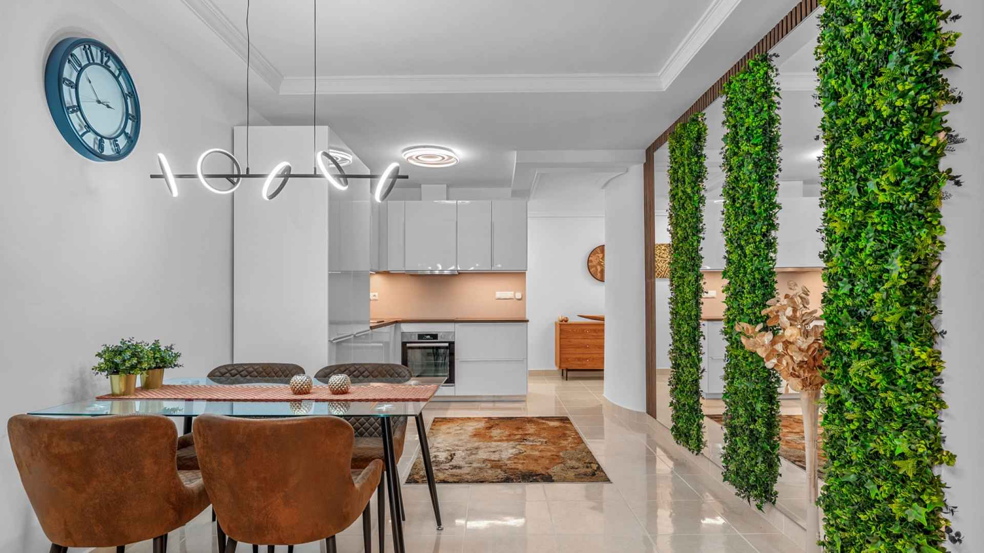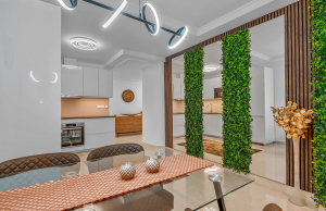 The interior is finished in a modern, minimalist style, blending elegant white tones with warm wood and touches of natural greenery.